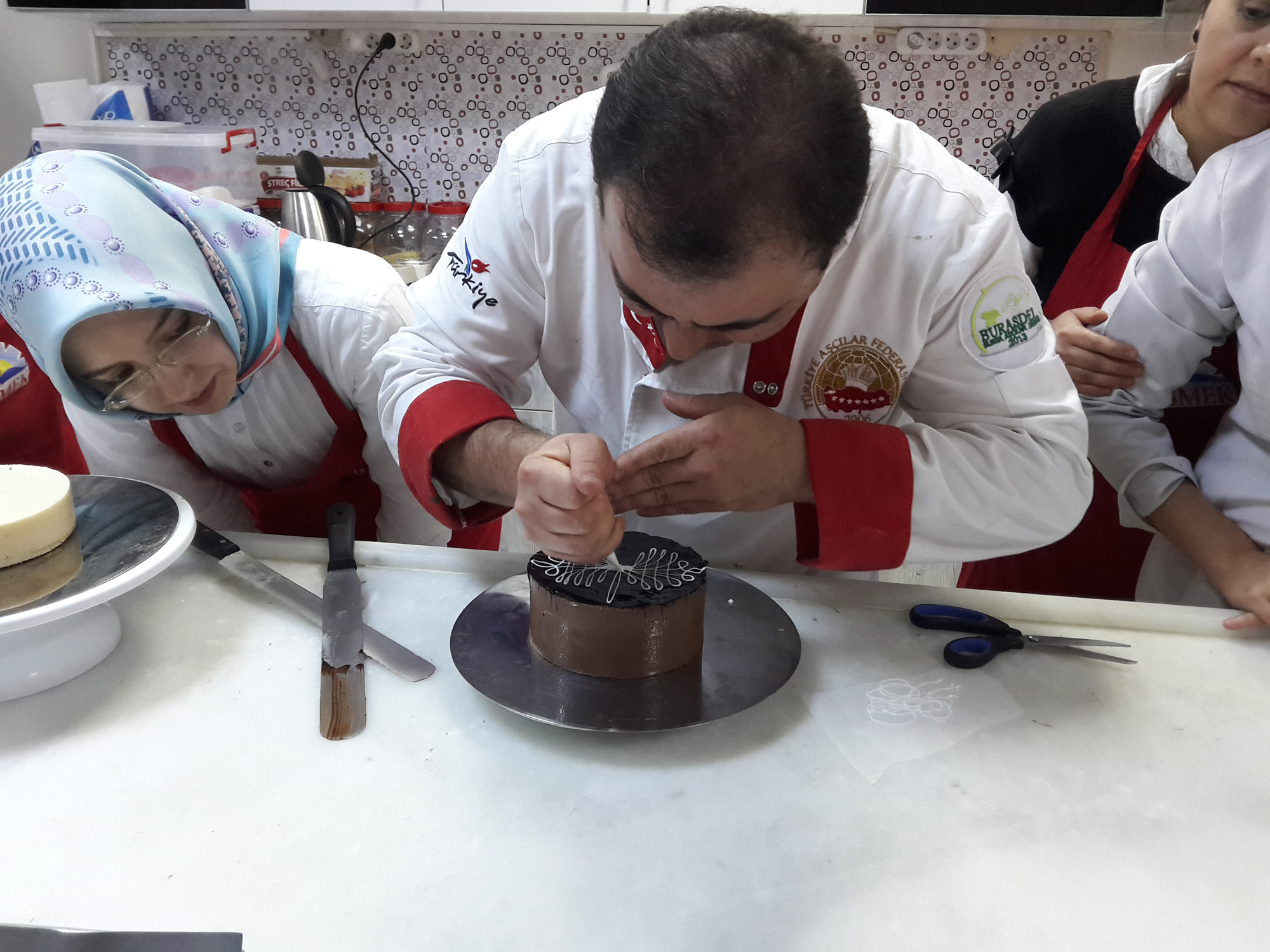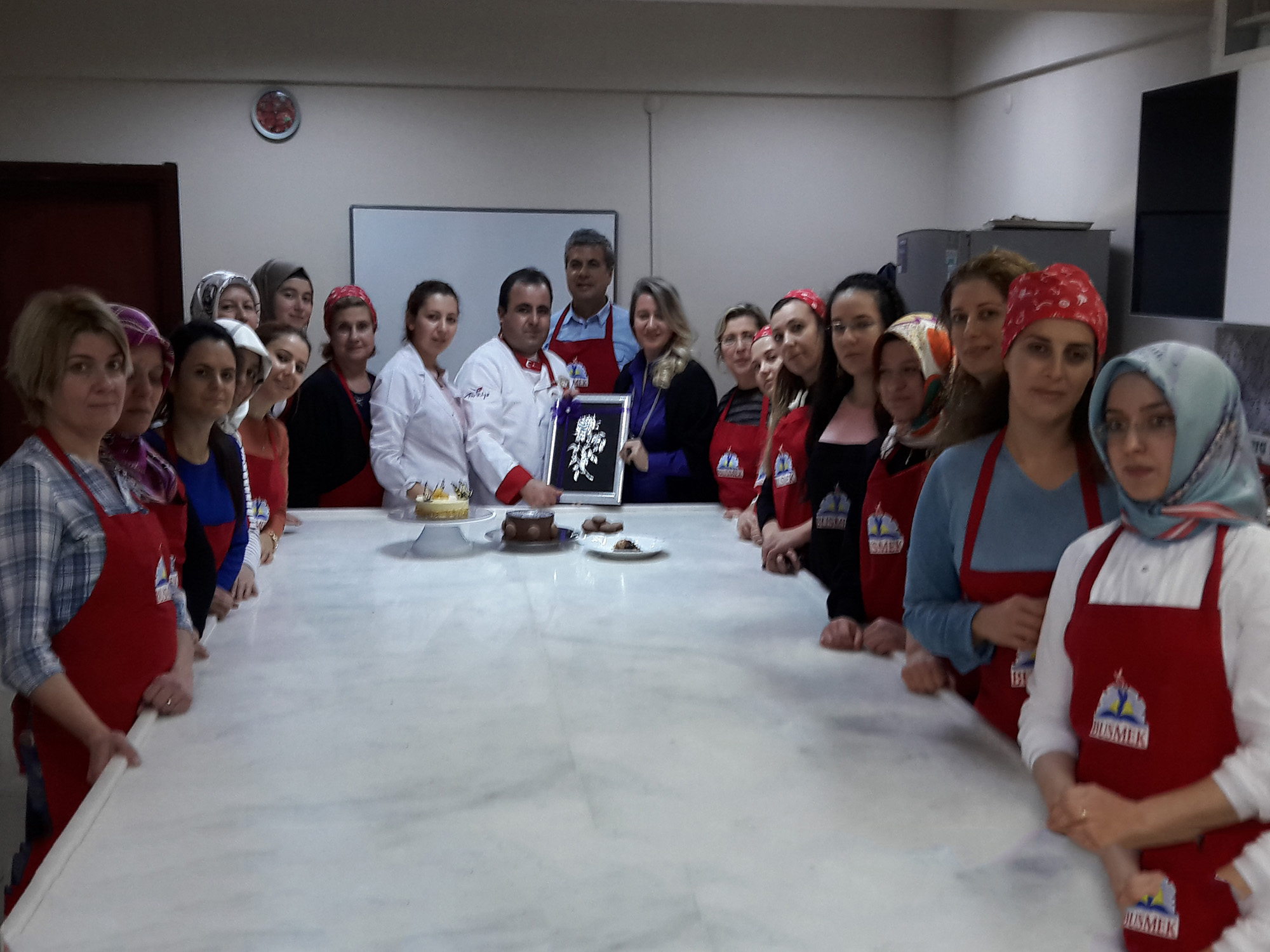 BURSA – BUSMEK Beşevler Kurs Merkezi pastacılık kursu Kervansaray Otel pasta şefi Adem Kardalı’yı ağırladı. “Pastacı çırağı” kursuna giden kursiyerlere çeşitli tatlı tarifleri ve tüyolar veren Kardalı, gün boyunca kursiyerlere eşlik etti.