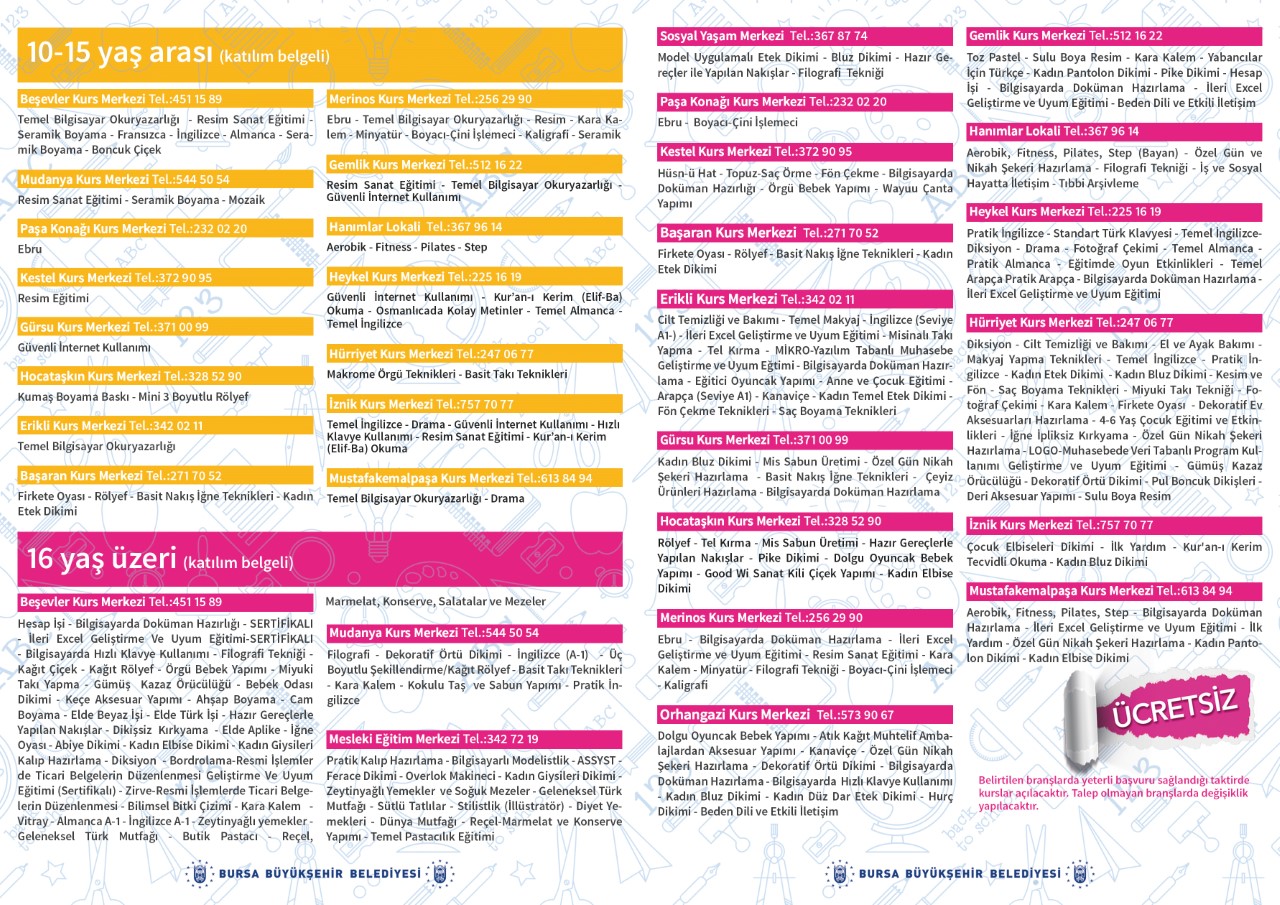 BUSMEK, 10-15 yaş grubu (çocuk) ve 16 yaş ve üzeri yetişkinlerin ayrı gruplar halinde aldığı eğitimler sayesinde yaz dönemini de dolu dolu geçiriyor. Katılımcılar bir yandan eğitim alırken diğer taraftan sosyalleşerek boş vakitlerini değerlendirme fırsatı buluyorlar. BUSMEK yaz kurslarında, 30 eğitim merkezi ve 220 branşla çocuk ve yetişkinlere eğitimler veriyor. Eğitimlerini başarıyla tamamlayan kursiyerler BUSMEK katılım belgesi veya sertifika alabilecek. Yaz kursundaki branşlar için başlayan kayıtlar 25 Temmuz Salı gününe kadar devam edecek. Kurslara katılmak isteyenler BUSMEK kurs merkezlerinden veya http://busmek.bursa.bel.tr/ adlı siteden başvuru yapabilirler.