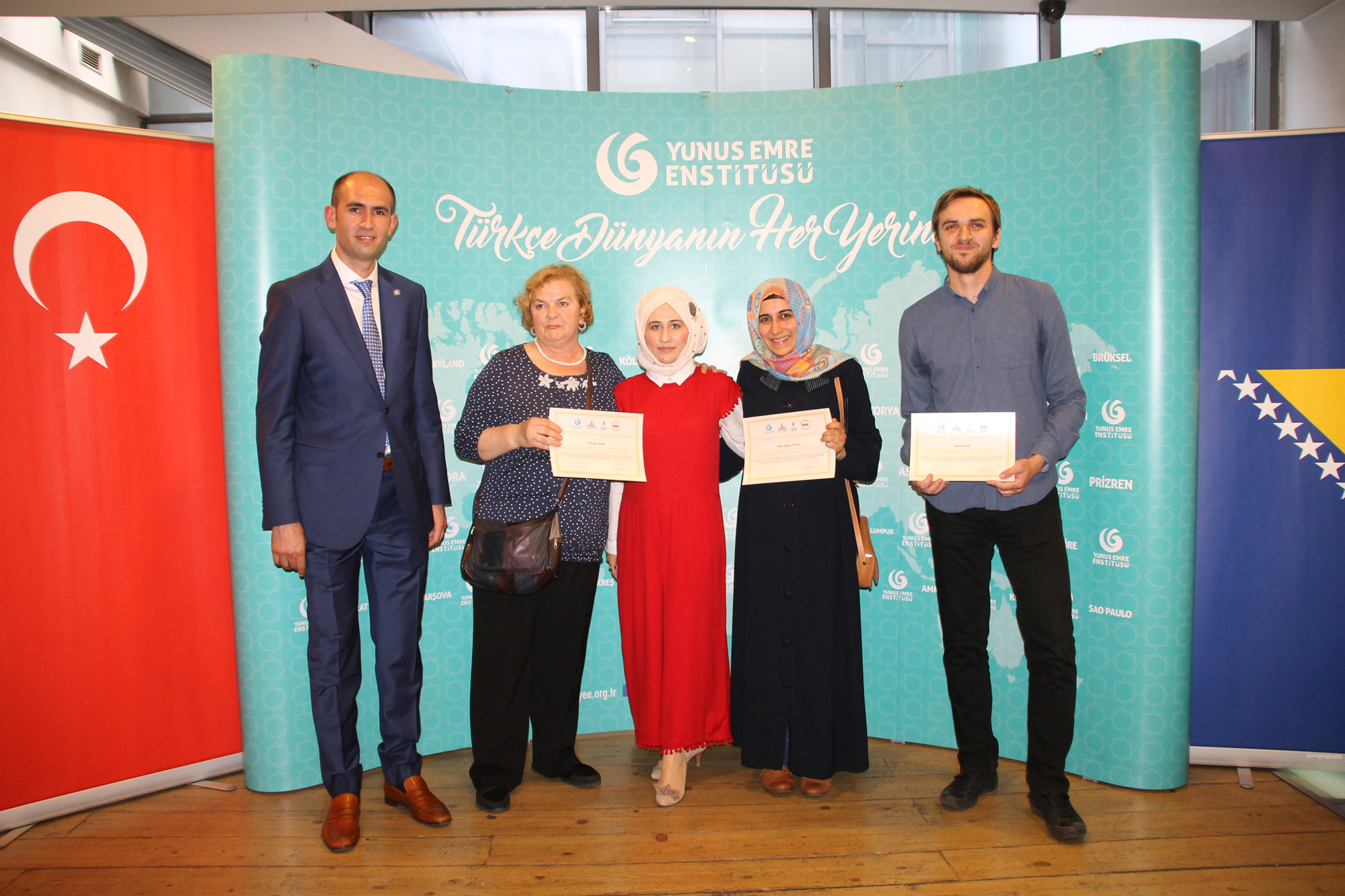 BUSMEK, yurtdışı eğitim faaliyetlerine de hız kesmeden devam ediyor. Arnavutluk ve Karadağ’dan sonra, şimdi de Bosna-Hersek Saraybosna’daki Yunus Emre Enstitüsü işbirliğiyle sağlanan eğitim çalışmaları meyvelerini vermeye başladı. 2017 yılında Saraybosna Yunus Emre Enstitüsü tarafından açılan Hüsn-i Hat, Ney, Türk yemekleri, Osmanlı Türkçesi, dikiş-nakış ve örgü gibi kursların yanı sıra BUSMEK desteği ile tezhip kursu da açılarak Bosna-Hersekliler’den yoğun ilgi gördü. 4 grup hâlinde 40 öğrencinin katılım gösterdiği kurs ilk mezunlarını verdi. Eğitimlerin ardından kursiyerlerle sertifika töreni ile hat ve tezhip sergisi gerçekleştirildi. Bursa Büyükşehir Belediyesi Sosyal Hizmetler Şube Müdürü Sedat Okumuş ve BUSMEK Proje Yöneticisi Eyüp Arda kursiyerlere sertifikalarını vererek başarılarının devamını diledi. Saraybosna Yunus Emre Enstitüsü yetkililerine de hediyeler verilen programda katılımcılar, tezhip sergisini ilgiyle gezdi.