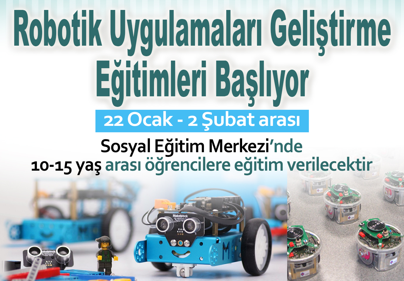 Bursa Büyükşehir Belediyesi’nin en önemli sosyal sorumluluk projelerinden olan, 7’den 70’e toplumun tüm kesimlerini kapsayan eğitimleri nedeniyle ‘Halk Üniversitesi’ olarak anılan BUSMEK, eğitim alanlarına robotik uygulamaları da ekledi. Bursa’nın farklı noktalarında kaliteli ve ücretsiz eğitimler vererek, unutulmaya yüz tutmuş geleneksel el sanatlarını yaşatmayı ilke edinen BUSMEK, teknoloji çağına uyak uyduracak nesiller yetiştirilmesi amacıyla robotik uygulama eğitimlerini başlatıyor. Yakın gelecekte robotların hayatımızda daha fazla yer edineceği gerçeğinden hareket eden BUSMEK, 22 Ocak – 02 Şubat 2018 tarihleri arasındaki sömestri tatilinde 10-15 yaş aralığındaki öğrencilere yönelik robotik eğitimler verecek.