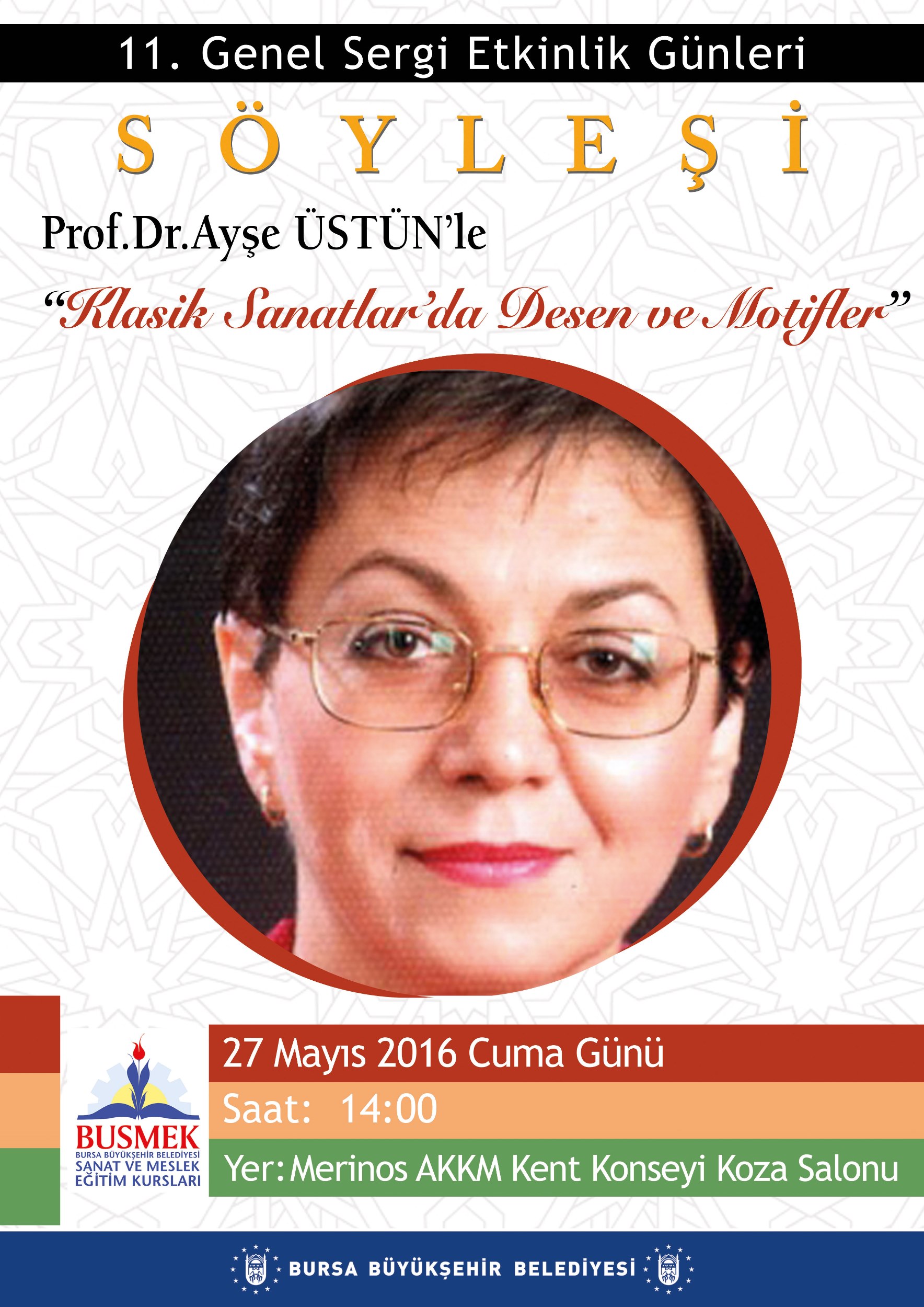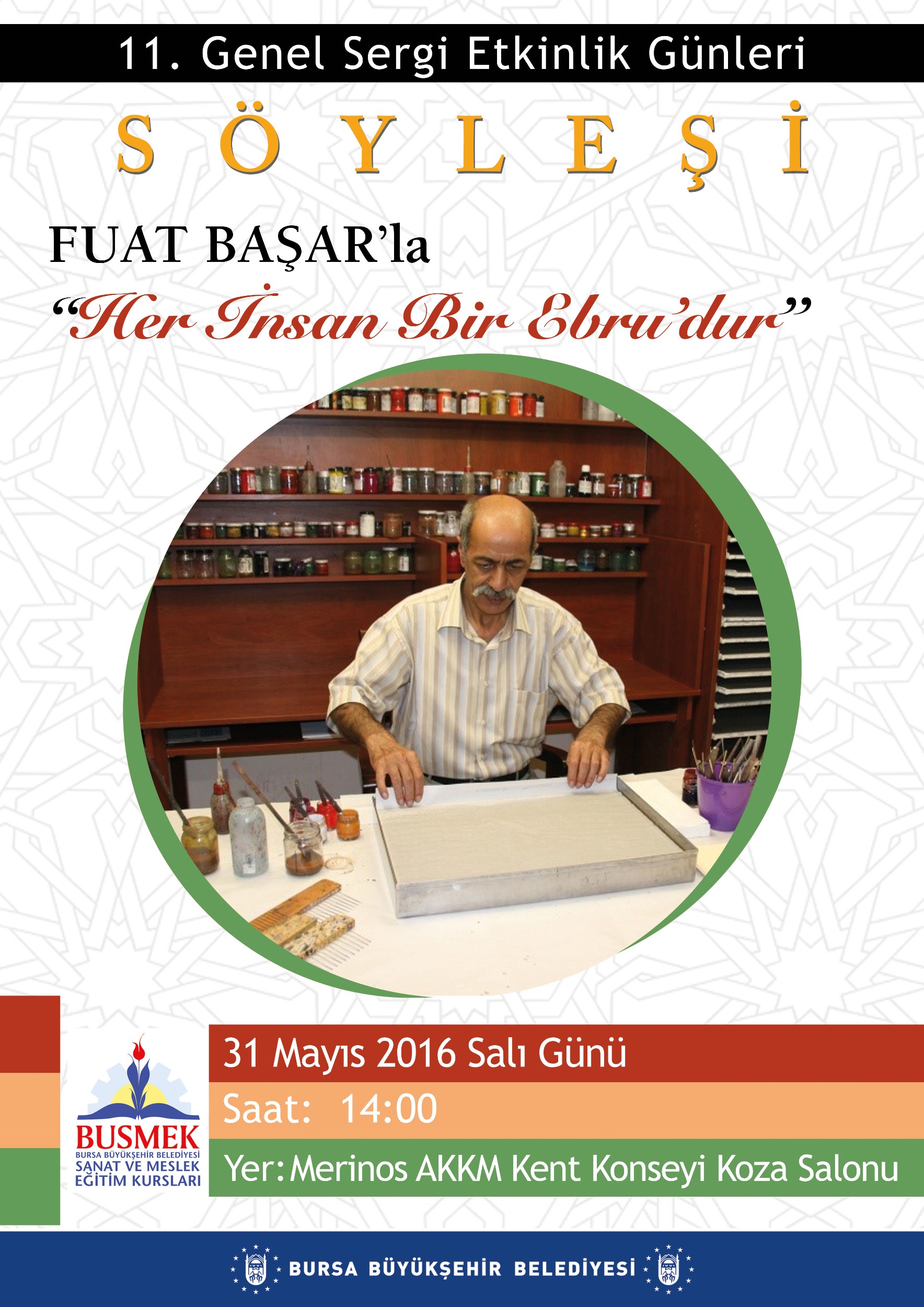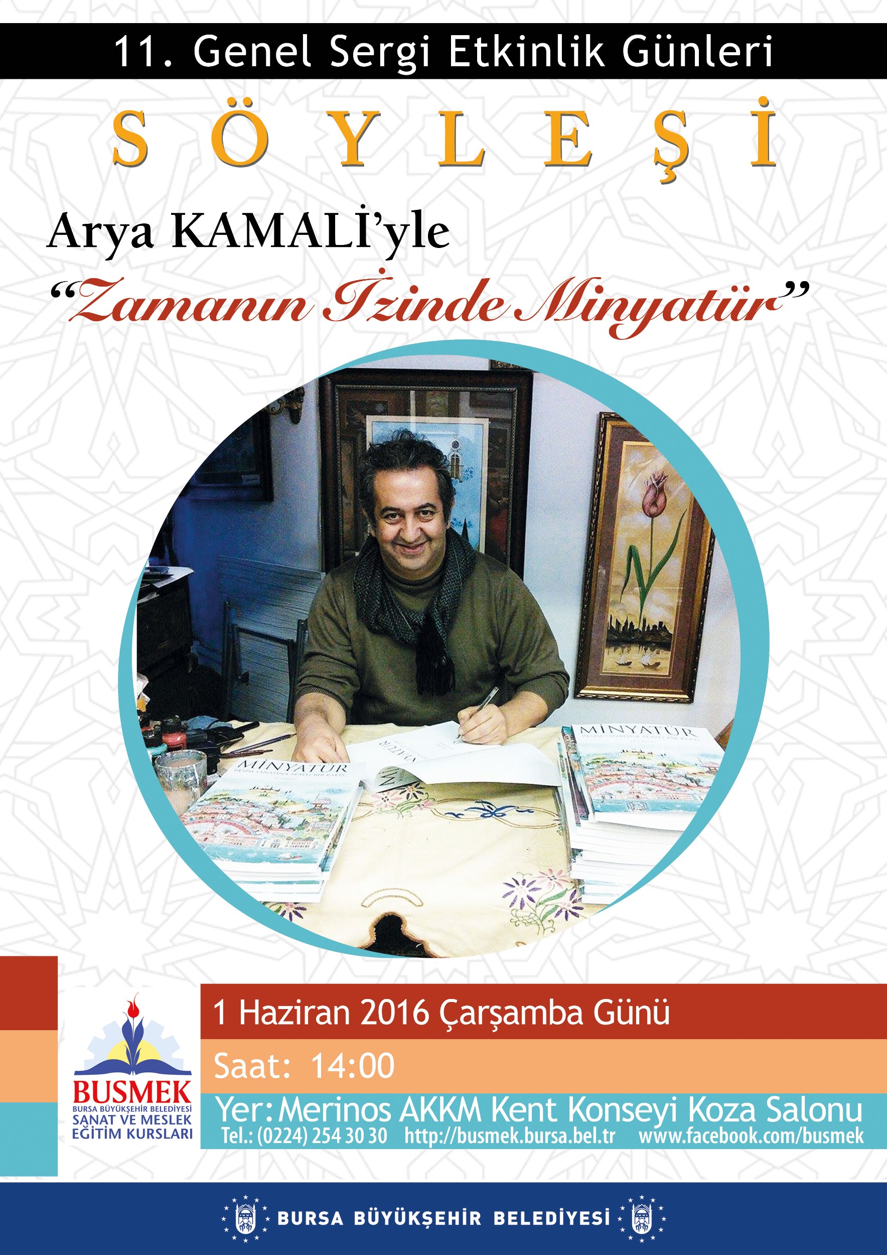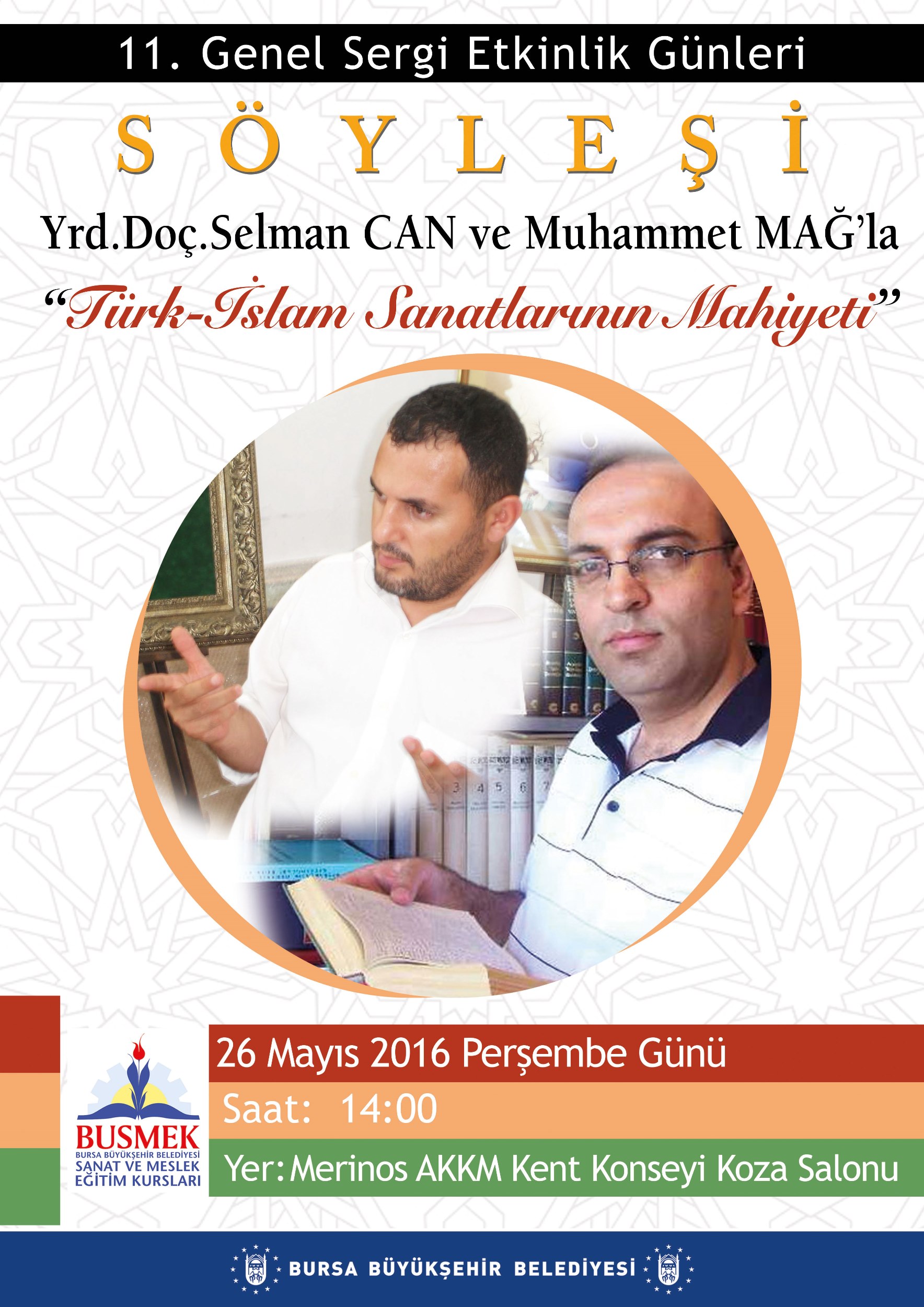 Sergi kapsamında aynı zamanda Merinos AKKM’deki Bursa Kent Konseyi Koza salonunda da uzman isimlerin söyleşileri de yer alacak. 26 Mayıs Perşembe günü saat 14.00’da Yrd. Doç. Selman Can ve Muhammet Mağ’ın ‘Türk-İslam Sanatlarının Mahiyeti’, 27 Mayıs Cuma günü saat 14.00’da Prof. Dr. Ayşe Üstün’ün ‘Klasik Sanatlarda Desen ve Motifler’, 30 Mayıs Pazartesi günü saat 14.00’da Mahmut Şahin’in ‘Aşk ile bir dahi: Hüsn-i Hat’, 31 Mayıs Salı günü saat 14.00’da Fuat Başar’ın ‘Her İnsan Bir Ebrudur’ ve 1 Haziran Çarşamba günü de saat 14.00’da Arya Kamali’nin ‘Zamanın İzinde Minyatür’ adlı söyleşileri gerçekleştirilecek.