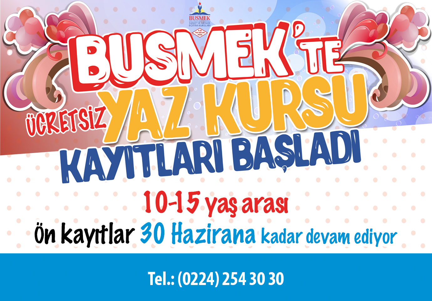 BUSMEK, 10-15 yaş arası çocuklara ve gençlere yönelik düzenlediği yaz eğitimleriyle de çocukların yüzlerini güldürüyor. BUSMEK, çocukların fiziksel ve ruhsal yönden gelişimlerine katkı sağlamak, onları farklı el sanatlarıyla buluşturarak boş zamanlarını verimli geçirmeleri amacıyla her yıl düzenlenen yaz kursunun kayıtları da başladı. Çocuklara yönelik organize edilen kurslar, BUSMEK eğitmenlerince verilecek. Basit takı tekniklerinden ahşap oyuncak boyamaya, bilgisayar kullanımından dramaya, İngilizceden resim dersine kadar geniş yelpazede eğitimler, çocuklarla buluşacak. Çocuklar için düzenlenen kurslara kayıtlar da online olarak ve kurs merkezlerine giderek yapılabilecek.