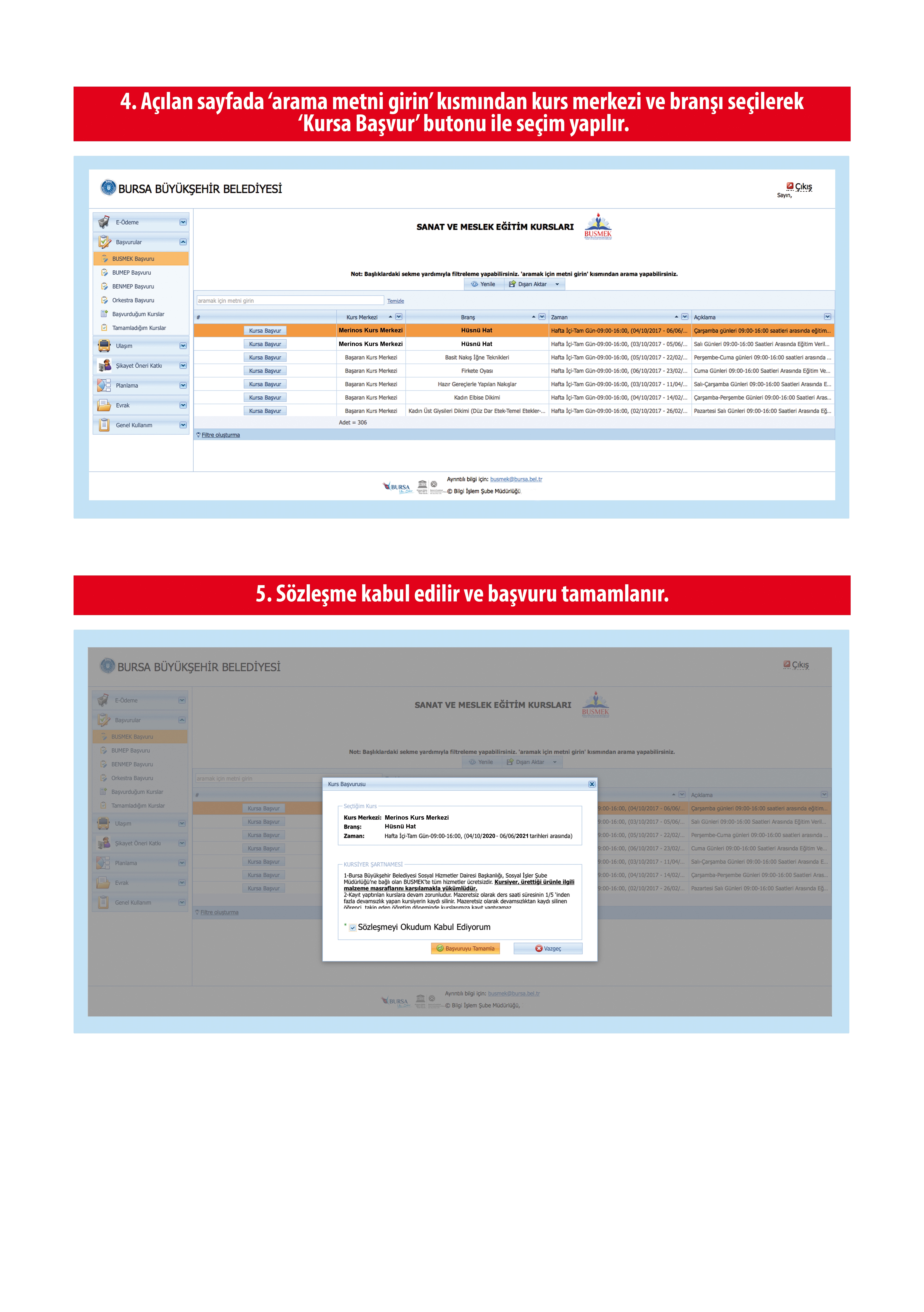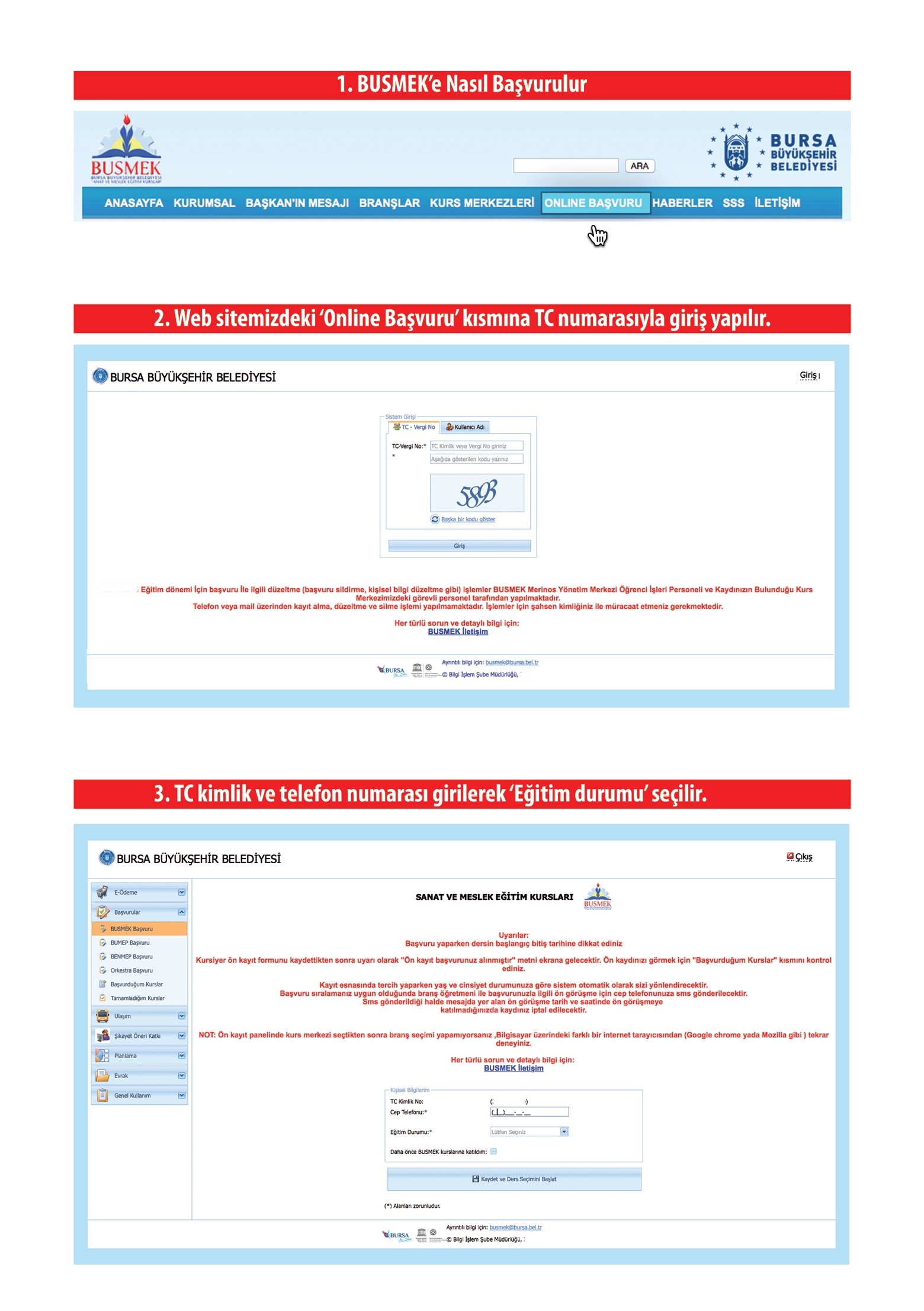 Kurs merkezlerine kayıt yaptırmak isteyen kursiyer adayları busmek.bursa.bel.tr adresindeki “Online Başvuru” kısmına tıklayarak başvuru yapabilirler. Ya da Android tabanlı mobil uygulamayı cep telefonlarına indirebilir ve uygulama içerisinde yer alan “Online Başvuru” bölümünden ön kayıtlarını yapabilirler.