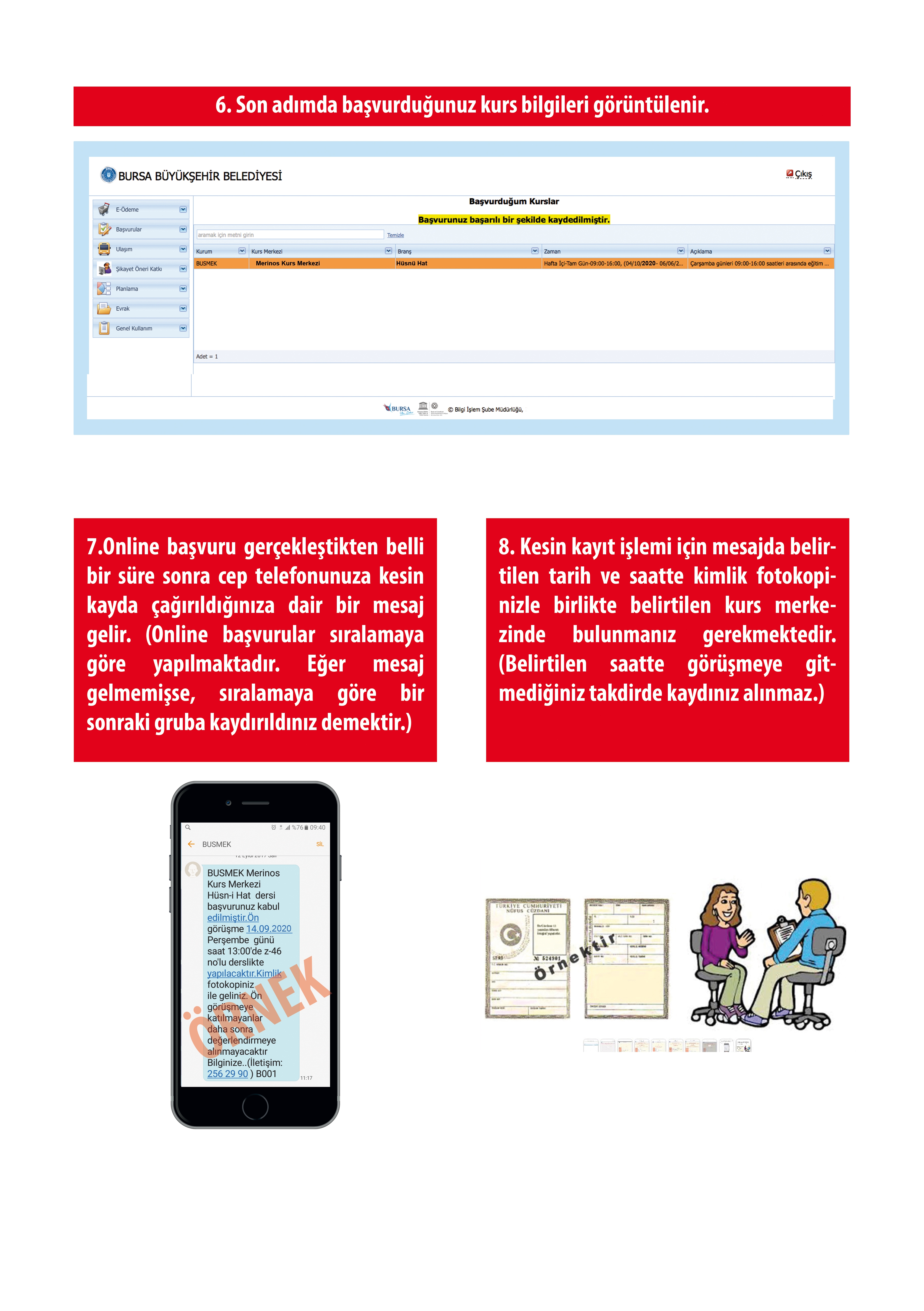 Sistem; kursiyerleri, başvuru yaptıkları tarih ve saate göre otomatik olarak sıralar. Sırası gelen kursiyere mesaj gönderilerek kurs merkezlerine ön görüşme için çağırılır. Telefonunuza gelen kısa mesajın ardından kimlik fotokopinizle birlikte kayıt yaptırdığınız kurs merkezine gelip kaydınızı tamamlamanız gerekmektedir.