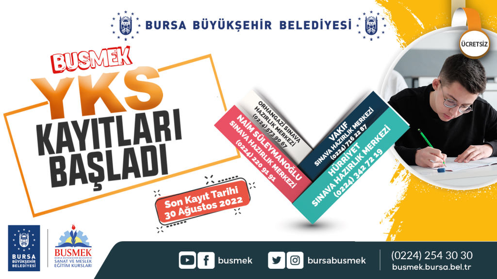 Ücretsiz YKS hazırlık kurslarına ön kayıt yaptırmak isteyen öğrenciler, busmek.bursa.bel.tr adresinden online başvuru yapabilecek.