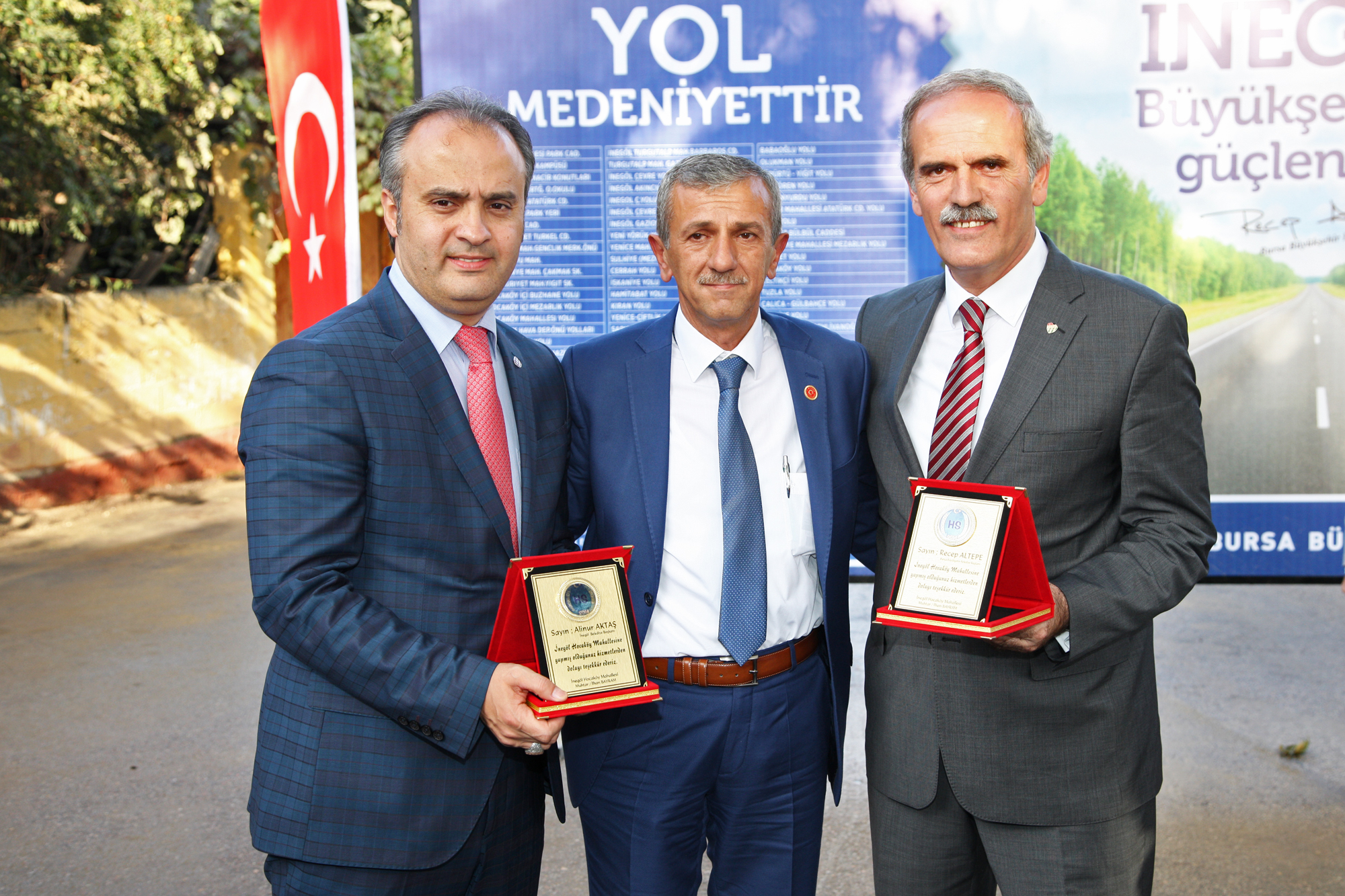 Büyükşehir Belediye Başkanı Recep Altepe, Hocaköy’de düzenlenen toplu yol açılışı töreninde yaptığı konuşmada Bütünşehir yasasının avantajlarının uygulamalarla görülmeye başlandığını hatırlattı. Yasa çıkmadan önceki yıl Özel İdare’nin Bursa’nın 17 ilçesinde köy yolları için yaptığı yatırımın 7 milyon TL olduğunu hatırlatan Başkan Altepe, son bir yıl içinde sadece İnegöl’de yaptıkları yol yatırımının 18 milyon TL’yi bulduğunu ve bu yatırımların hala devam ettiğini vurguladı. Eskiden ilçe belediye başkanlarının bile köylere en ufak bir yatırım yapmasının kanunen yasak olduğunu ifade eden Başkan Altepe, “Yerel yönetimlerin sorunlarını en iyi bilen Cumhurbaşkanımız sayesinde yerelde yetkiler arttı. ‘Bütünşehir olunca ne olacak’ deniyordu. İşte olan ortada. Büyükşehir de burada, İnegöl Belediyesi de burada çalışıyor. Özel İdarenin bütün Bursa’ya yaptığı yatırımın iki katından fazlasını sadece İnegöl’e yaptık. Büyük bütçeli yatırımlar ilçelerle, kırsal kesimle buluşmaya başladı. Merkezde ne varsa ilçelerde ve en ücra mahallelerde de olacak dedik. İşte yeni yollar, spor tesisleri, sosyal donatı alanları, bunların yanında kırsal kalkınma yatırımları hepsi ortada. Çiftçimizi her alanda destekliyoruz. Daha kaliteli üretim için sulama göletleri yapıyoruz, ürün toplama merkezleri kuruyoruz, ekipman desteği sağlıyoruz. Çiftçimizin geliri artsın diye her türlü desteği yapıyoruz. Bunlar daha başlangıç. İnegöl için daha yapacak çok işimiz var. Öncelikli sorunları gündemimize alıp, bir bir hayata geçiriyoruz” diye konuştu.