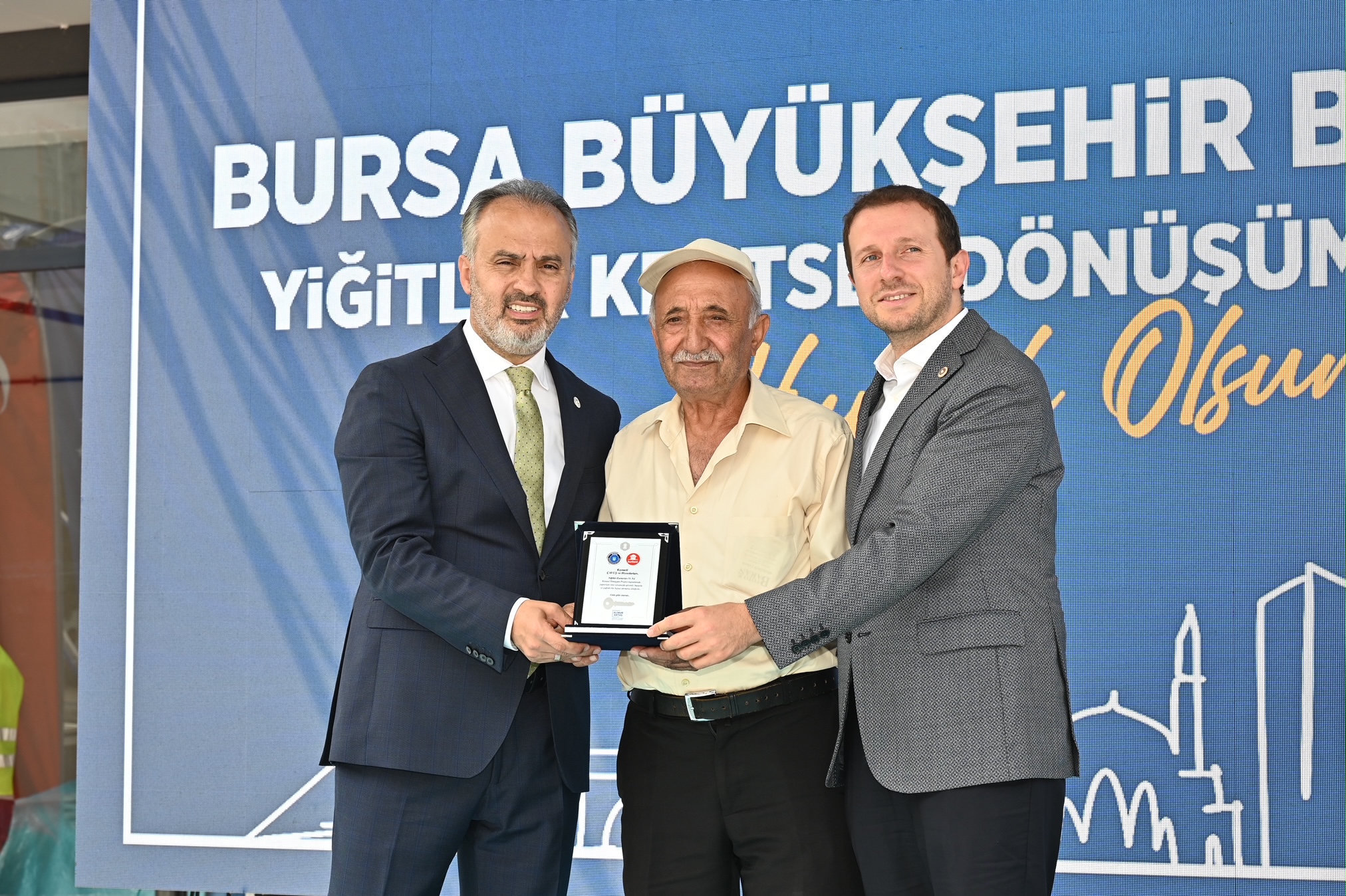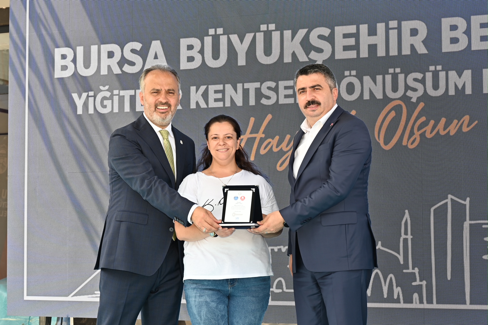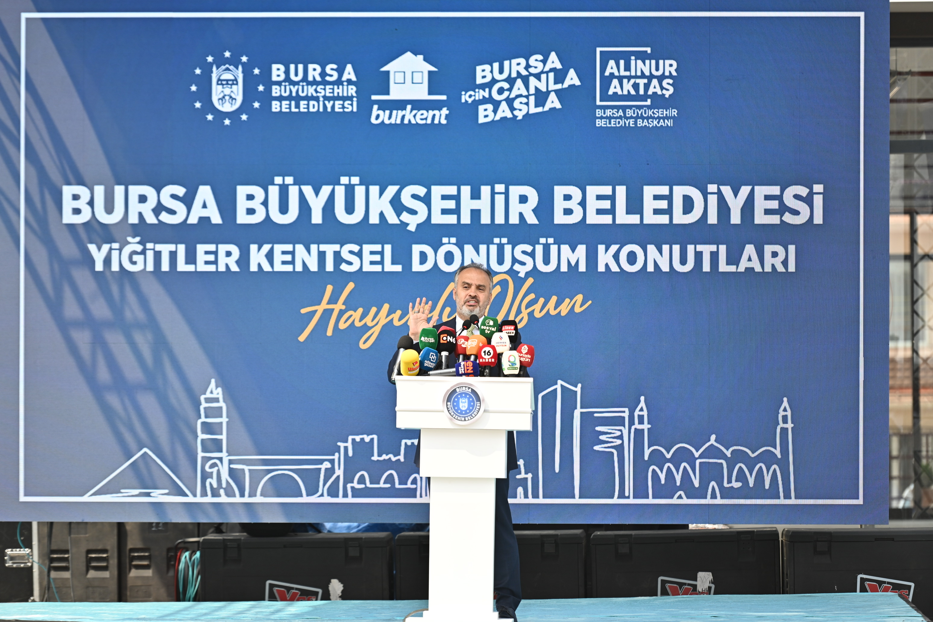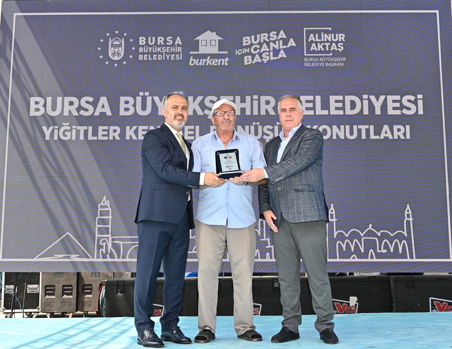 BURSA – Bursa’nın depreme karşı dirençli kent haline getirilmesi amacıyla 7 ayrı bölgede kentsel dönüşüm projelerini kesintisiz sürdüren Büyükşehir Belediyesi, Yiğitler Kentsel Dönüşümü’nde ilk konutları düzenlenen törenle hak sahiplerine teslim etti. Kentsel dönüşüm çalışmalarının artık kartopundan çığa dönüştüğünü belirten Büyükşehir Belediye Başkanı Alinur Aktaş, “Değirmenönü’nde, Karapınar’da, Ulus’ta, Arabayatağı’nda, Beşyol’da, İstanbul Caddesi’nde, Gaziakdemir’de, Sıcaksu’da, 1050 Konutlar’da dönüşüm var. Allah’ın izniyle Altıparmak’ta da olacak” dedi.
