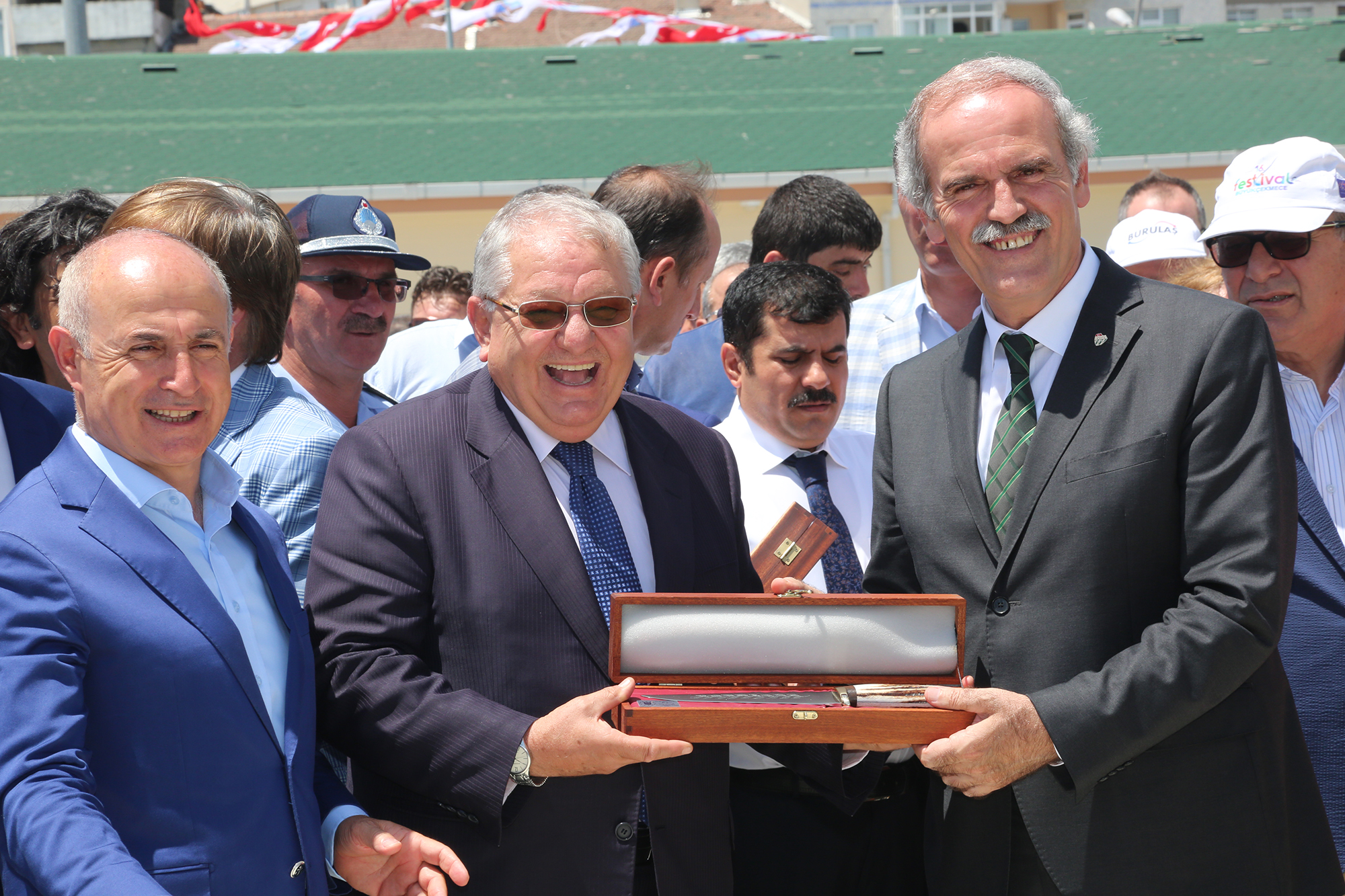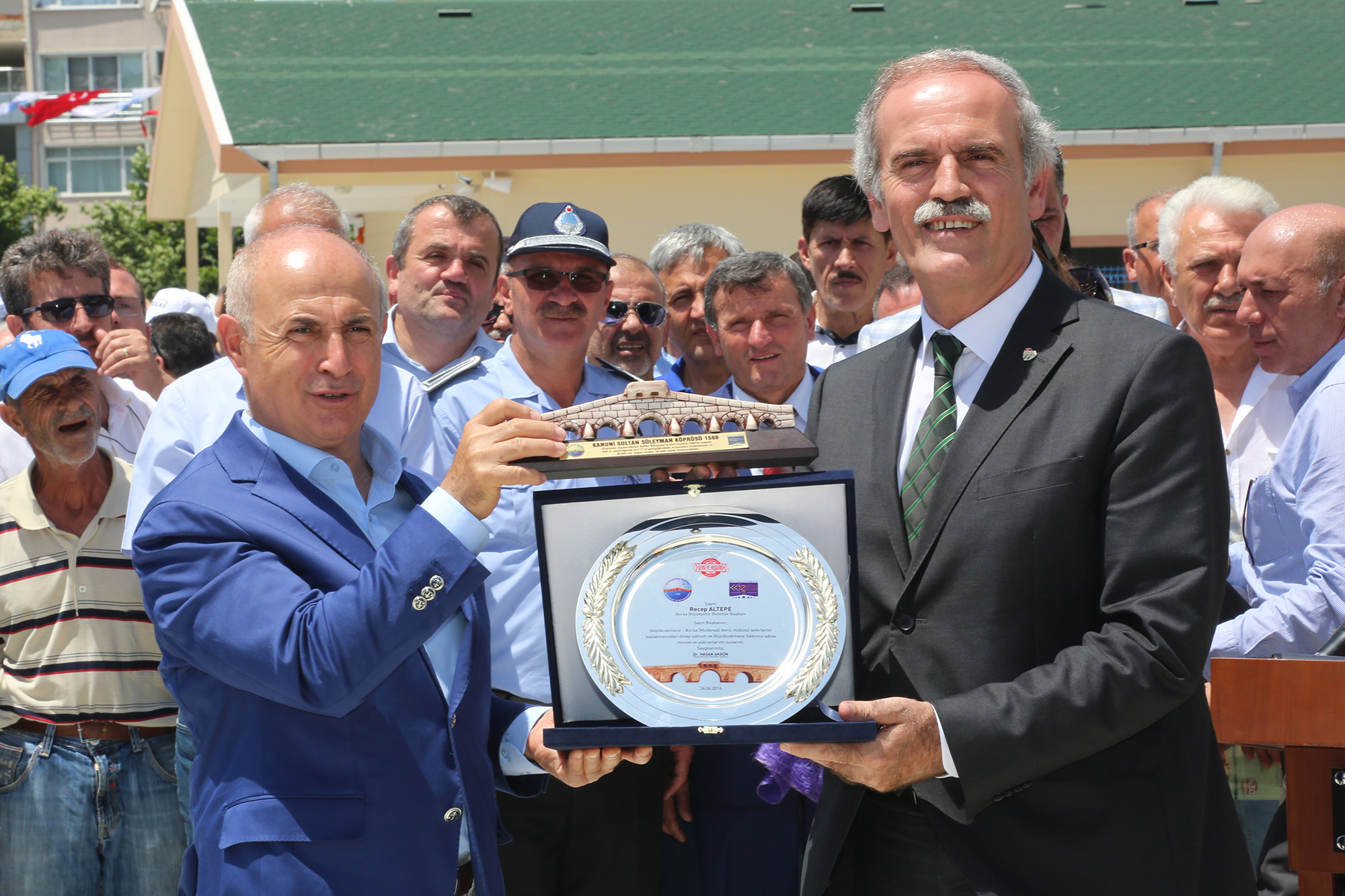 Konuşmaların ardından Büyükçekmece Belediye Başkanı Hasan Akgün Başkan Altepe’ye günün anısına ilçenin sembolü olan Kanuni Sultan Süleyman Köprüsü’nün maketini hediye ederken, Başkan Altepe de Akgün’e Bursa bıçağı verdi.