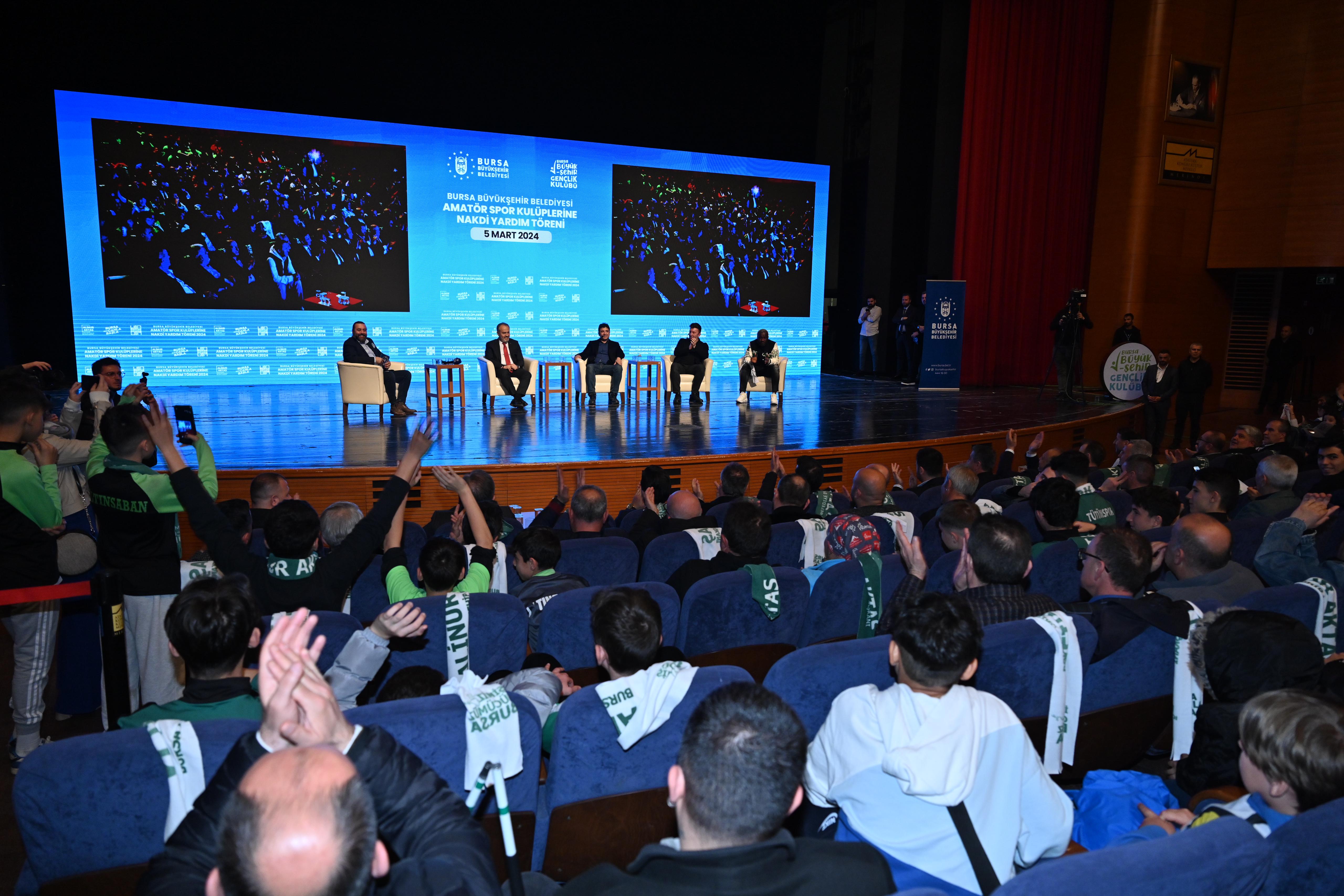 Bursa’nın spor şehri özelliğinin güçlenmesi ve her gencin en az bir spor dalıyla ilgilenmesi amacıyla birçok projeyi hayata geçiren Büyükşehir Belediyesi, amatör spor kulüplerini desteklemeye devam ediyor. 2018 yılında 177 amatör futbol kulübüne toplam 1 milyon 100 bin TL, 2018-2019 ve 2019-2020 futbol sezonları için 240 amatör spor kulübünün liglere katılım ücreti olarak 298 bin TL, 2021-2022 futbol sezonları için 2,5 milyon TL, 2023 yılında ise 520 spor kulübüne toplam 4,5 milyon TL’lik nakdi destek sağlayan Bursa Büyükşehir Belediyesi, şimdi de 533 amatör spor kulübüne toplam 8 milyon TL nakdi yardım yaptı. Kulüpler bu desteği, spor sahası kazandırılması, malzeme desteği sağlanması ve spora teşvik amacıyla kullanabilecek. Atatürk Kongre ve Kültür Merkezi’ndeki amatör spor kulüplerine destek töreni, ‘Futbolun Yıldızları Bursa’da söyleşisiyle başladı. Moderatörlüğünü Spor Yazarı Emre Bol’un yaptığı söyleşiye, eski milli futbolcular Oktay Derelioğlu ve Evren Turhan ile eski futbolcu İbrahim Yattara katıldı. Futbol kariyerleri boyunca yaşadıkları güzel anıları gençlerle paylaşan futbolcular, sporla ilgilenen gençlere tavsiyelerde de bulundu.