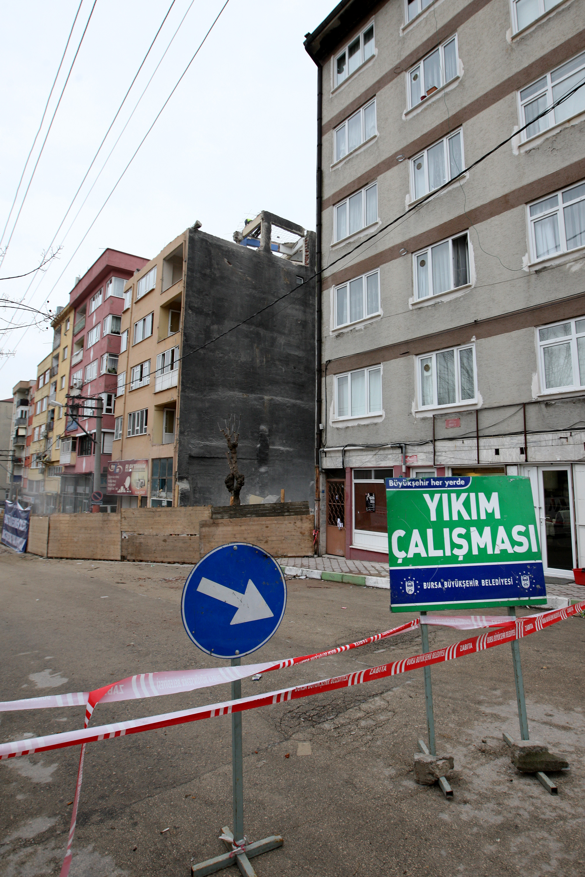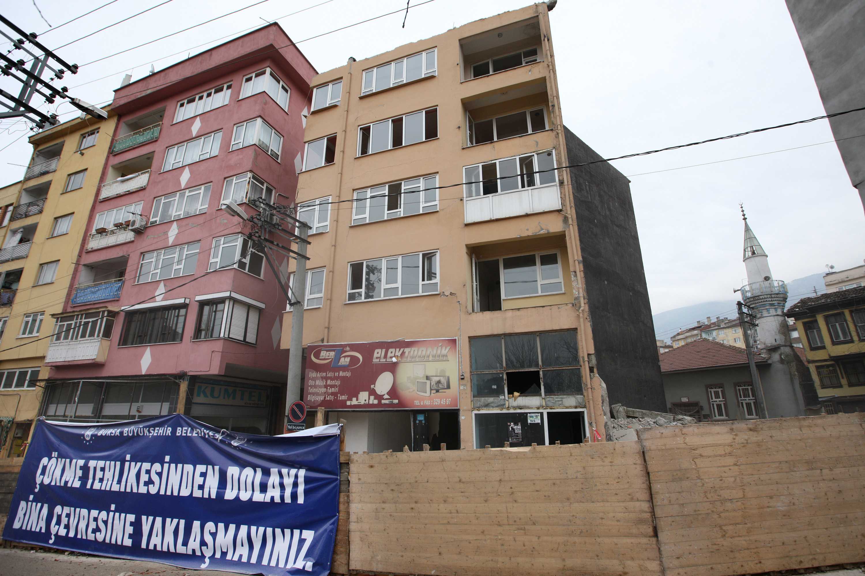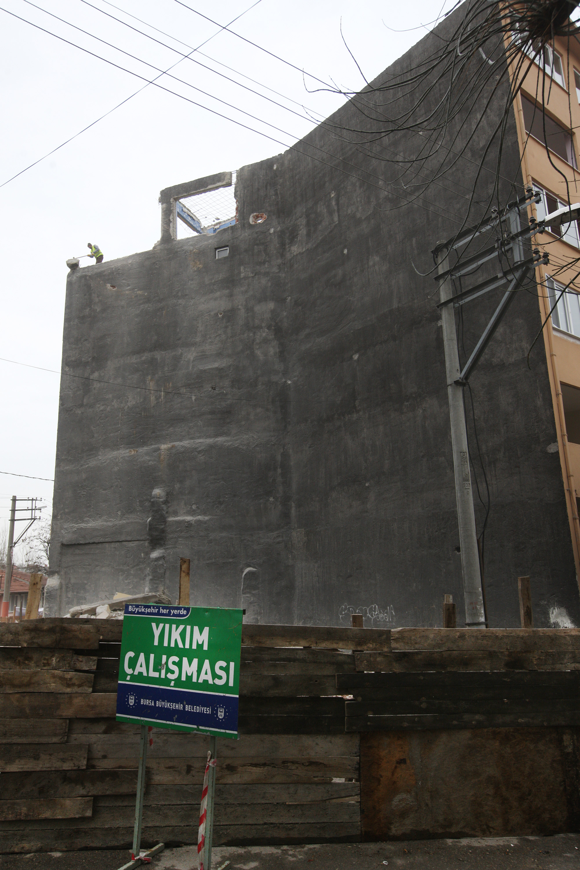 BURSA – Büyükşehir Belediyesi kolonlarında meydana gelen hasar yüzünden çökme tehlikesi bulunduğu için daha önce boşalttığı Kurtuluş Caddesi girişindeki 7 katlı binanın yıkım çalışmalarını başlattı.