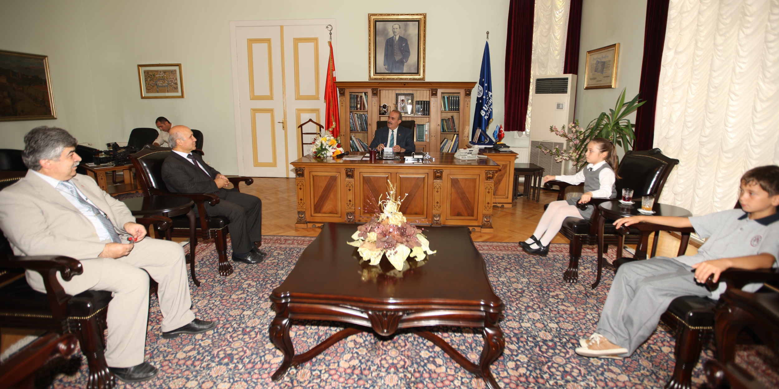 Büyükşehir Belediyesi Başkanvekili ve Genel Sekreter Yardımcısı Necmettin Şenocak, tarihi belediye binasında gerçekleştirilen görüşmelerde önce Atatürk İlköğretim Okulu Müdür Yardımcısı Mustafa Alkan ve Sınıf Öğretmeni Ali Osman Bayramoğlu ile öğrenciler Ayşe Gökçe Güler ve Kaan Yavuz’u ağırladı. ‘İlköğretim Haftası’ etkinlikleri kapsamında Büyükşehir Belediye Başkanvekili Necmettin Şenocak’ı ziyaret eden heyet, yeni eğitim ve öğretim yılında okullarında yapılacak çalışmalarla ihtiyaçlarını anlattı.
