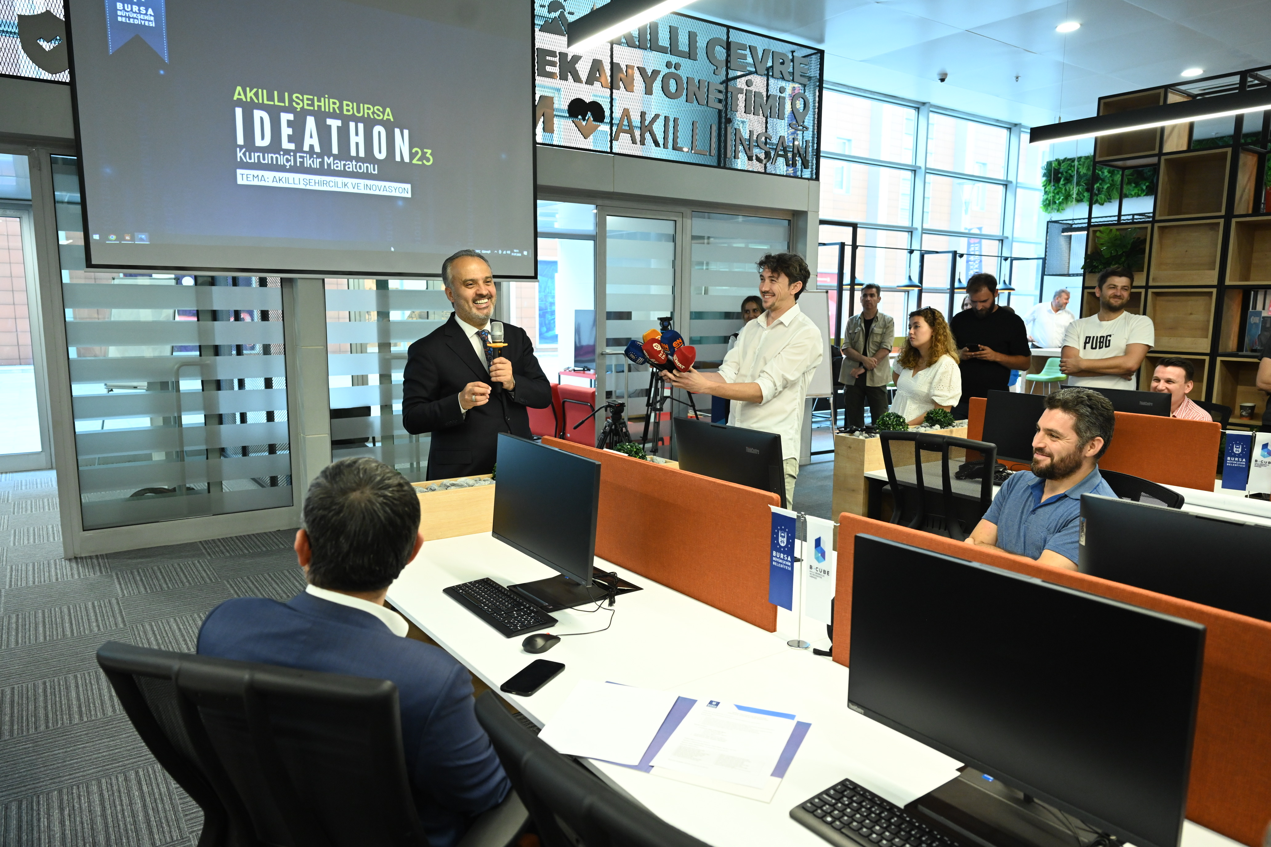 Merinos Atatürk Kongre ve Kültür Merkezi B-Cube Akıllı Şehircilik ve İnovasyon Merkezi’nde düzenlenen ödül törenine Bursa Büyükşehir Belediye Başkanı Alinur Aktaş, Büyükşehir Belediyesi Meclis Üyeleri ve yarışmaya katılan takım üyeleri katıldı. Ödül töreninde konuşan Başkan Alinur Aktaş, “Kurum içinden farklı birimlerden görev yapan çalışma arkadaşlarımızın bir araya gelerek yeni fikirler ortaya çıkarması ve projeler üretmesi belediyemizin ve şehrimizin gelişimine oldukça katkı sağlıyor. Geleceğe dair hayallerinizin ve projelerinizin önünde hiçbir engel yok. Bu yaratıcı ruhu sürekli destekleyeceğimizi ve gelecekte de benzer etkinliklerle bir araya gelmeye devam edeceğimizi taahhüt ediyorum” dedi. Büyükşehir Belediye Başkanı Alinur Aktaş, yarışan diğer projeleri de uygulanabilirliği doğrultusunda hayata geçirmek istediklerini belirtti.