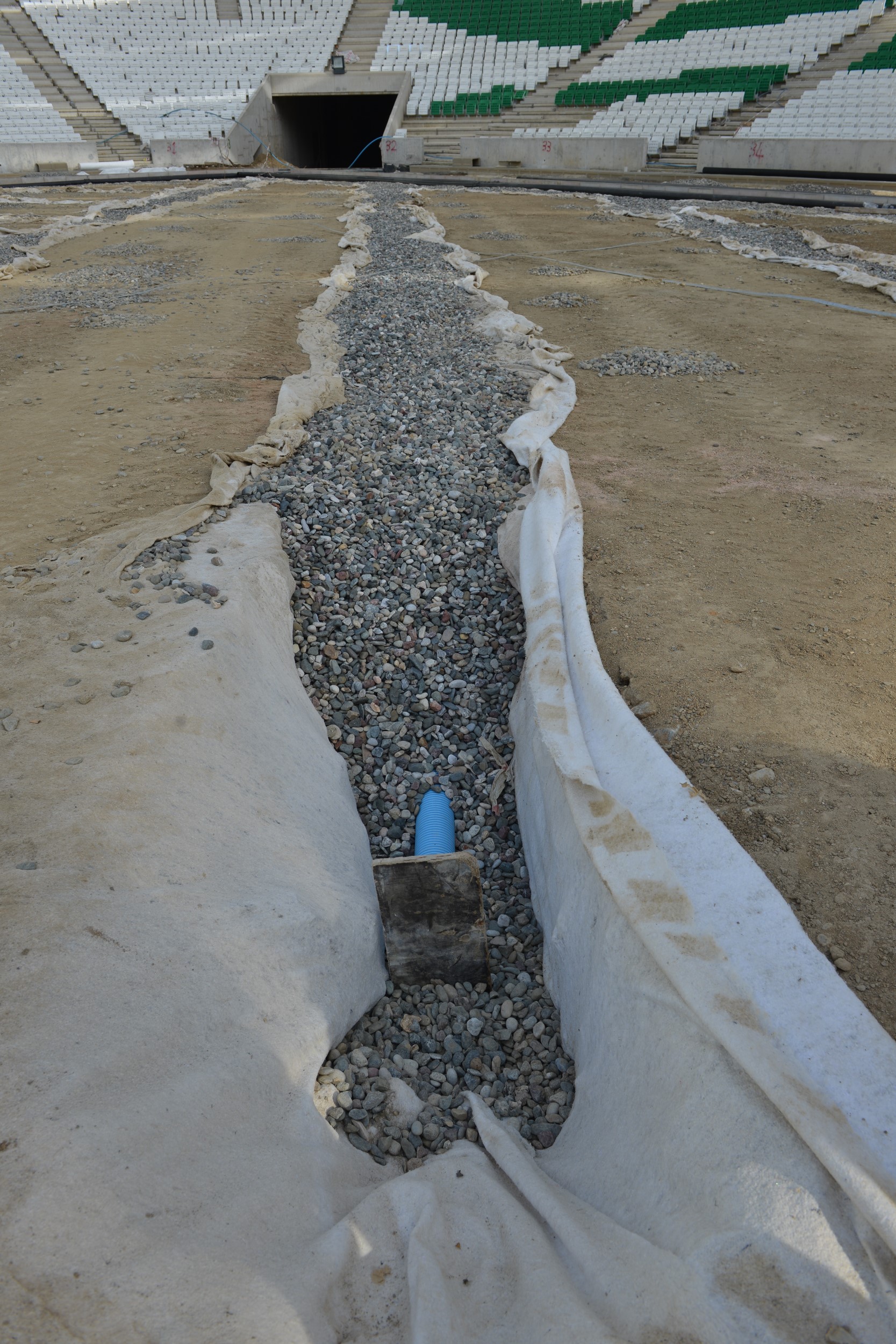 Havaların ısınmasıyla çalışma temposunun da arttığını anlatan Başkan Altepe, “Stadyumda çatıdan ve tribünlerden saha içine kadar tüm montajlar hızlı bir şekilde devam ediyor. Bir yandan tribün ve seyirci koltuklarının montajı, protokol tribünleri, localardaki montajlar hızlı bir şekilde tamamlanırken, bir yandan da sahanın çalışması başladı. Sahanın zemininde hızlı bir drenaj çalışması var. En yoğun yağışlı hava şartlarında bile maçların kaliteli şekilde oynanması hedefiyle, kaliteli bir zemin elde edilmesi için, daha önce Atatürk Stadı’nda uygulanan sistem gibi aynı şekilde, güzel bir drenaj sistemi yapılıyor. Her 5 metrede açılan kanallar, hatların montajları yapıldıktan sonra kapatılıyor” diyerek drenajla birlikte giderlerin Nilüfer Çayı’na bağlandığını belirtti.