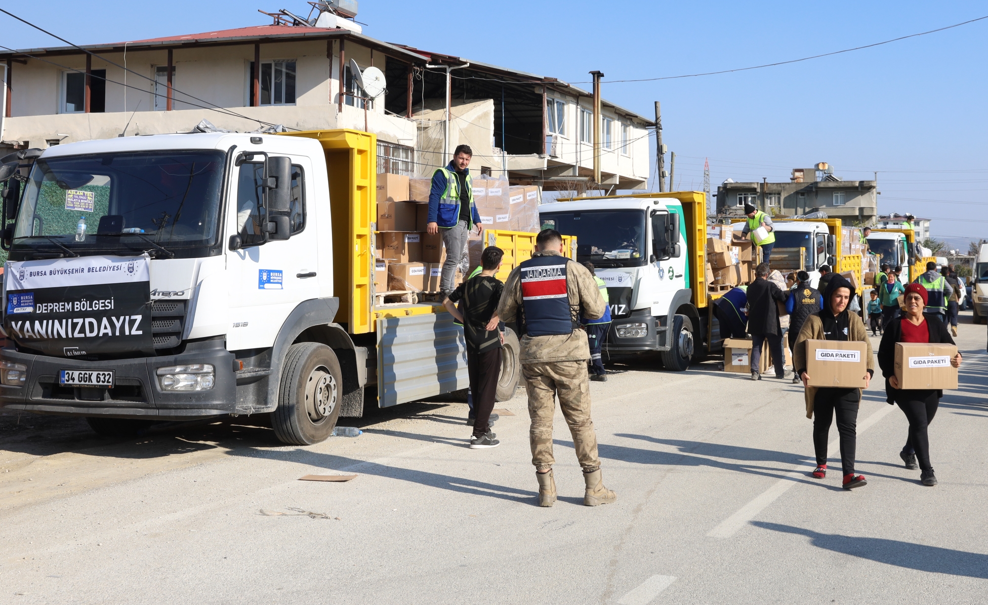 HATAY – Türkiye genelinden hava ve kara yolu ile gelen tüm yardım malzemelerinin Hatay’da ihtiyaç sahiplerine ulaştırılması görevini üstlenen Bursa Büyükşehir Belediyesi, Antakya ilçesinin Karaali Mahallesi’nde de depremzedelerin yüzünü güldürdü.