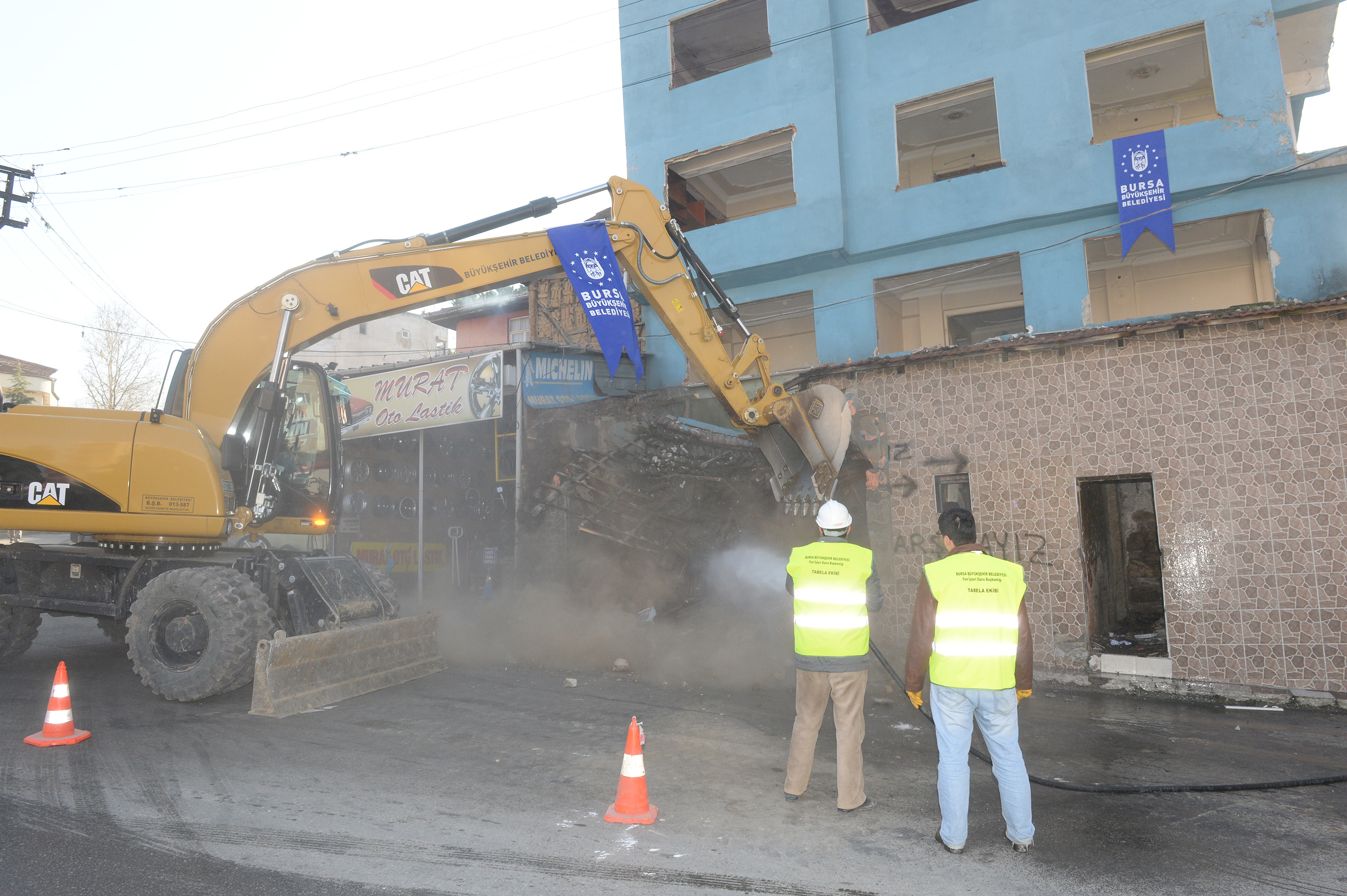 BURSA - Raylı sistem ve yeni yolların açılmasının yanında mevcut yolları genişleterek ulaşımı sorun olmaktan çıkarmayı hedefleyen Bursa Büyükşehir Belediyesi, yıllardır konuşulan ancak bugüne kadar somut bir adım atılamayan Yıldırım’daki Dağyolu Caddesi’nin genişletilmesi çalışmaları kapsamında birinci etapta kamulaştırılan son binanın yıkımını da başlattı.