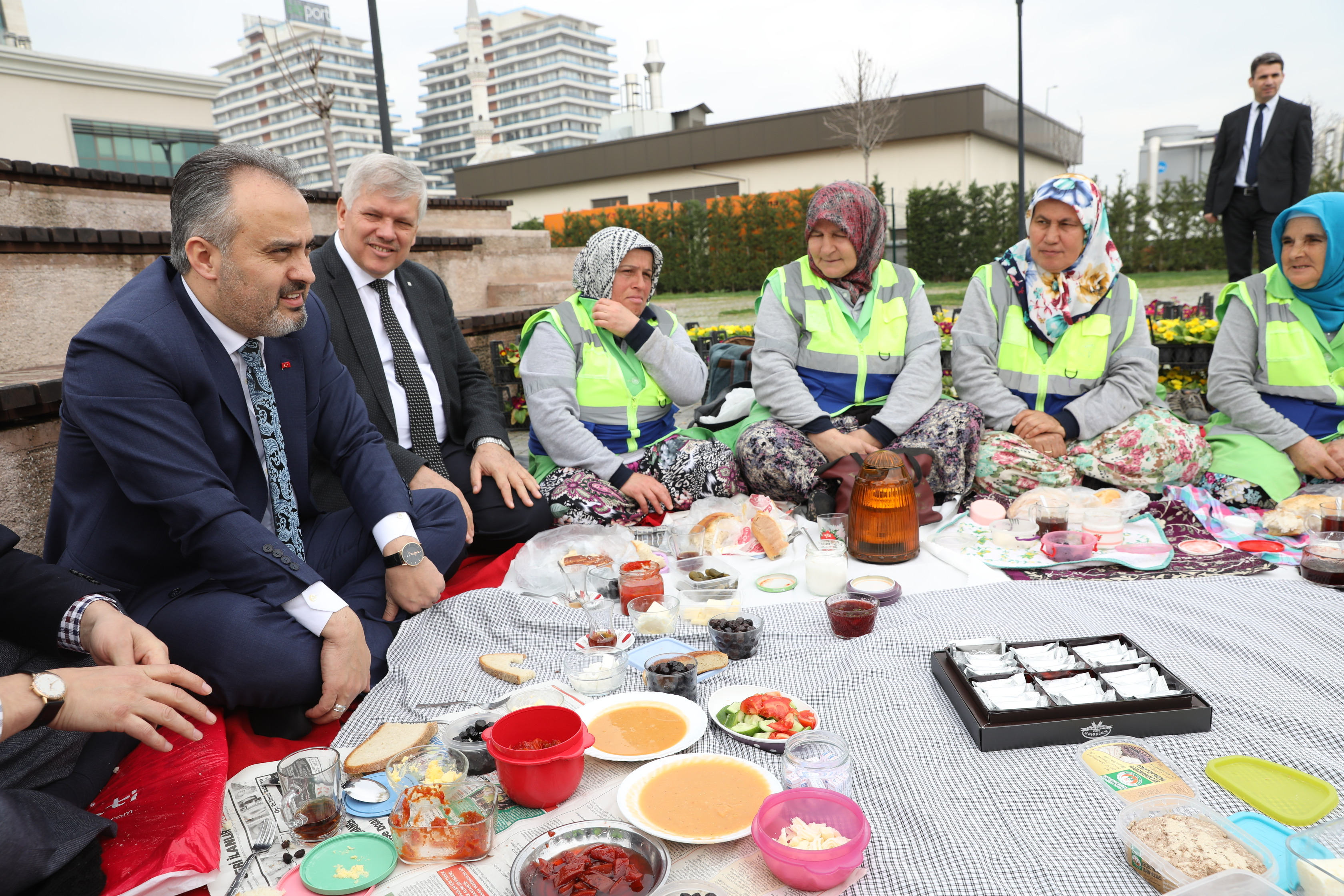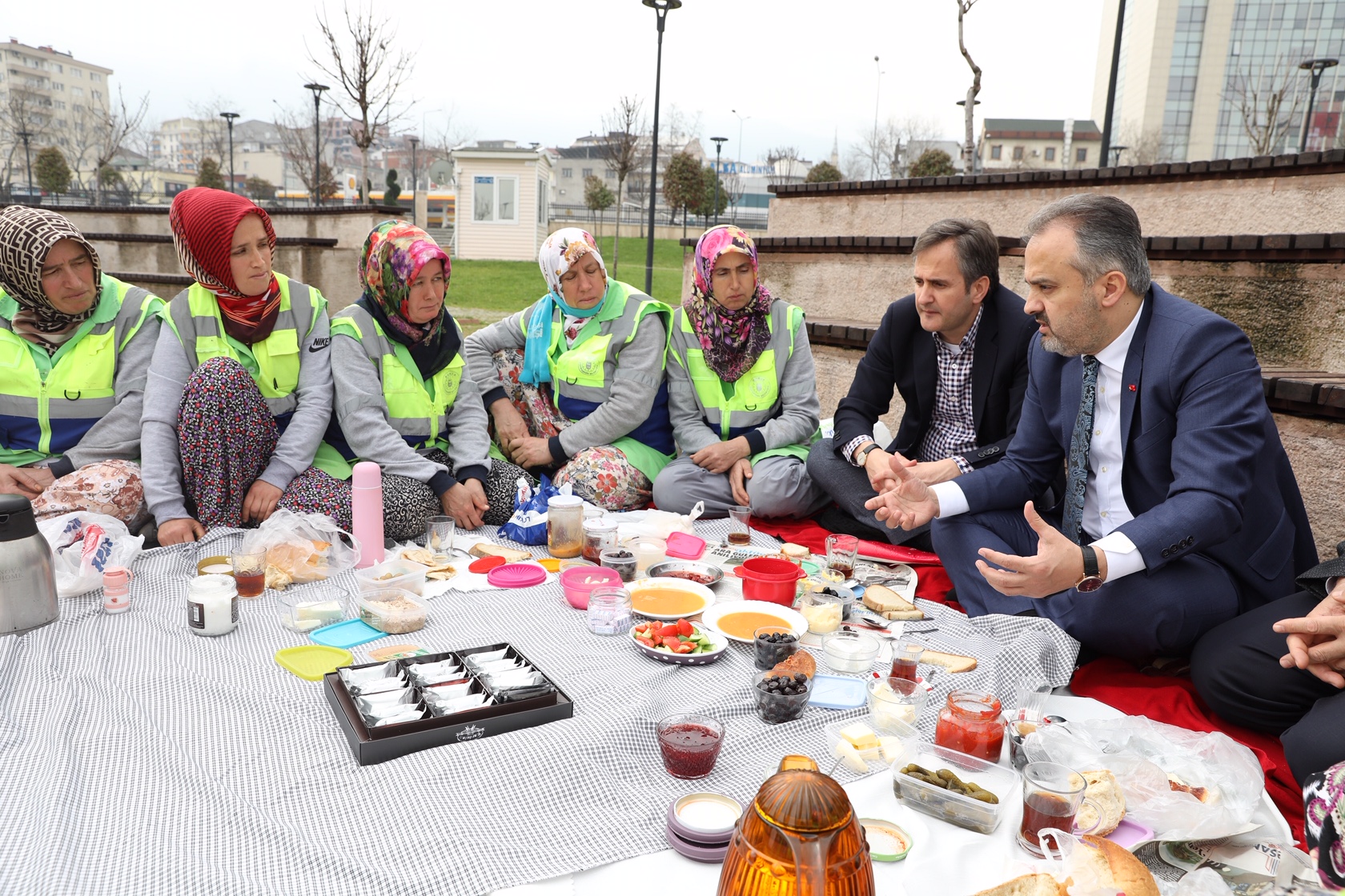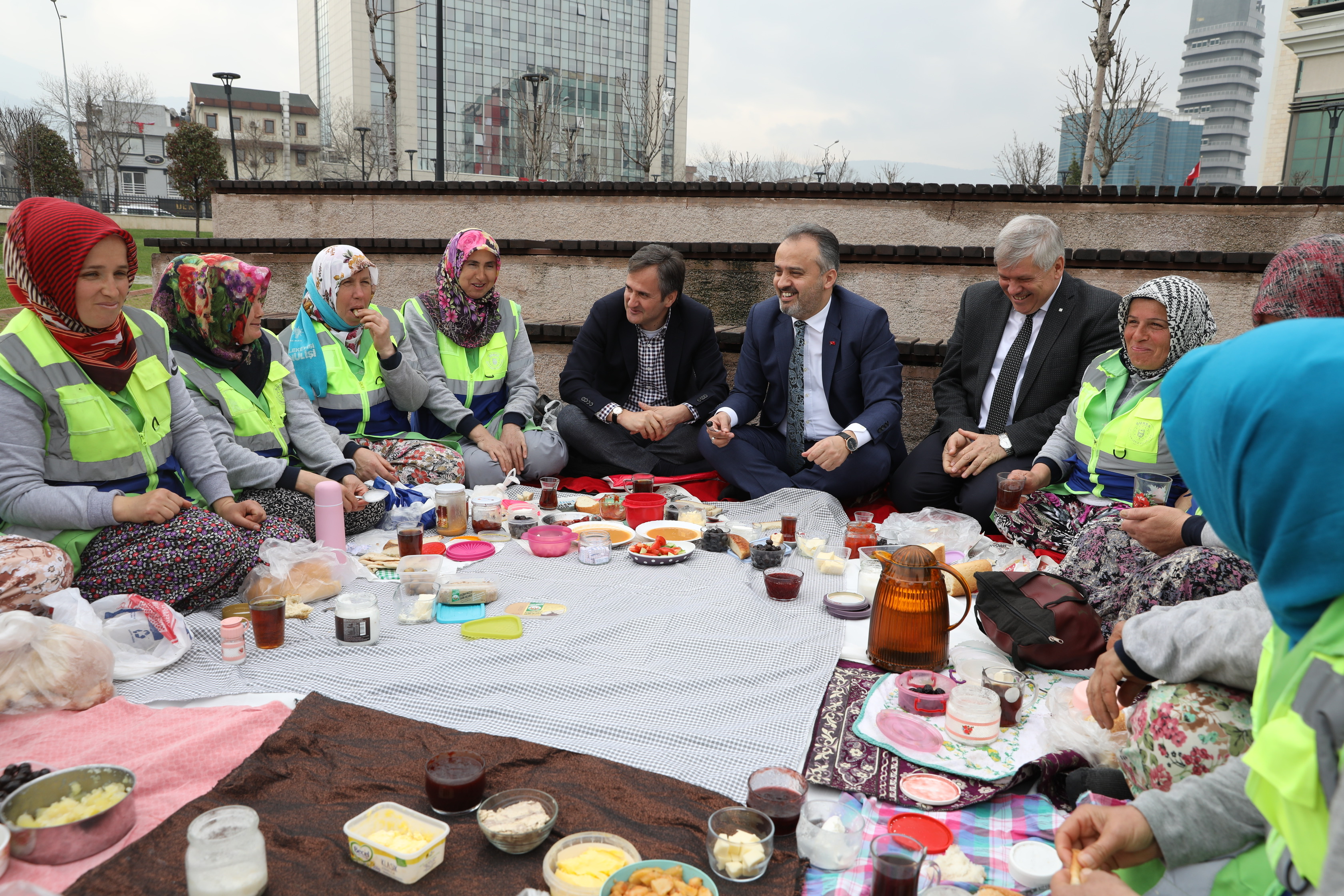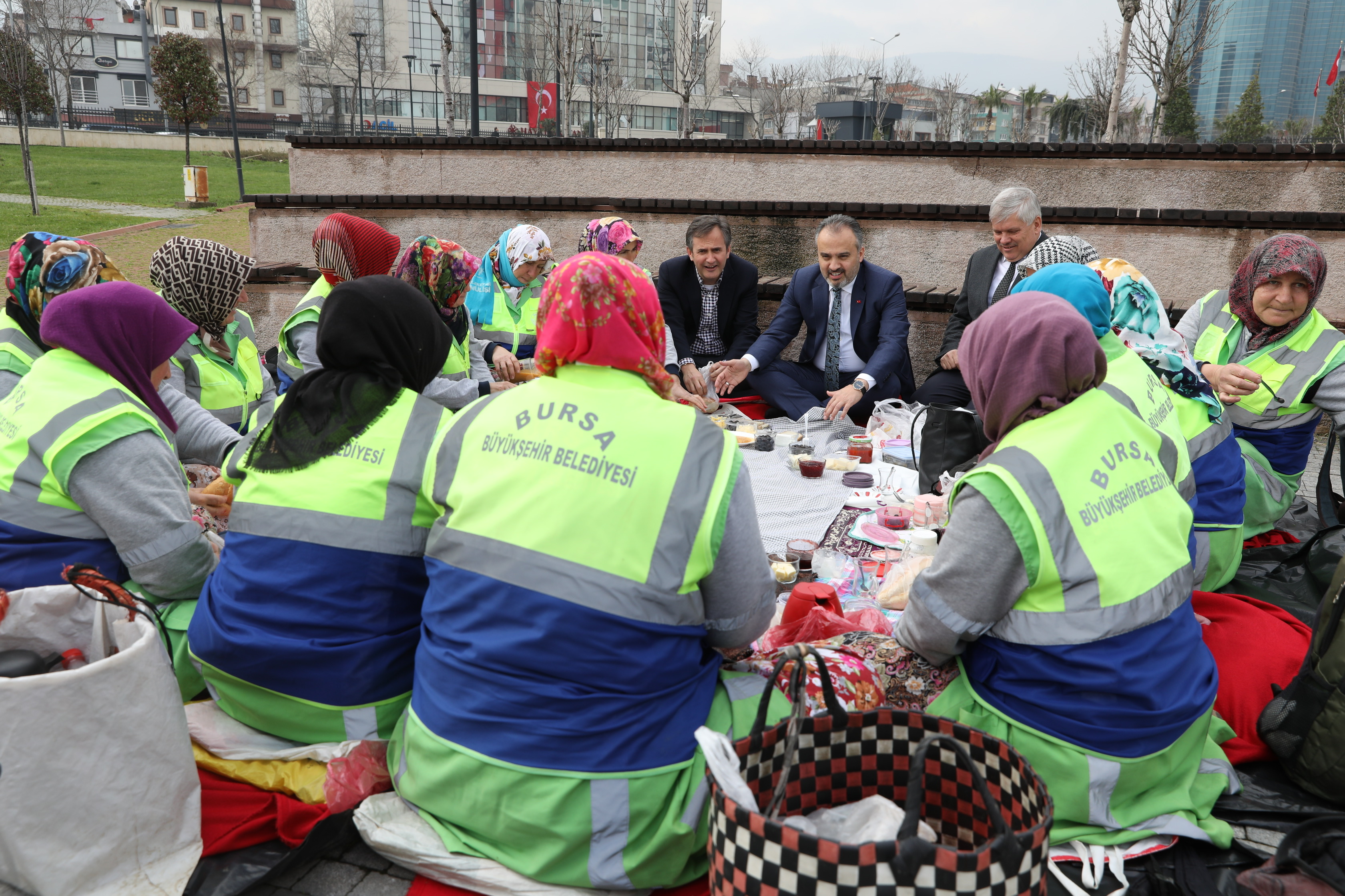 BURSA - Bursa Büyükşehir Belediye Başkanı Alinur Aktaş, 8 Mart Dünya Kadınlar Günü öncesindeki son mesai gününde kadın personele çiçek dağıttı, sahada çiçek dikimi yapan kadın personelin sofrasına misafir olup, onlarla sohbet etti.