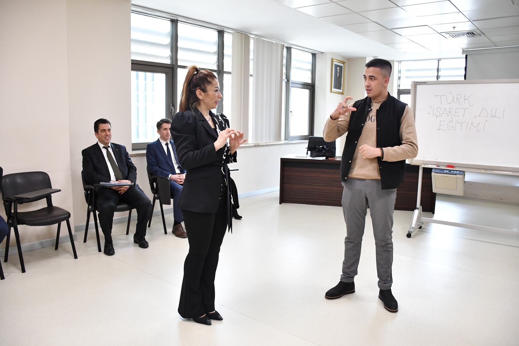 BURSA - Engelli vatandaşların sosyal hayatın her alanında aktif olarak rol alabilmesi için farklı projeleri hayata geçiren Bursa Büyükşehir Belediyesi, belediye hizmet birimlerine gelen işitme engelli vatandaşlarla daha etkili iletişim kurulabilmesi için güvenlik personeline işaret dili eğitimi veriyor.