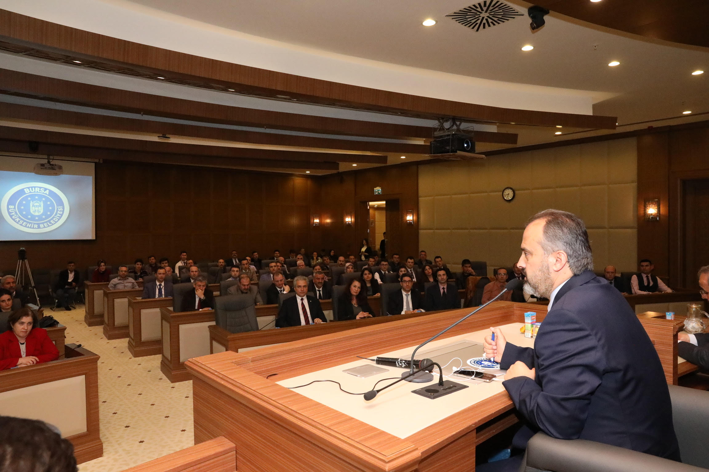 Bursa gibi nüfusu 3 milyona ulaşmış, özellikli ve güçlü bir şehrin Büyükşehir Belediyesi'nde görev aldıklarını söyleyen Başkan Alinur Aktaş, doğumdan ölüme hayatın her safhasının ilgi alanlarına girdiğini hatırlattı. Şehre değer katmaktan başka bir şey düşünmediklerini belirten Başkan Aktaş, hızlı bir değişim ve dönüşüm süreci yaşandığını, buna ayak uydurmak zorunda olduklarını ifade etti. Belediyecilikte para, personel ve proje arasında uyum sağlanması halinde başarının geleceğini dile getiren Aktaş, "Yaşadığımız şehir sıradan bir yer değil ve çalıştığımız kurum üst düzey bir kurumdur. 3 milyon kişiye hizmet eden, Türkiye'nin 4. büyük belediyesiyiz. Burada bir ekip çalışması yapılıyor. Herkes pozisyonuna göre daha etkin ve hızlı çalışmanın derdinde olmalıdır. Daha kaliteli hizmet ve güzel işler yapabilmek için koşmaya ihtiyacımız var. Seri ve pratik düşünmek zorundayız. Temizlikçisinden daire başkanına kadar her personelimiz bizler için değerlidir. Yaptığımız işe değer vereceğiz. Önceliklere ve acil konulara ağırlık vereceğiz. Halkı kucaklayıcı olacağız. Herkesten aşk ve şevkle çalışmasını bekliyorum" dedi.