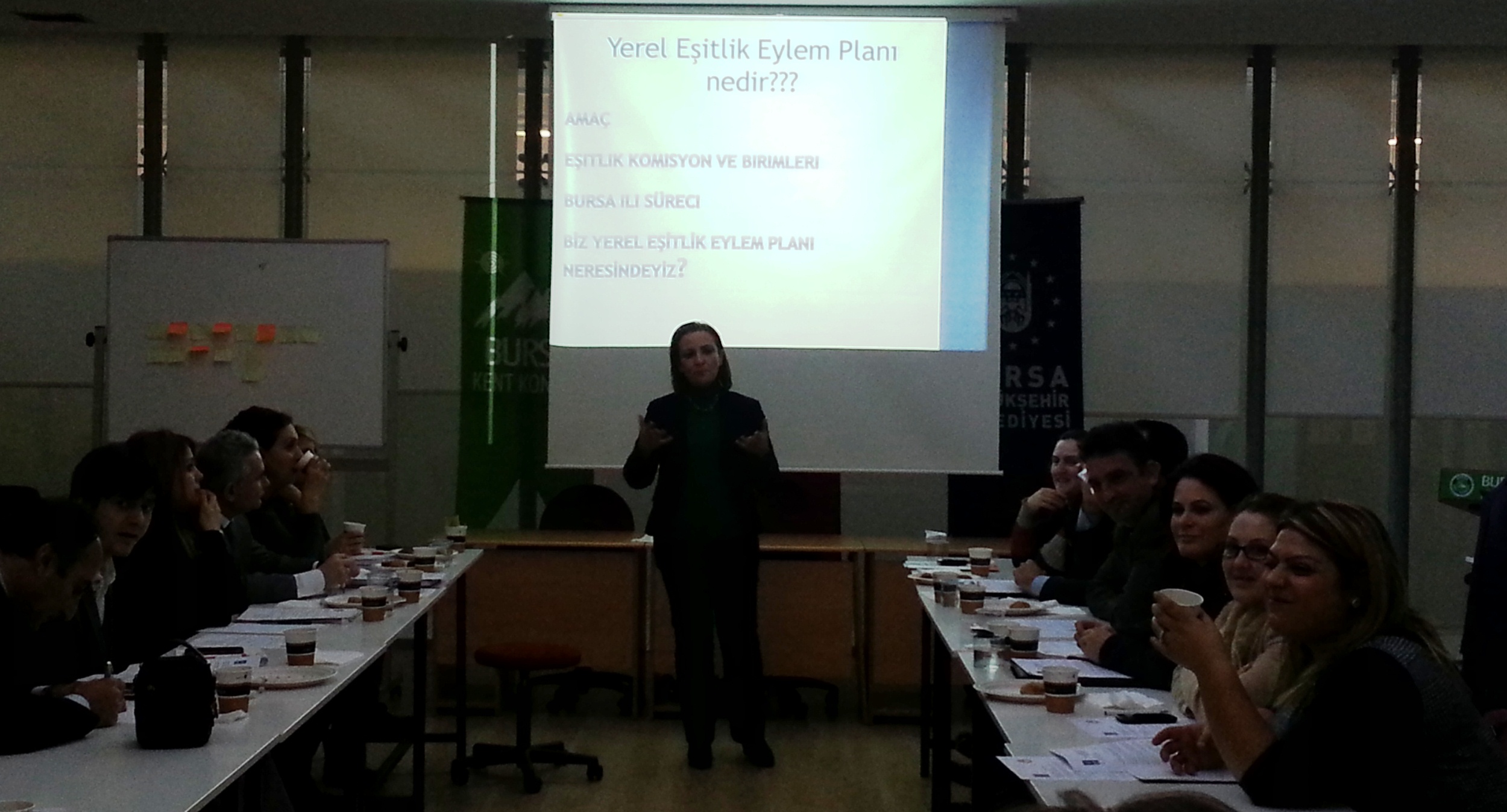 Birleşmiş Milletler Kadın Dostu Kentler Program Koordinatörü Burcu Üzümcüler, ‘Kadın Dostu Kentler’ programı, Bursa il durumu ve toplumsal cinsiyete duyarlı kentler hizmetlere dair uluslararası örnekleri içeren interaktif sunumu yanı sıra yerel eşitlik eylem planı ile Bursa’daki süreci hakkında bilgiler verdi. Büyükşehir Belediyesi Eşitlik Birimi Sorumlusu Ayşegül Öcalan da Büyükşehir Belediyesi’nin imza attığı ‘Avrupa Yerelde Kadın Erkek Eşitlik Şartı (CEMR)’ hakkında katılımcıları bilgilendirdi. Büyükşehir Belediyesi Eşitlik Birimi’nden Uzman Dr. Pelin Feymi ise proje kapsamında sürdürülen çalışmalardan örnekler verdi.