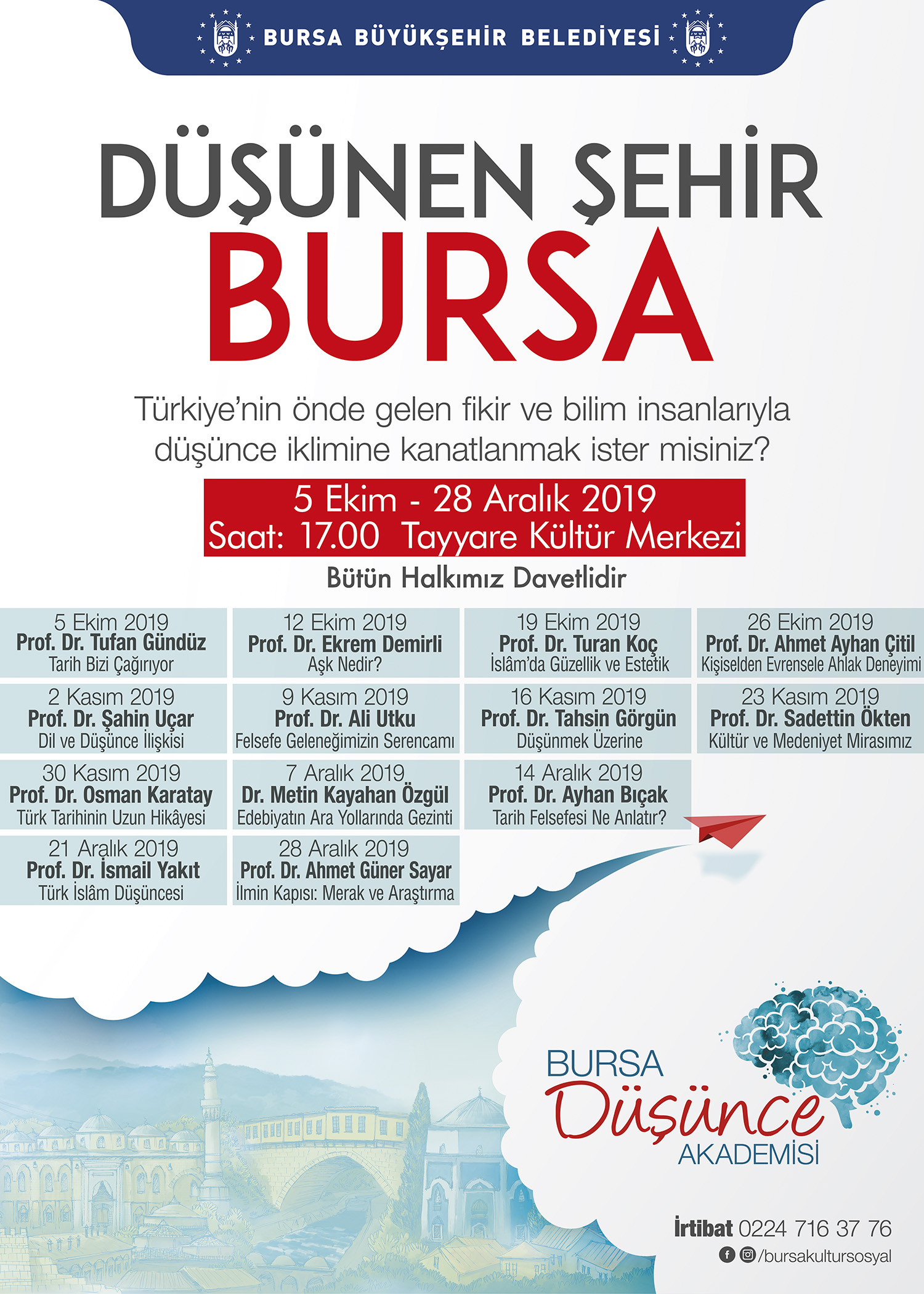 Yine Büyükşehir Belediyesi Kültür ve Sosyal İşler Dairesi’nce düzenlenen ‘Bursa Düşünce Akademisi’ ise 5 Ekim - 28 Aralık 2019 tarihleri arası, her Cumartesi saat: 17.00’da Tayyare Kültür Merkezi’nde gerçekleştirilecek. Düşünce Akademisinde de Prof. Dr. Tufan Gündüz, Prof. Dr. Ekrem Demirli, Prof. Dr. Turan Koç, Prof. Dr. Ahmet Ayhan Çitil, Prof. Dr. Şahin Uçar, Prof. Dr. Ali Utku, Prof. Dr. Tahsin Görgün, Prof. Dr. Sadettin Ökten, Prof. Dr. Osman Karatay, Dr. Metin Kayahan Özgül, Prof. Dr. Ayhan Bıçak, Prof. Dr. Ayhan Bıçak, Prof. Dr. İsmail Yakıt ve Prof. Dr. Ahmet Güner Sayar gibi önemli isimler Bursa’da konuk edilecek.