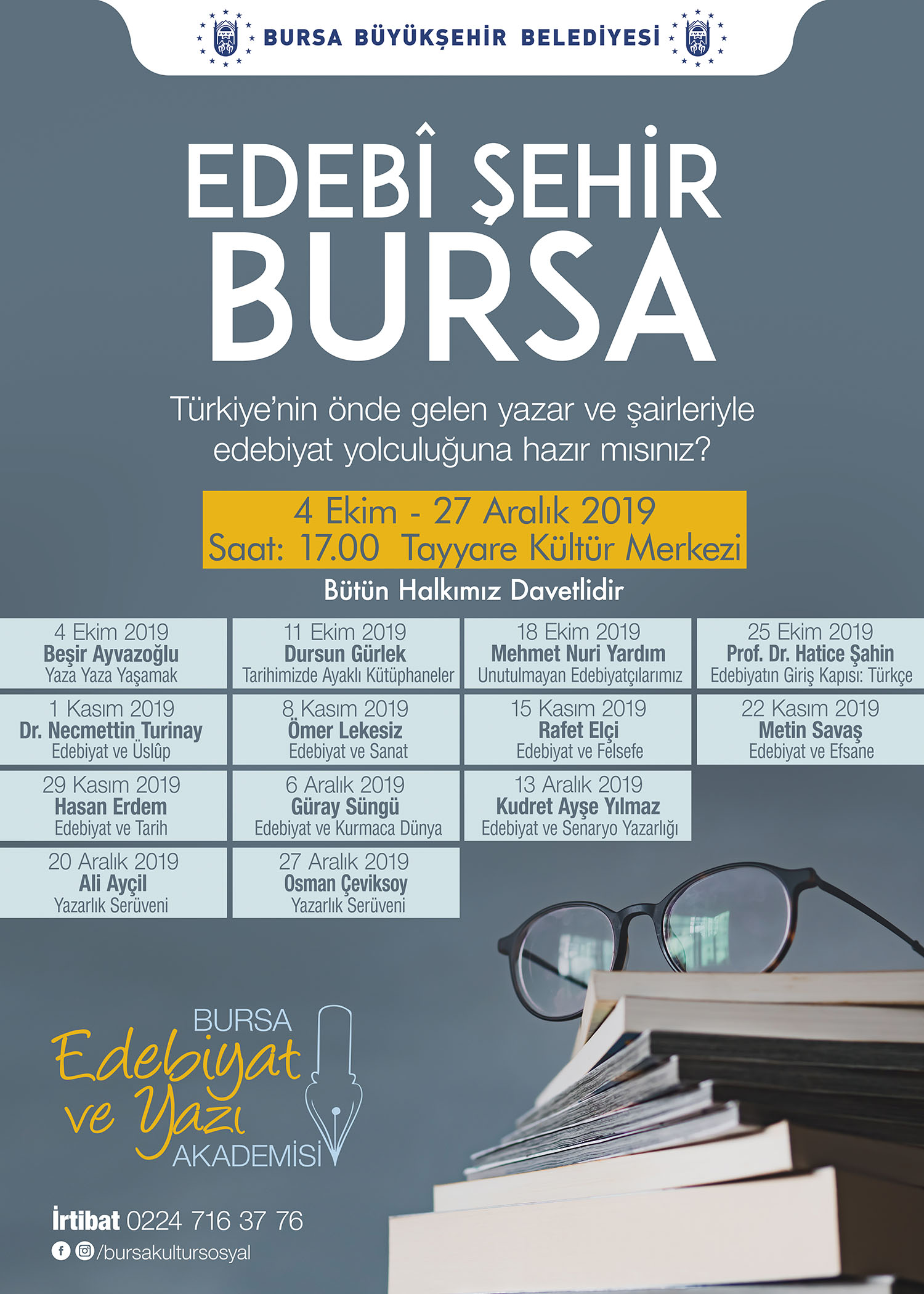 Birbirinden önemli isimlerin farklı konularda konuşmacı olarak katılacağı programlar, Bursalıların edebiyat ve kültür hayatına farklı bir bakış açısı sunacak. Tayyare Kültür Merkezi’nde 4 Ekim - 27 Aralık 2019 tarihleri arasında her Cuma saat 17.00’da gerçekleştirilecek “Bursa Edebiyat ve Yazı Akademisi”, Türkiye’nin önemli yazarları Beşir Ayvazoğlu, Dursun Gürlek, Mehmet Nuri Yardım, Prof. Dr. Hatice Şahin, Dr. Necmettin Turinay, Ömer Lekesiz, Rafet Elçi, Metin Savaş, Hasan Erdem, Güray Süngü, Kudret Ayşe Yılmaz, Ali Ayçil ve Osman Çeviksoy’u Bursalılarla buluşturacak.