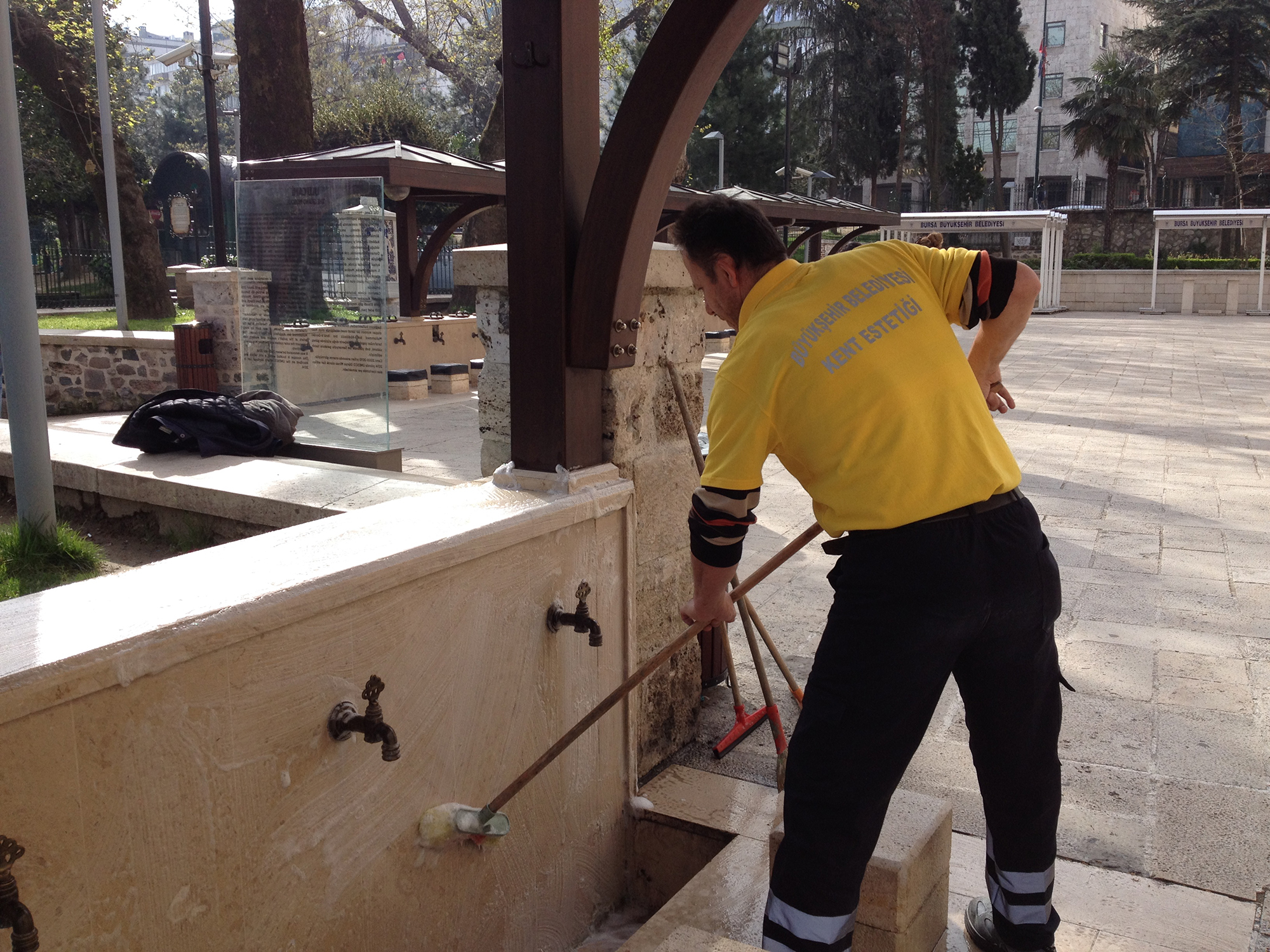 BURSA - Gerek sokak sanatı çalışmaları gerekse görüntü kirliliğine yol açan unsurların ortadan kaldırılması çalışmalarıyla Bursa’da yaşam kalitesinin yükseltilmesine katkı sağlayan Büyükşehir Belediyesi Kent Estetiği Şube Müdürlüğü ekipleri, metro duvarları, otobüs durakları ve çeşmeleri de kapsayan geniş bir bahar temizliği çalışması başlattı. Çalışmalar kapsamında tüm otobüs durakları sabunlu suyla yıkanırken, metro duvarları ve tarihi görünümlü çeşmelerin tamamı tek tek temizleniyor.