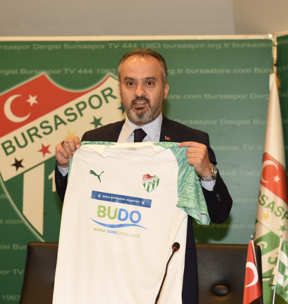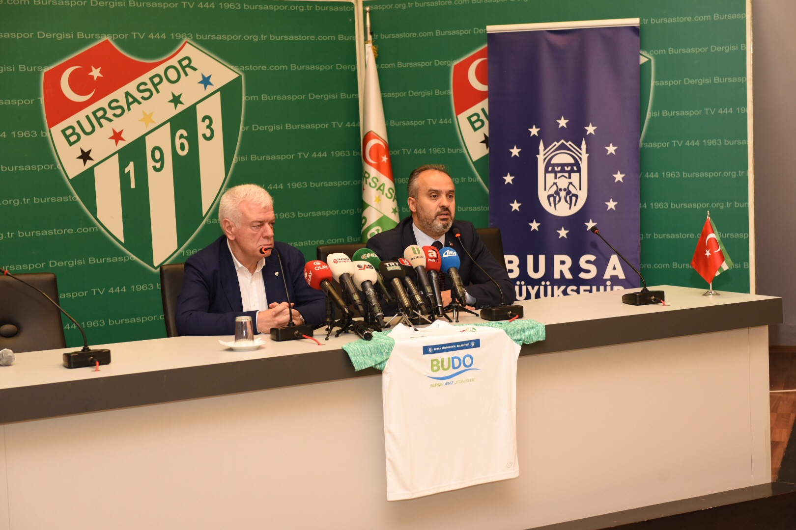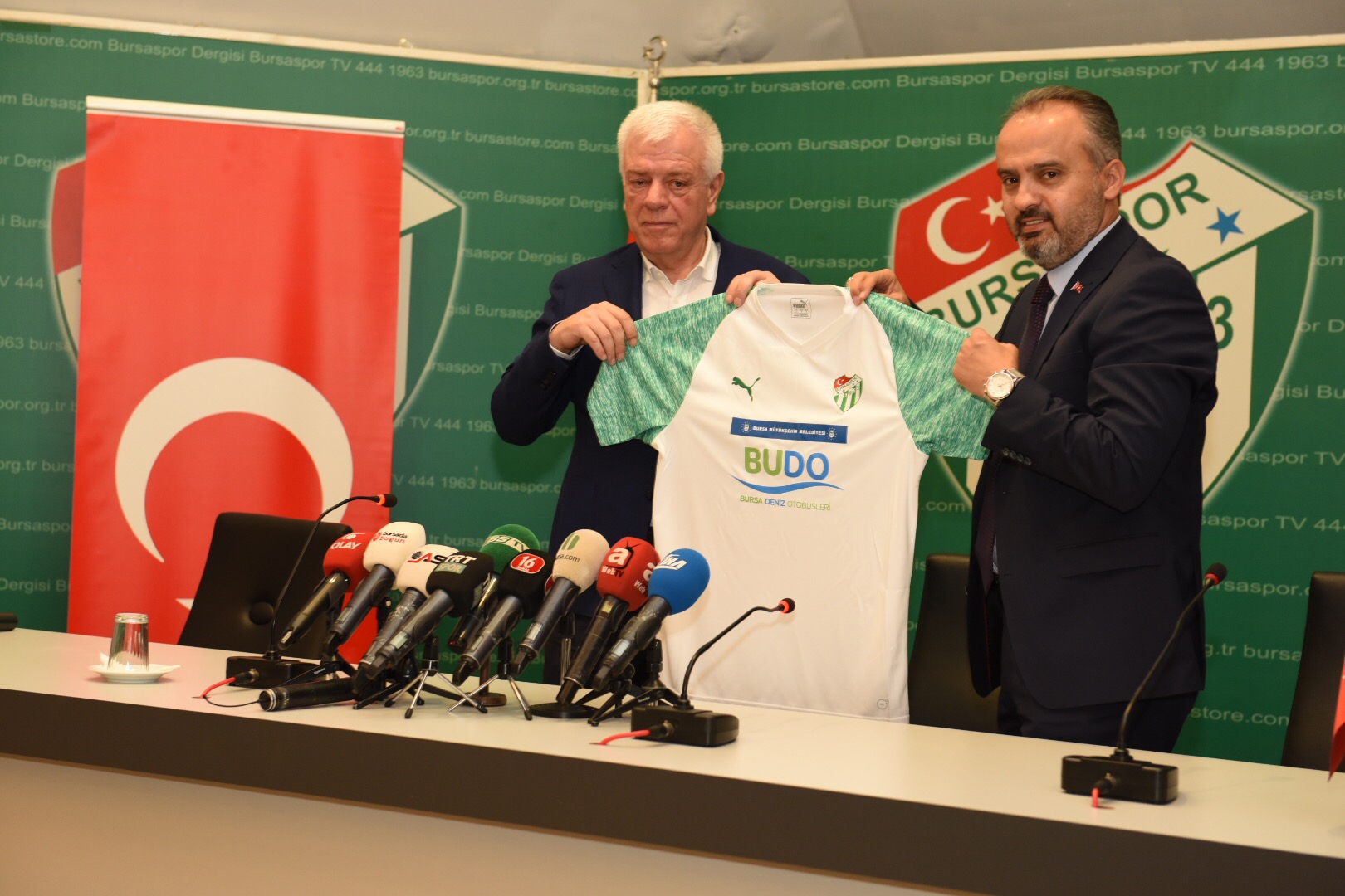 Açıklamaların ardından Büyükşehir Belediye Başkanı Alinur Aktaş ile Bursaspor Başkanı Ali Ay, BUDO reklamının yer aldığı forma ile basın mensuplarına poz verdi.
