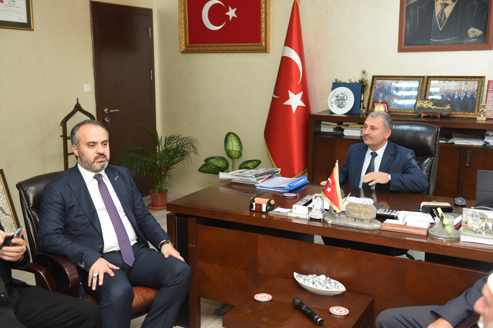 Gürsu’nun ardından Kestel’e geçen Başkan Aktaş, burada da Belediye Başkanı Yener Acar’ı makamında ziyaret etti. Kestel Kaymakamı İskender Yöndem’in de katıldığı ziyarette Büyükşehir Belediyesi’nin ilçe projeleri ele alındı. Gürsu ilçesinde olduğu gibi Kestel ilçesinde de gerekli tüm yatırımların bütçe imkanları doğrultusunda zaman kaybedilmeden hizmete alınacağını kaydeden Başkan Aktaş, “İlçelerimiz için ’Neler yapabiliriz?’ ile alakalı ilçe kaymakamlarımızın da katkıları ve yönlendirmeleri var. Onların da fikirleri önemli. Tamamen sonuç odaklı olmaya çalışıyoruz. Tüm bürokratlarımız bu toplantılara katılıyor. Herkes gerekli dersleri alıp, sevk ve idare ediyor. 15 aylık dar bir zaman var. Yük çok açık. Belirli sıkıntılar var. İnşallah ekip arkadaşlarımız, ilçe belediyelerimiz elbirliğiyle tüm bu sıkıntıların üstesinden geleceğiz. İlçelerimizin daha yaşanabilir kılınmasını sağlayacağız” ifadelerini kullandı. Kestel Belediye Başkanı Yener Acar da Başkan Aktaş’a ilçelerine gösterdiği hassasiyet nedeniyle teşekkür etti.