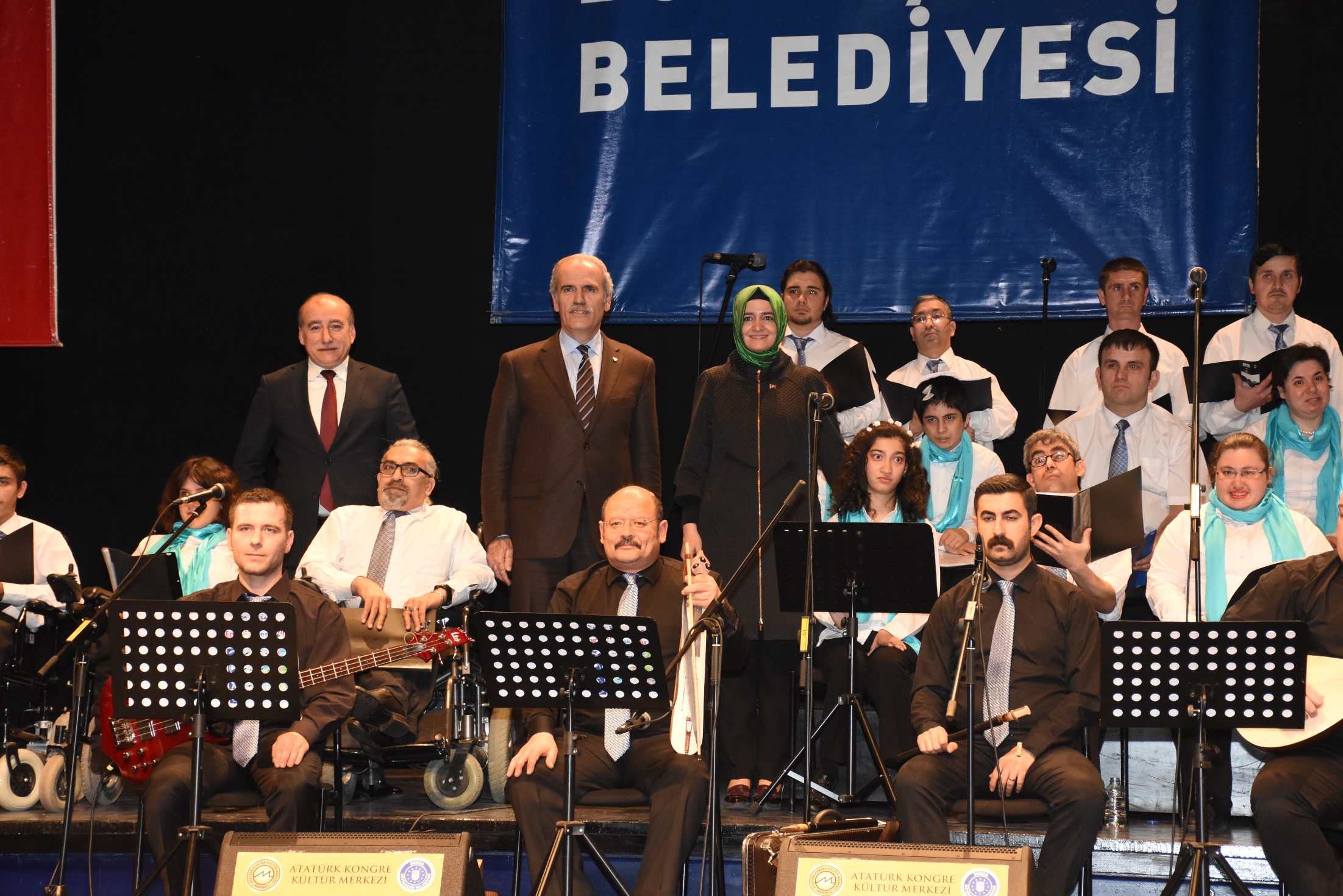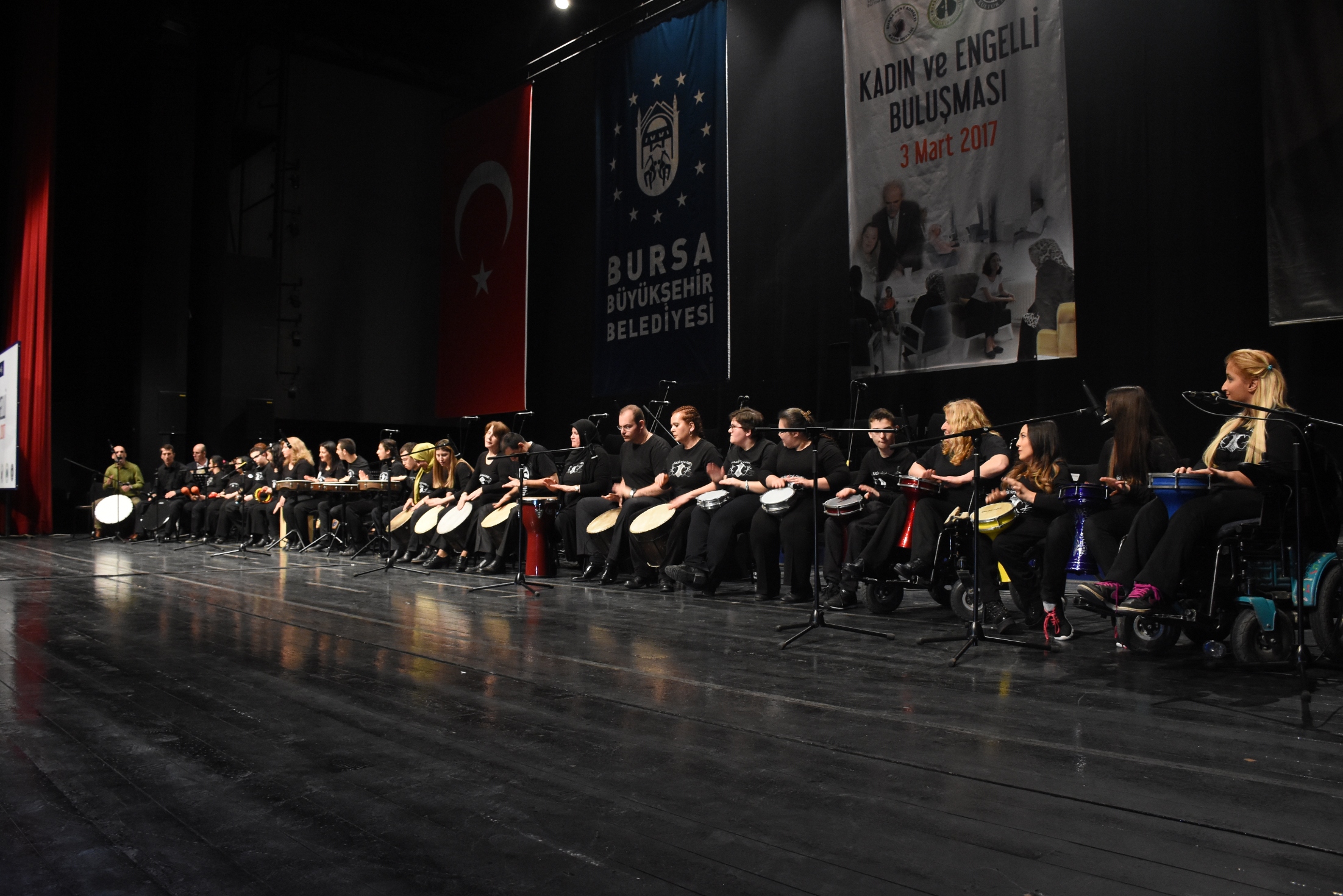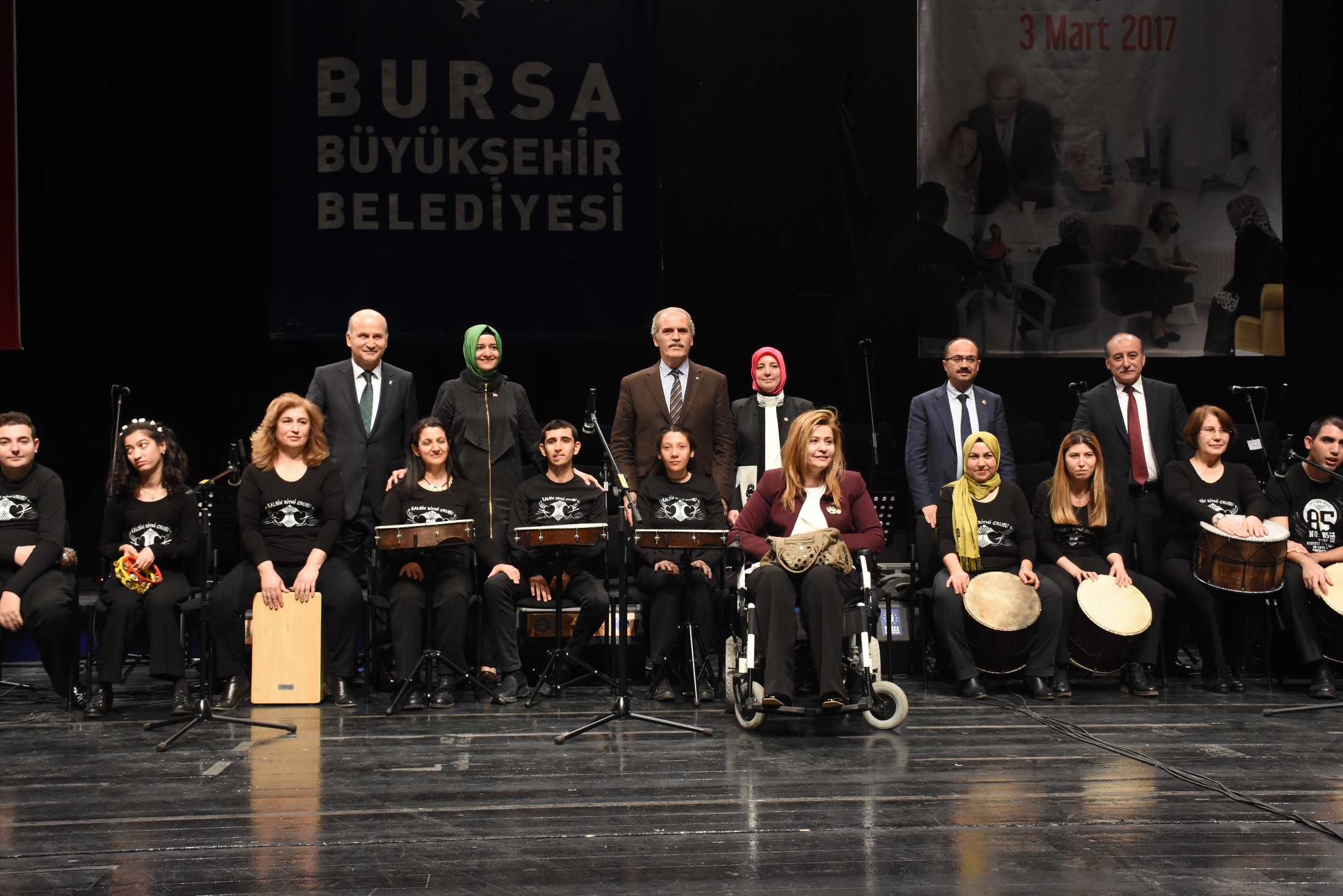 Büyükşehir Belediyesi’nin sanat ve meslek eğitim kurslarıyla mobil eğitim ve engelsiz mobil eğitim projelerinin tanıtım filmi gösterildiği programda, Bursa Kent Konseyi Engelliler Meclisi Kalbin Ritmi Grubu tarafından özel gösteri yapıldı. Eğitmen Cuma Çimen eşliğinde sahneye çıkan engelli çocuklar ve anneleri, müzik aletlerini başarıyla çalarak dinleyenlerden büyük alkış aldı. Programda, ayrıca Şennur Yaman isimli minik kız İstiklal Marşı’nın okuyarak salondan büyük alkış aldı. Ayrıca Engelliler Meclisi Türk Halk Müziği Korosu da katılanlara unutulmaz bir konser sundu.