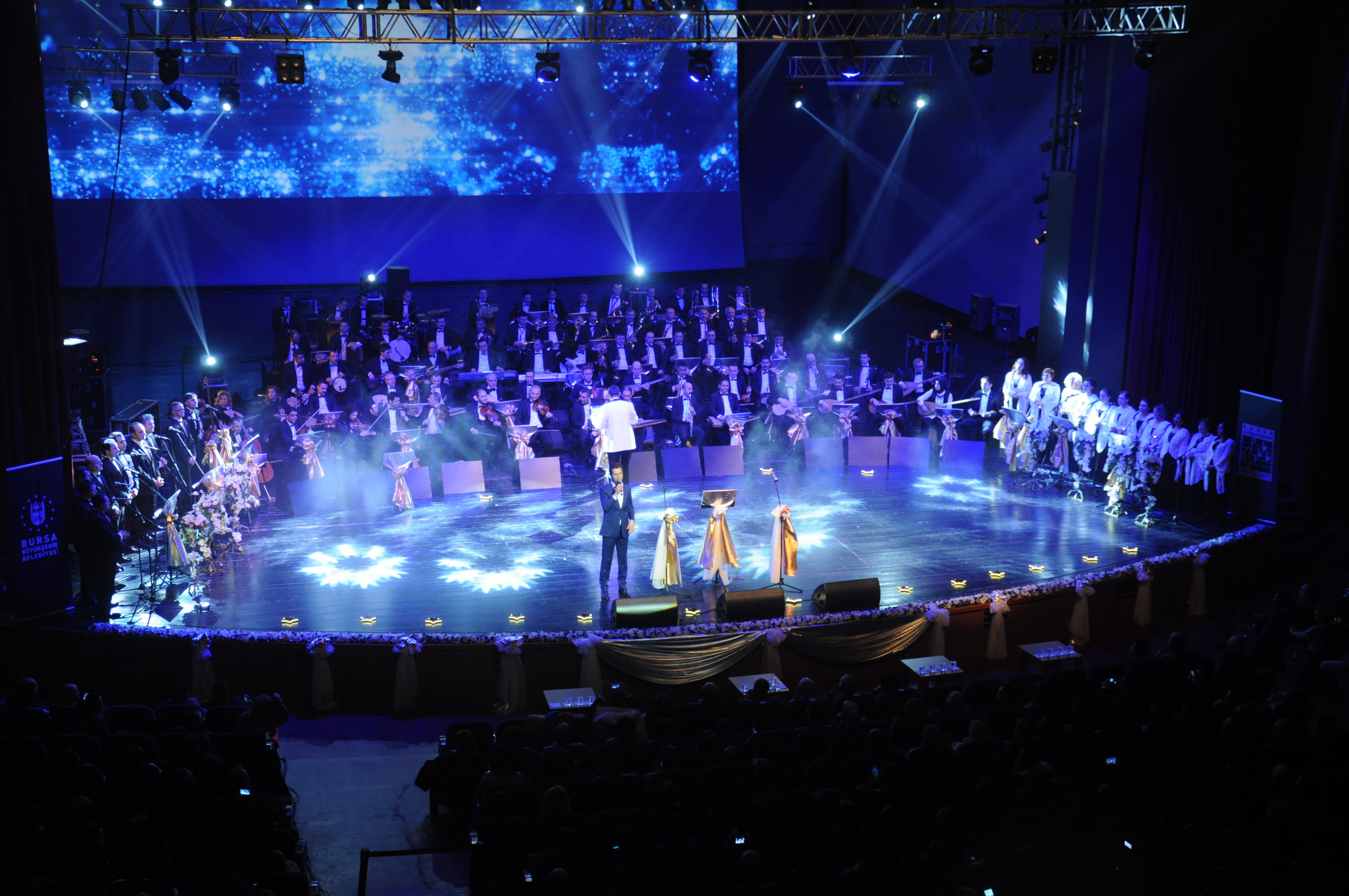 Büyükşehir Belediyesi Orkestra Şube Müdürlüğü bünyesinde çalışmalarını sürdüren Bando, Türk Sanat Müziği, Türk Halk Müziği, Çalgıcı Mektebi Roman Orkestrası ve icra toplulukları, özel konserde bir araya geldi. Atatürk Kongre Kültür Merkezi (Merinos AKKM) Osmangazi Salonu’nda, Şaban Gülşen’in şefliğinde gerçekleştirilen konseri, Büyükşehir Belediyesi çalışanları ve vatandaşlar yoğun ilgiyle izledi. 123 sanatçının sahneye çıktığı gecede, sanatçılar solo ve koro olarak seslendirdikleri eserlerle müzikseverlere unutulmaz bir akşam yaşattı. Türk Sanat Müziği ve Türk Halk Müziği’nin değerli eserlerini seslendiren sanatçılar, yöresel parçalarla da sanatseverleri mest etti. Balkanlardan Kafkaslara, Ege’den Doğu’ya, Karadeniz’den Akdeniz’e kadar birçok farklı bölgeden haraketli parçayı seslendiren sanatçılar, şarkılarla salonu coşturdu. Bahtiyar Özdemir ve Aysun Taşçeşme, sosyal medyada fenomen olan ‘Aşk Çiçeğim’ parçasını Bursalılar için bir kez daha okudu. Modern dans gösterisinin de sahnelendiği gecede, Hint figürleri taşıyan şarkı ise büyük beğeni topladı. Sanatseverlerin de şarkılara eşlik ettiği gecede, 123 kişilik dev kadro sanatseverlerden büyük alkış aldı. Konserin sonunda Bursa Büyükşehir Belediye Başkanı Recep Altepe adına Muhsin Özlükurt, orkestra şeflerini, bölüm başkanlarını ve sanatçıları tebrik ederek çiçek verdi. Keyifli gecenin hazırlanmasında emeği geçenlere teşekkür eden Özlükurt, 14 Şubat Sevgililer Günü’nde de özel bir konser verileceğini söyledi.