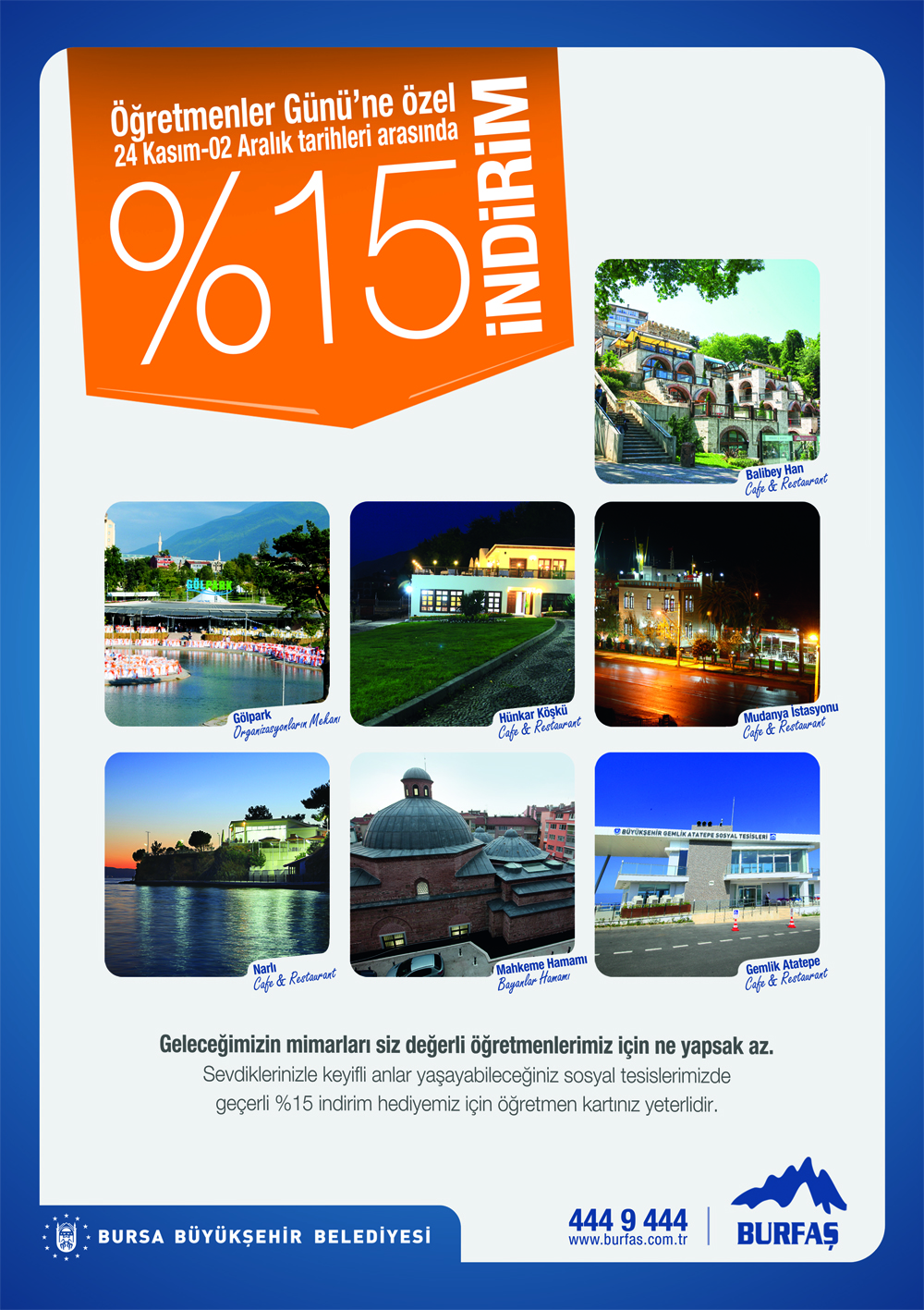 - BURSA BÜYÜKŞEHİR BELEDİYESİ’NİN SOSYAL TESİSLERİ, ‘24 KASIM ÖĞRETMENLER GÜNÜ’NDE ÖĞRETMENLERE YÜZDE 15 İNDİRİMLE HİZMET VERECEK.