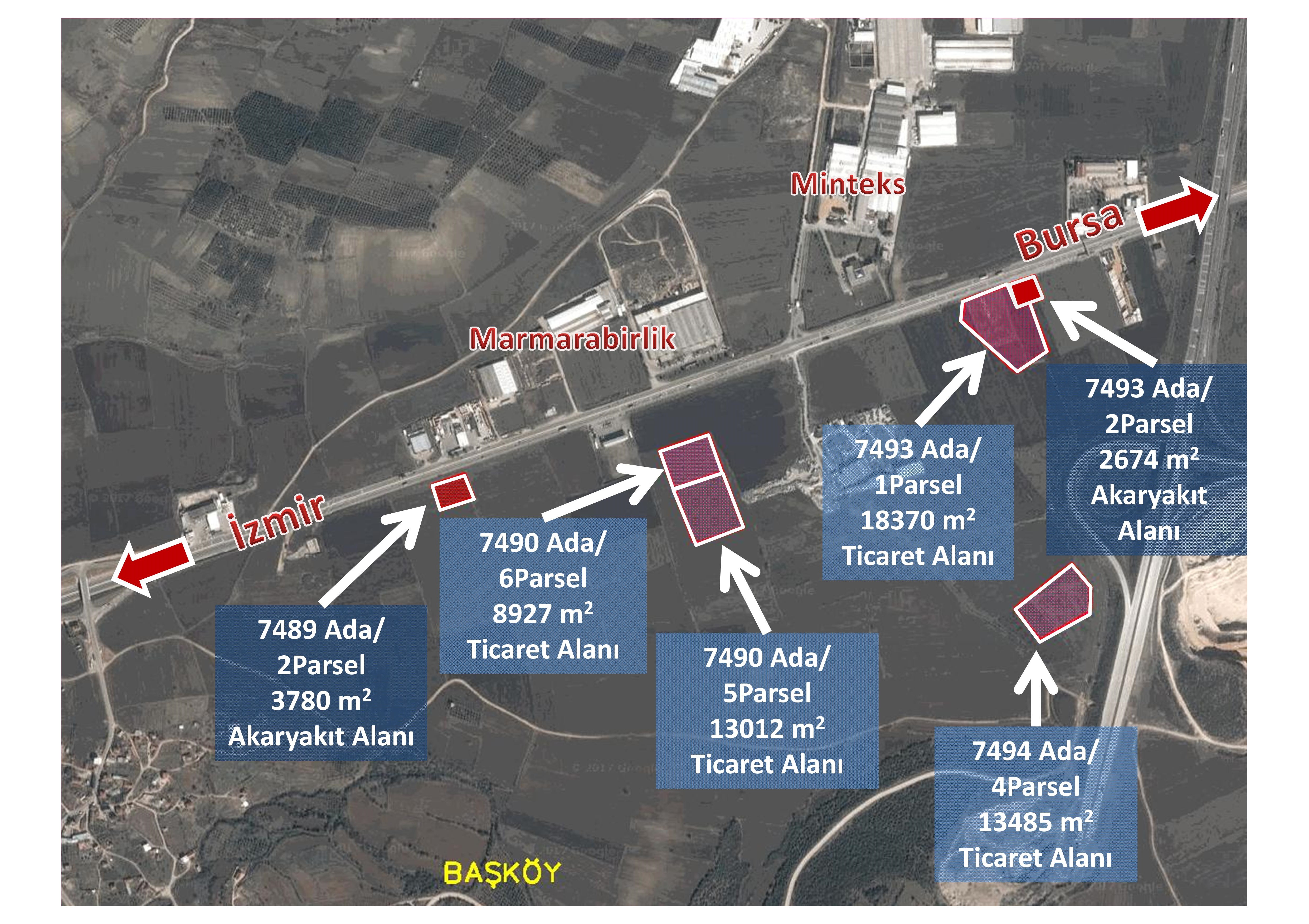 Bursa’nın değerine değer katan Büyükşehir Belediyesi, İzmir Yolu üzerindeki Başköy’de, Minteks ve Marmarabirlik’in karşısındaki alanda bulunan ve 2’si akaryakıt istasyonu, 4’ü de ticaret alanı olarak planlanan 6 taşınmazı satışa çıkarıyor.