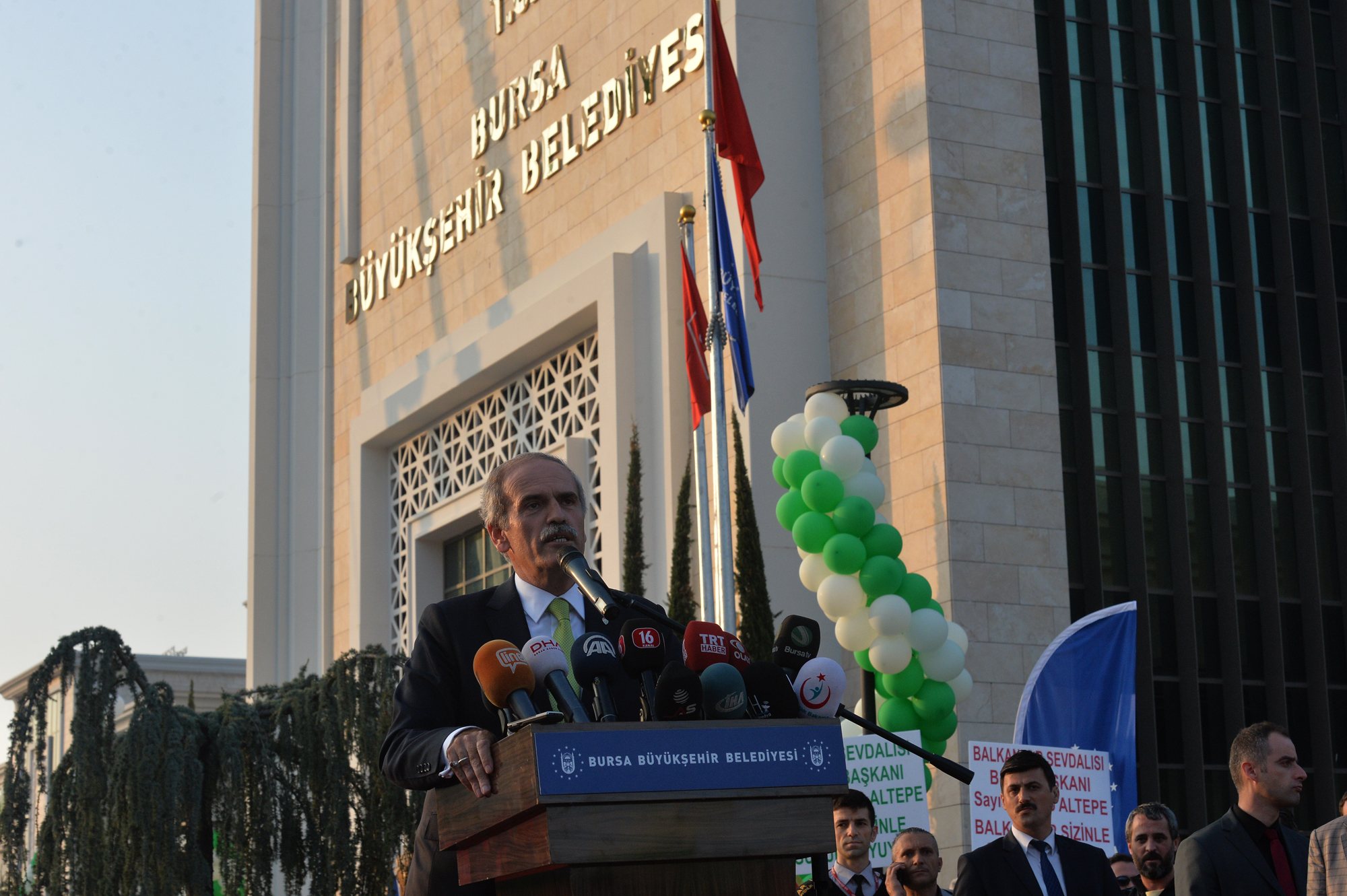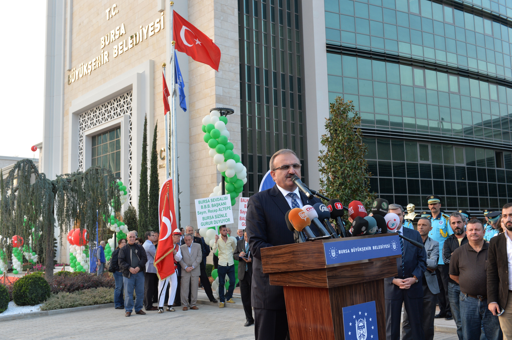 1912’de Bursa’nın ilk belediye başkanı olan Sadrettin Efendi’den 1987 yılına kadar 42 belediye başkanının, Büyükşehir statüsüne geçtiği 1987 yılından bu yana da 5 belediye başkanı hizmet verdiğini hatırlatan Büyükşehir Belediye Başkanı Recep Altepe, 48’inci başkan olarak Belediye hizmet binası yapmanın kendine nasip olduğunu vurguladı. Bursa’ya hizmet eden tüm belediye başkanlarına teşekkür eden Başkan Altepe, Teoman Özalp ve Hikmet Şahin başta olmak üzere ebediyete intikal eden tüm başkanları da rahmetle andı. Osmanlı’nın kent yönetimi ile ilgili çıkardığı ilk yasalardan birinin de Bursa Belediye İhtisab Yasası olduğunu ve 1839 Tanzimat öncesinde mülki ve idari yönetim kadılarının görev yerinin Ulucami’nin doğusunda yer alan “ihtisab belediye çadırı” olduğunu hatırlatan Başkan Altepe, “Çardakta başlayan halka hizmet hareketi, bugünden itibaren Bursa’nın bu modern abidesinde devam edecek. Düne kadar Büyükşehir Belediyesi’nin hizmet ve yönetim birimleri birbirinden ayrı mekanlarda hizmet vermek zorundaydı. Hele Bütünşehir yasasının çıkmasıyla birlikte Büyükşehir’in tek merkezden idaresi elzem hale gelmişti. 2011 yılında başladığımız hizmet binası projemle tüm birimlerimiz 15 bloktan oluşan tek çatı altında hizmet vermeye başlıyor. Bursa’mıza hayırlı olsun” diye konuştu.