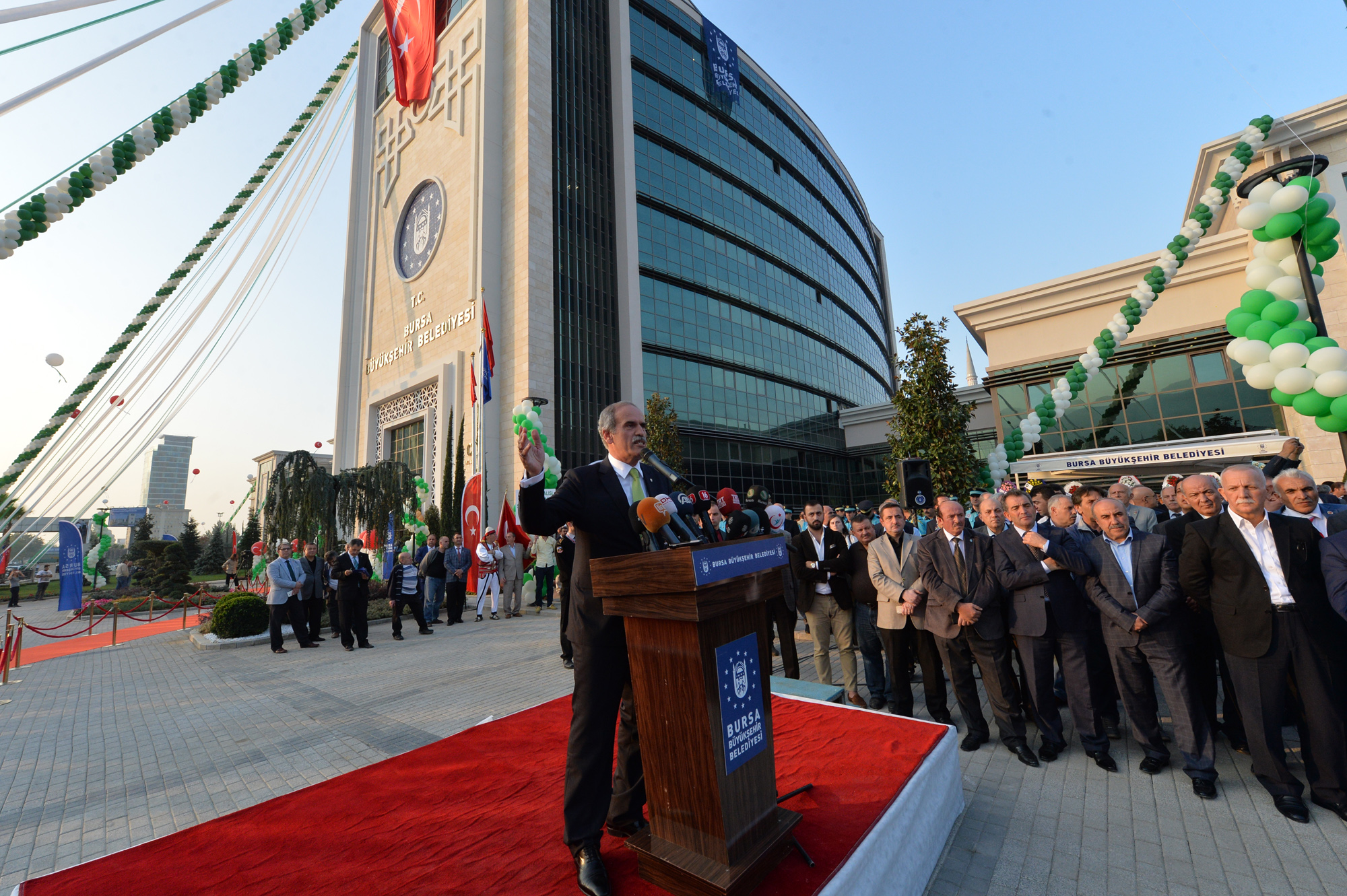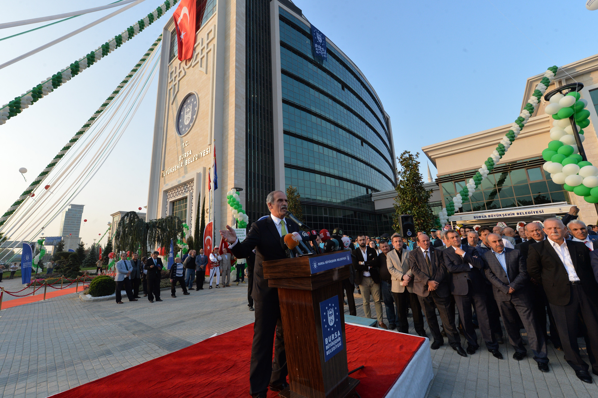 BURSA - Bursa’da 1879 yılında Vali Ahmet Vefik Paşa zamanında, Eşref ve Hüsnü beylerin Belediye reislikleri döneminde yaptırılan hizmet binasından sonra Büyükşehir Belediyesi tarafından yaptırılan yeni ve modern hizmet binası törenle hizmete açıldı.