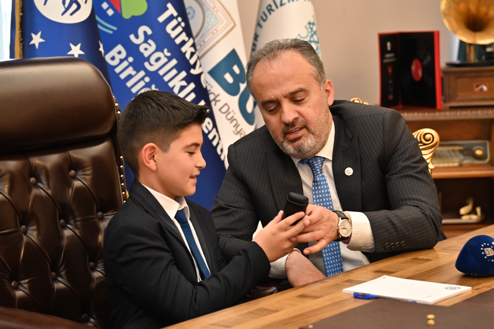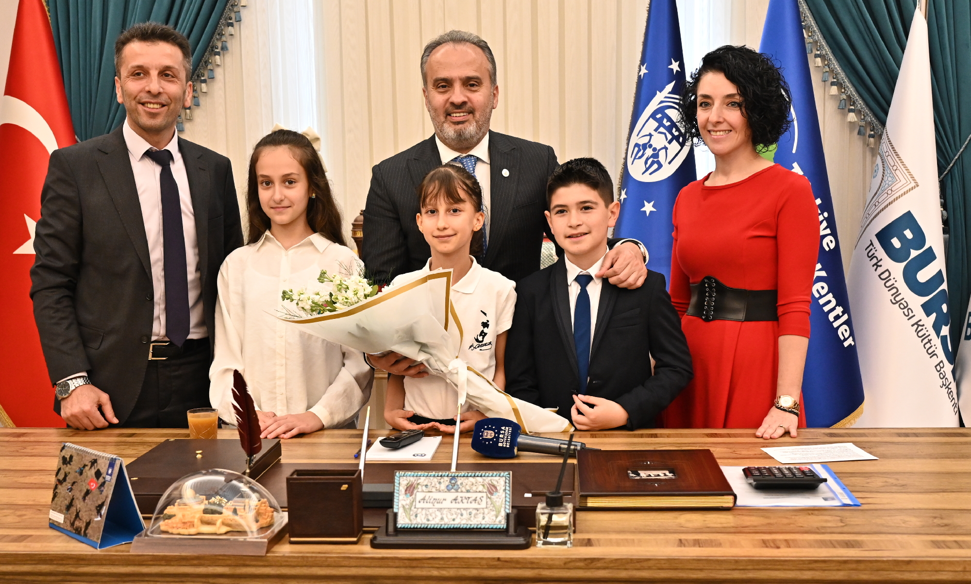 Bu yıl Ramazan Bayramı ile 23 Nisan Ulusal Egemenlik ve Çocuk Bayramı’nın aynı güne denk gelmesi çocuklara çifte bayram yaşatırken, geleceğin ülke ve kent yöneticileri bir günlüğüne de olsa makamları sahiplerinden devraldı. Bursa Büyükşehir Belediye Başkanı Alinur Aktaş da makamını Cavit Çağlar İlkokulu 4. Sınıf öğrencileri Hasan Eren Turna, Ayşenur Kaya ve Burcu Çiçek’e devretti. Geleceğin başkanları Heykel’deki tarihi binada düzenlenen devir teslim törenine okul müdürleri Abdürrahim Çiçek, sınıf öğretmenleri Şermin Çalışkan ve aileleri ile birlikte geldi.
