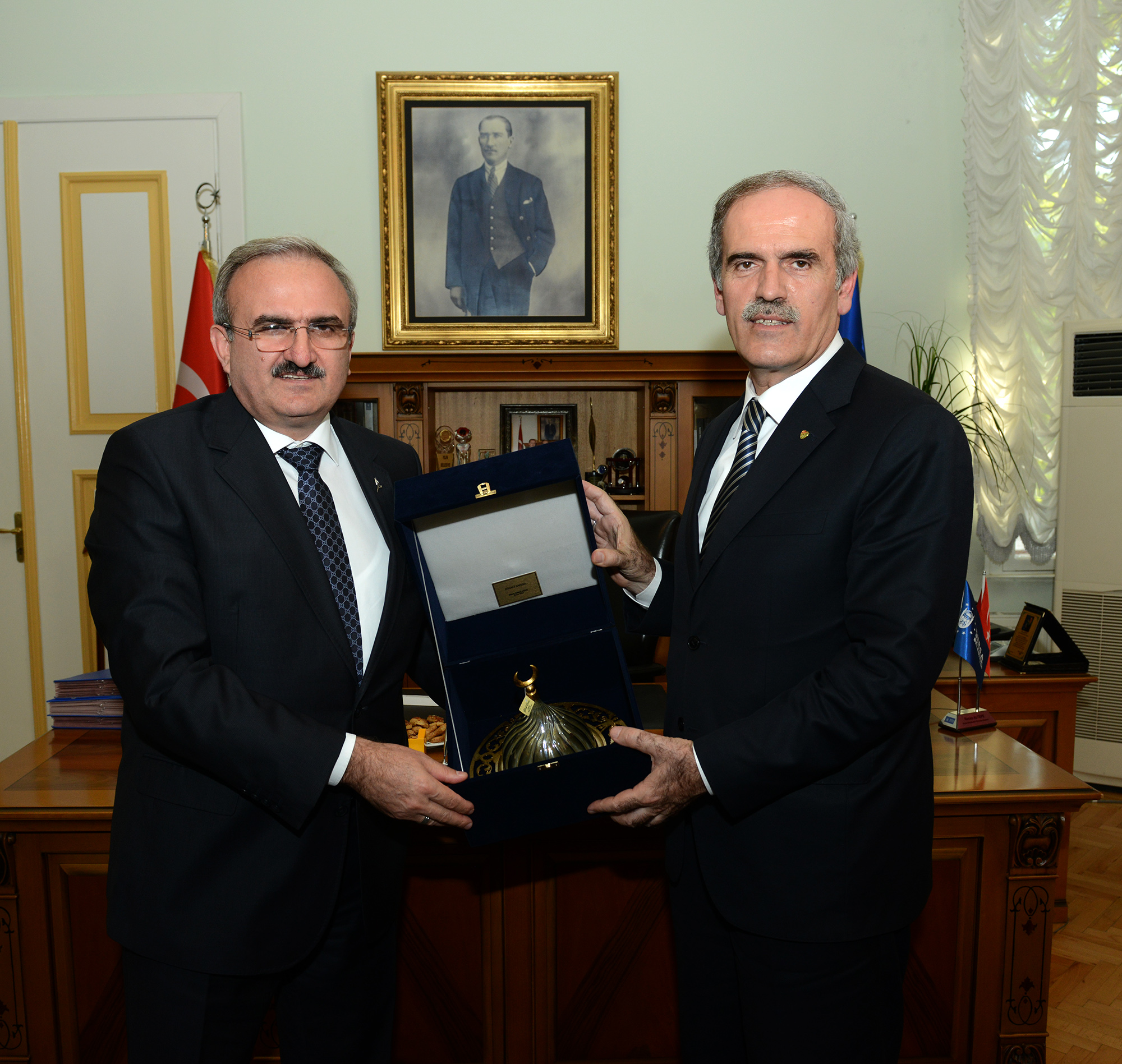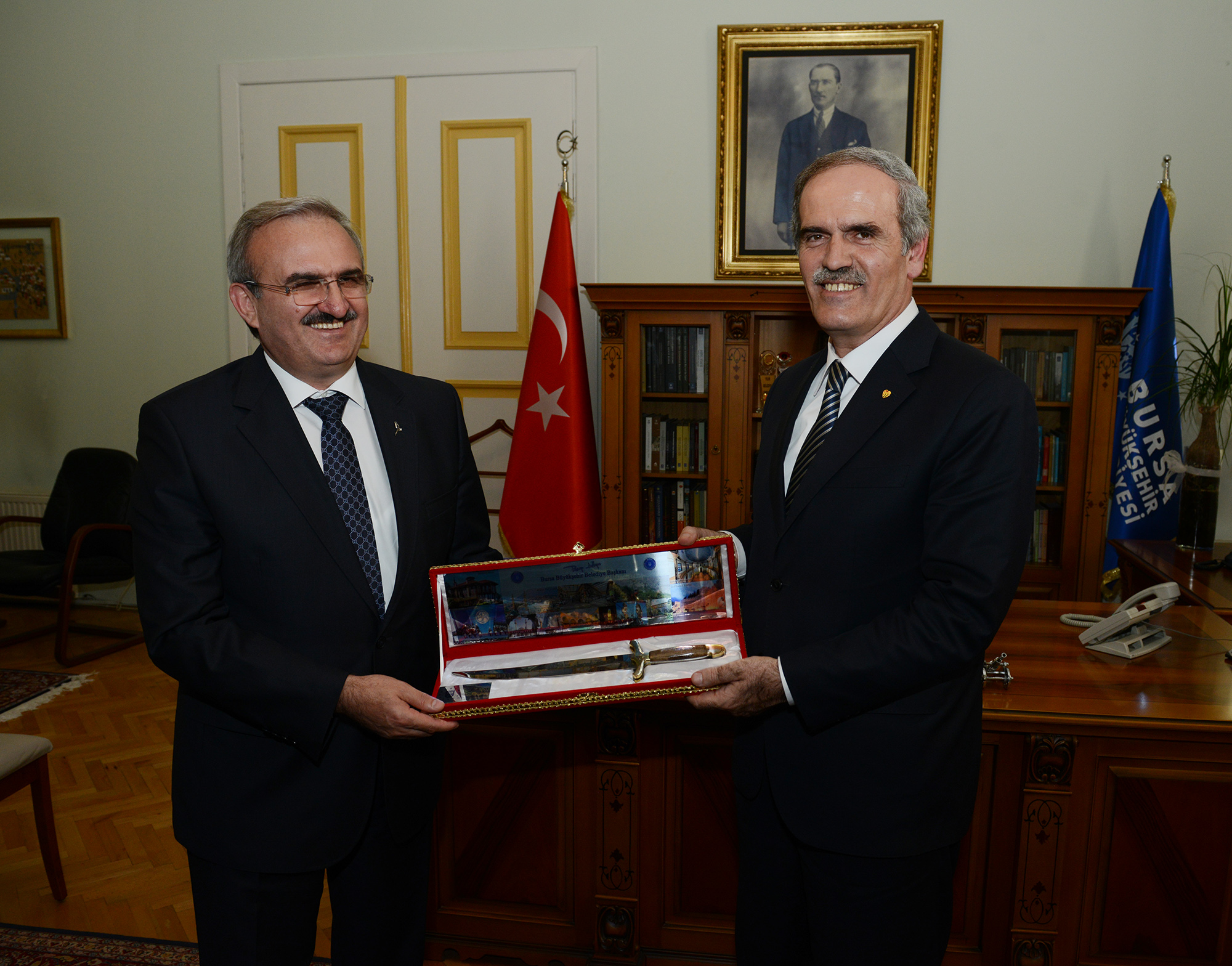 Bu arada Bursa Valisi Münir Karaloğlu, yeni dönemin ilk meclis toplantısının ardından Büyükşehir Belediye Başkanı Recep Altepe’yi makamında ziyaret etti. Yeni dönemin Bursa için hayırlı olmasını dileyen Vali Karaloğlu, günün anısına Başkan Altepe’ye el yapımı bakır tabak hediye etti.