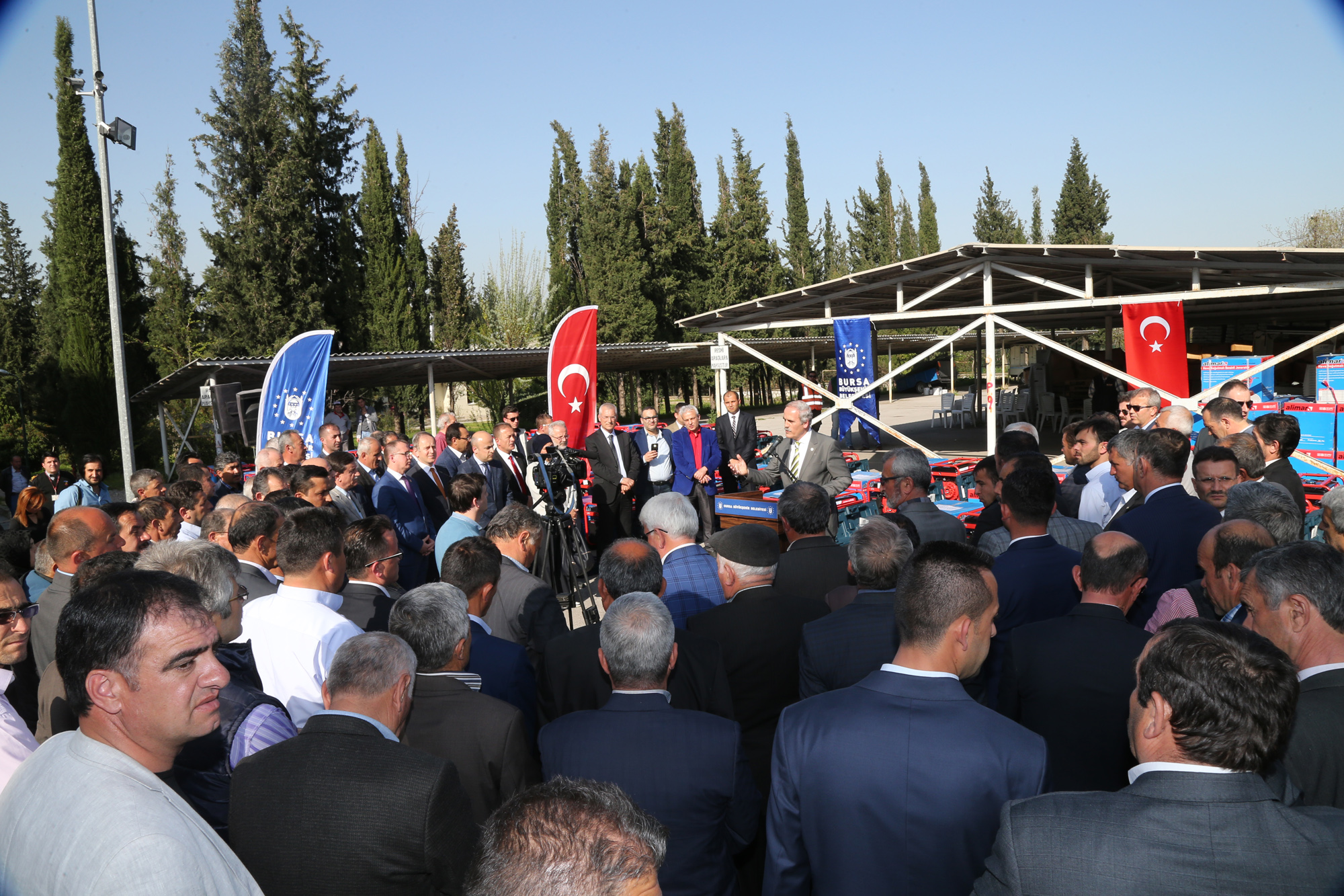 Büyükşehir Belediyesi’ne ait Arabayatağı Yerleşkesi’nde düzenlenen ekipman teslim töreninde konuşan Büyükşehir Belediye Başkanı Recep Altepe, verdikleri desteklerle kırsal kesimden Bursa merkeze olan göçü durdurmak istediklerini söyledi. 17 ilçenin tamamında, bölgelerin farklı özelliklerine göre üreticinin yanında olduklarını ifade eden Başkan Altepe, daha fazla üretim ve daha fazla gelişimi hedeflediklerini ifade etti. Konuşmasında ‘Bütünşehir’ uygulamasına değinen ve bugüne kadar yapılamayan yollar, alt yapı ve göletlerin bu yasa kapsamında sıfırdan ele alındığını vurgulayan Başkan Altepe, “Yenişehir’den İnegöl’e, sahil kesiminden Mustafakemalpaşa ve Karacabey’e kadar her bölgede farklı açılımlara giriyoruz. Hedefimiz hayatınızı kolaylaştırmak ve göçün önüne geçmek. Daha fazla üretim ve daha fazla satışla her geçen gün daha fazla mesafe alacağımıza inanıyorum” dedi.
