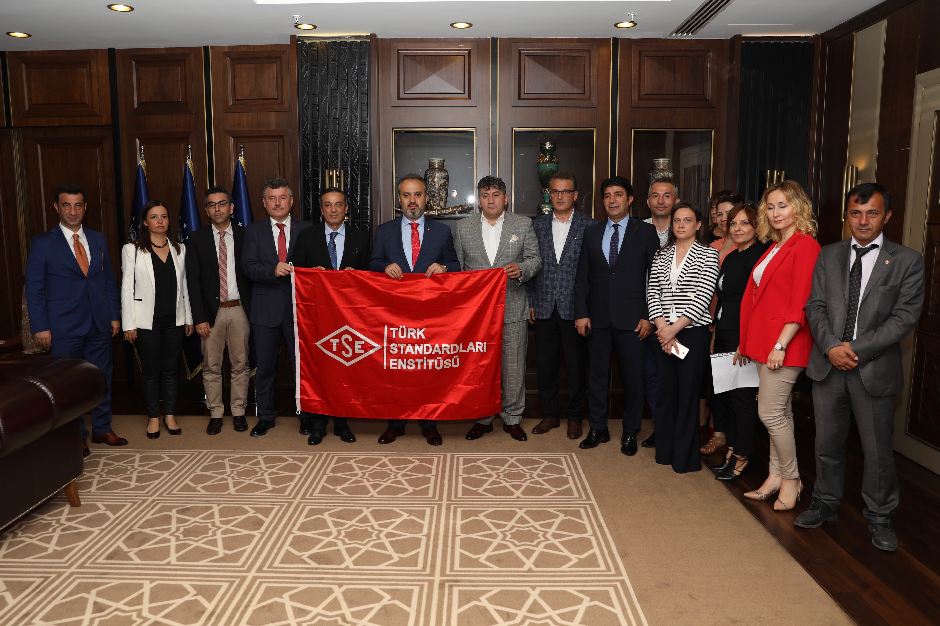 Başkan Aktaş, TSE Başkanı Adem Şahin ve beraberindeki heyeti ağırladı. Başkanlık makamında gerçekleşen görüşmede; Başkan Aktaş’a, ‘TS EN ISO 14001 Çevre Yönetim Sistemi’ belgesi ile TSE’yi simgeleyen bayrak takdim edildi. TSE Başkanı Şahin, ziyarette ayrıca Başkan Aktaş’a bir şilt verdi.