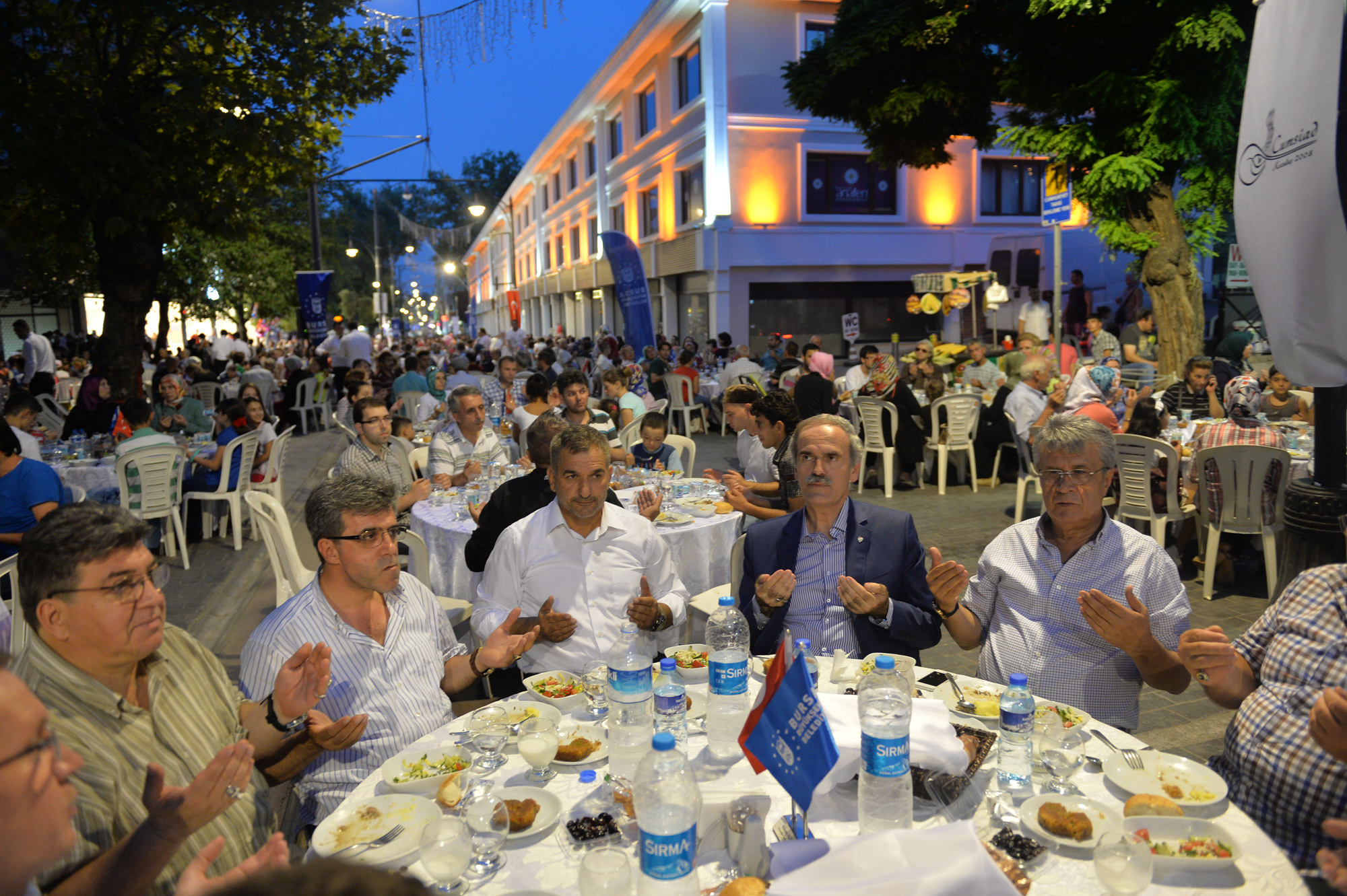 BURSA - Büyükşehir Belediyesi tarafından tramvay hattı ile trafiğe kapatılan ve cephe sağlıklaştırma çalışmalarıyla kentin vitrini haline gelen Cumhuriyet Caddesi’nde düzenlenen ve 300 garsonun görev aldığı iftar etkinliği, beş yıldızlı otel konforunda gerçekleşti. Büyükşehir Belediyesi’nin Cumhuriyet Caddesi Sanayici ve İşadamları Derneği işbirliğiyle düzenlendiği iftar organizasyonunda cadde esnafı ve vatandaşlardan oluşan yaklaşık 4 bin kişi, son oruçlarını birlik ve beraberlik içinde açtı.