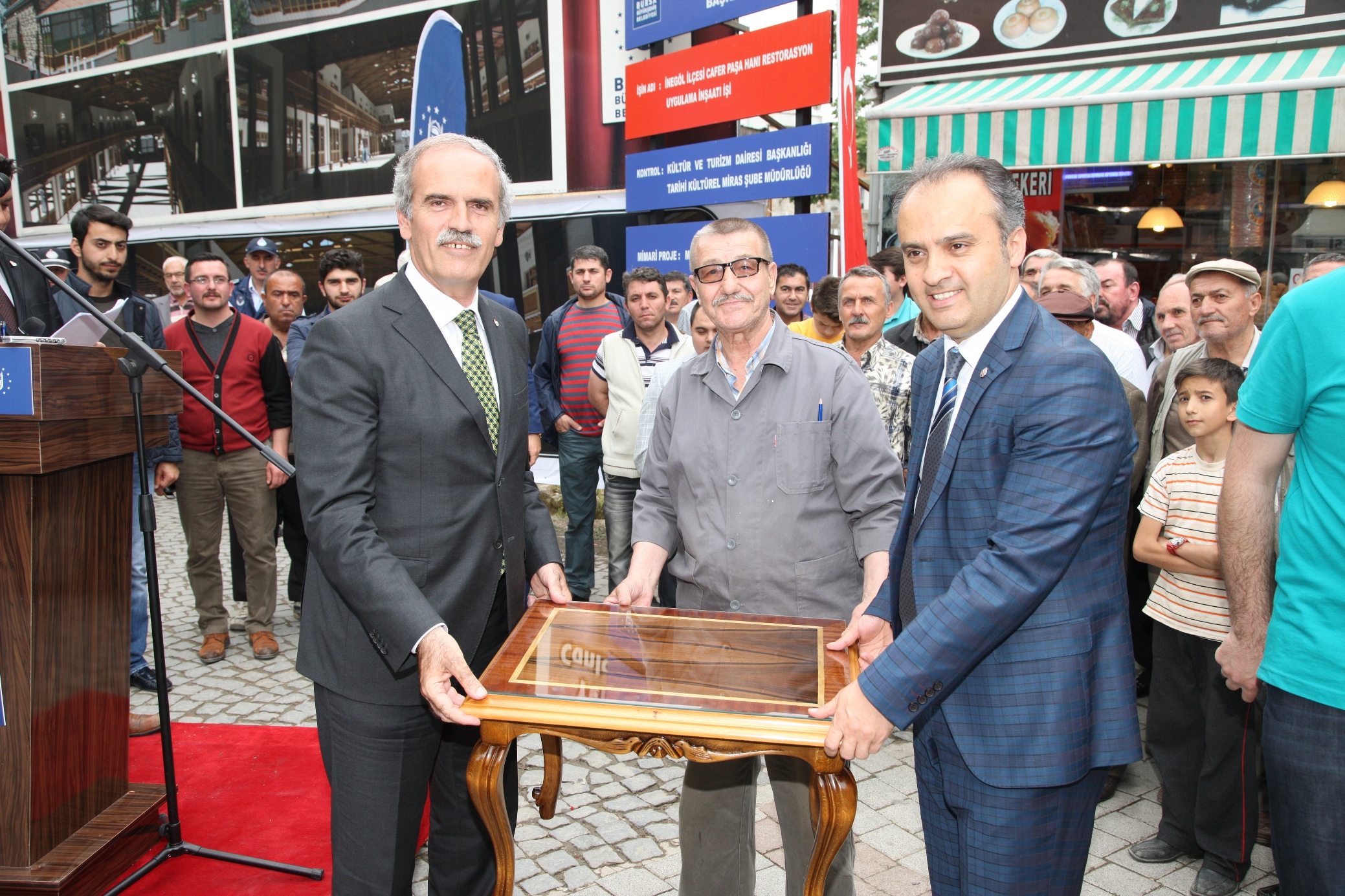Günün anısına İnegöl Belediye Başkanı Alinur Aktaş, Başkan Altepe’ye el işi oyma sehpa hediye etti. Başkan Altepe, Milletvekili Hüseyin Şahin ve İlçe Belediye Başkanı Alinur Aktaş, restorasyon çalışmalarını başlattı.