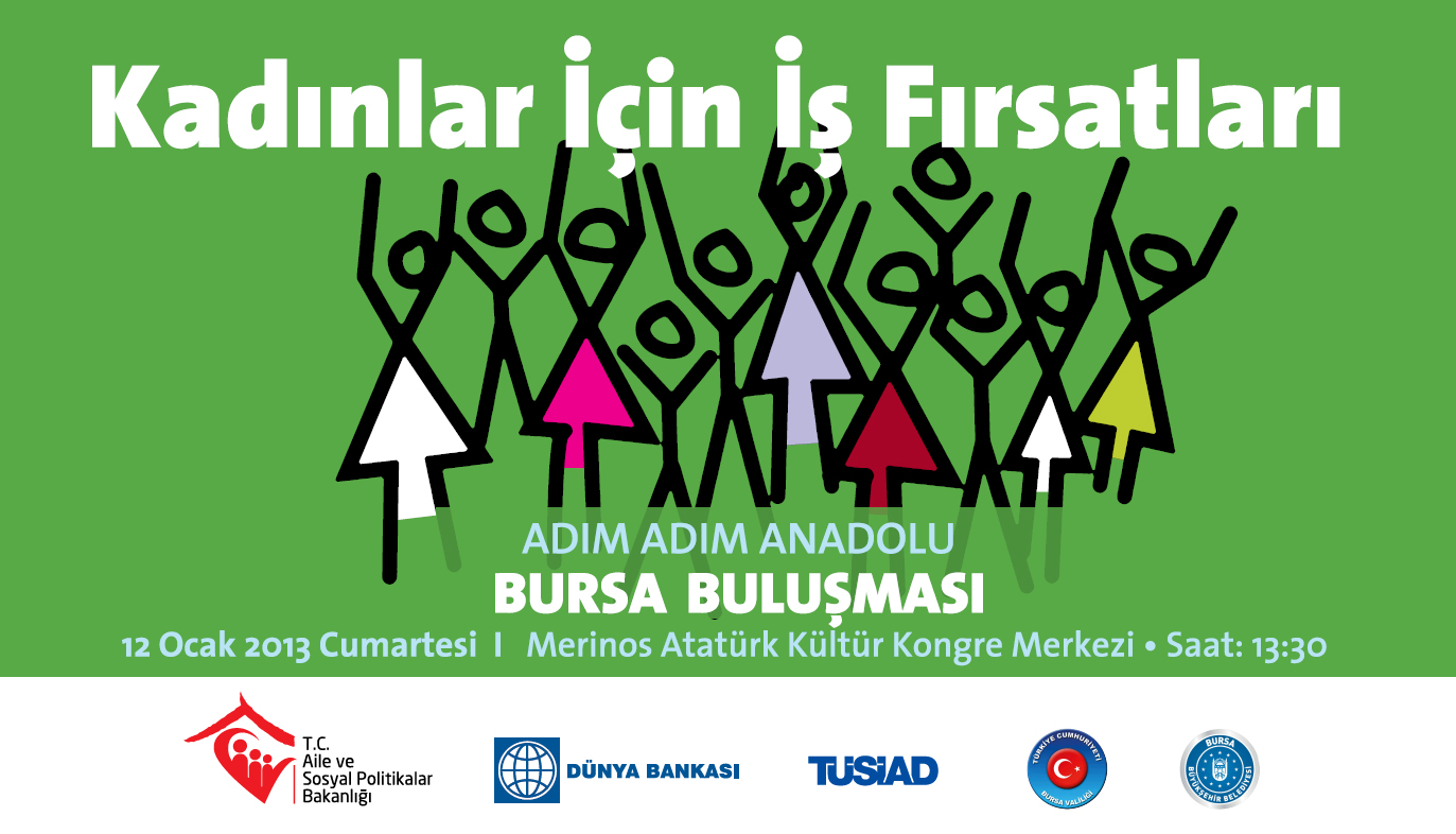 Aile ve Sosyal Politikalar Bakanlığı, Dünya Bankası ve TÜSİAD işbirliğiyle Bursa Valiliği ve Bursa Büyükşehir Belediyesi’nin katkılarıyla düzenlenen ‘Kadınlar için iş fırsatları’ konulu Adım Adım Anadolu Bursa Buluşması, 12 Ocak Cumartesi günü Merinos AKKM Orhangazi Salonu’nda yapılacak.