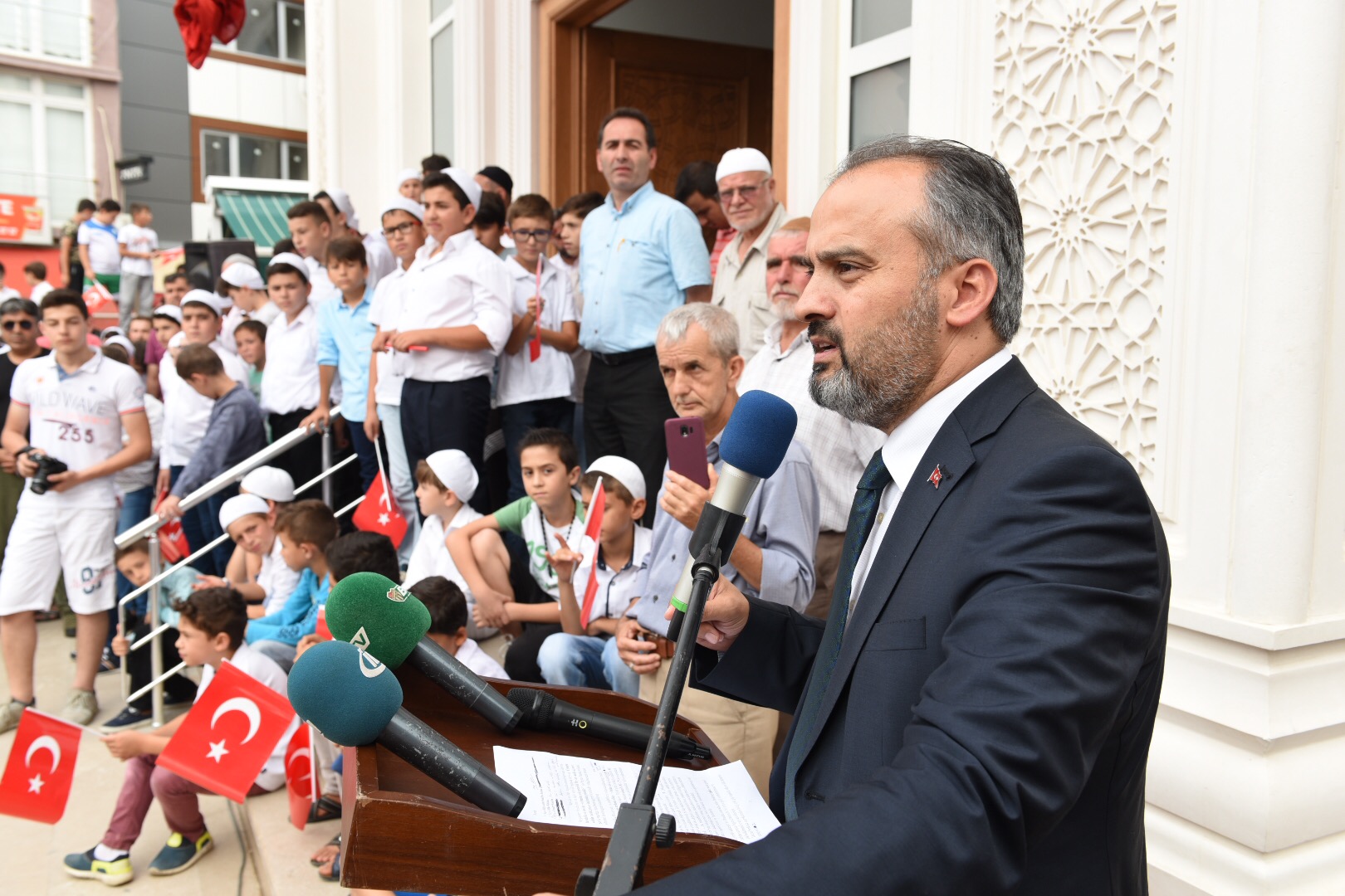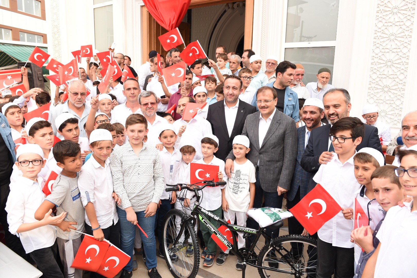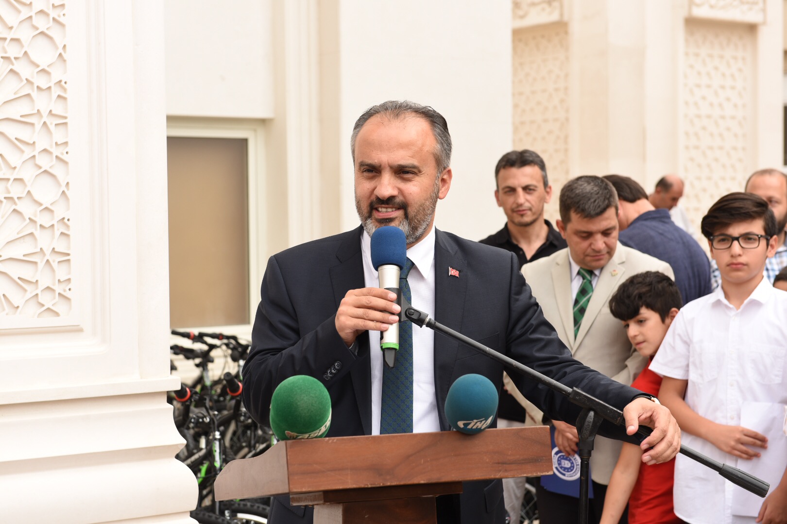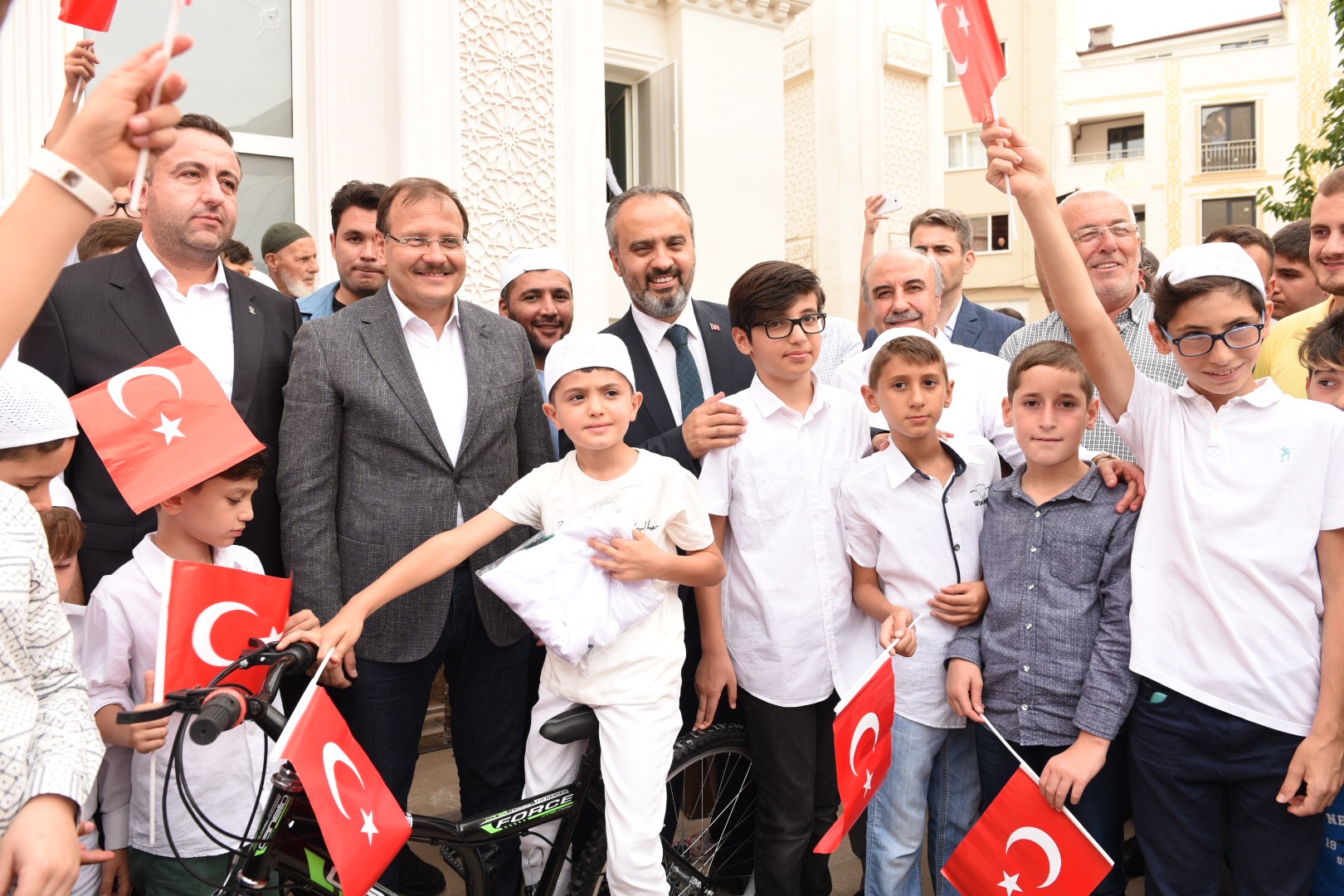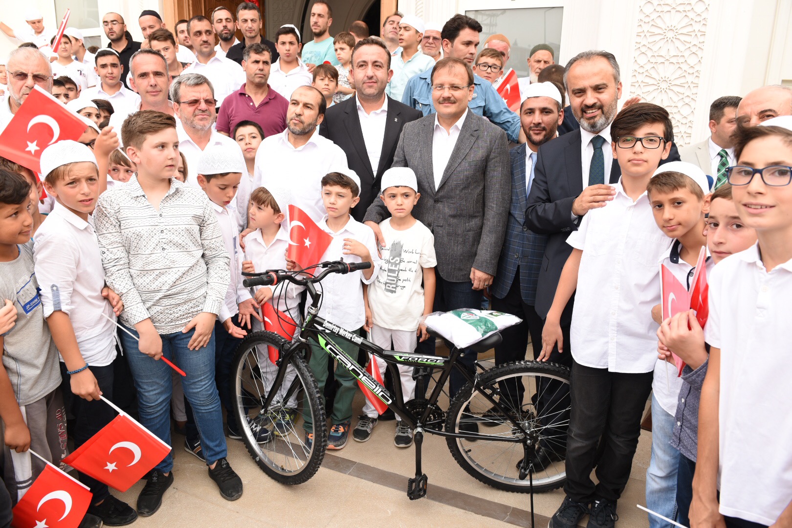 Konuşmaların ardından 30 gün boyunca camiye gelen 150 çocuk, hediyelerini Büyükşehir Belediye Başkanı Alinur Aktaş ve TBMM İnsan Hakları Komisyonu Başkanı ve Bursa Milletvekili Hakan Çavuşoğlu’nun elinden aldı.