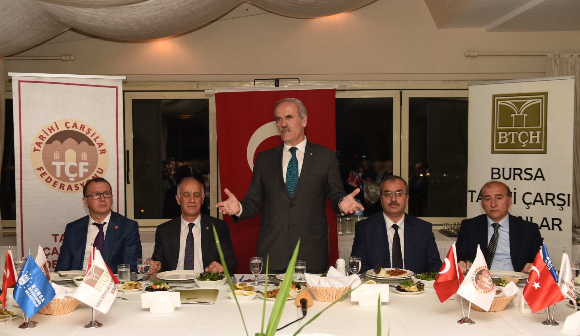 Tarihi Çarşılar Federasyonu Başkanı Muhsin Özyıldırım da çarşı dernekleri yönetimlerinin bir araya gelmek suretiyle 2008 yılında Tarihi Çarşı Hanlar Birliği Patformunu kurduklarını ve bugün Türkiye’ye örnek bir cemiyet haline geldiklerini belirtti. Tarihi çarşıların müşterek sorunlarının merkezi hükümet düzeyinde çözümü noktasında federasyon çatı altında birleşmenin sağlandığını ifade eden Özyıldırım, “Biz derneğin merkezinin İstanbul olacağını düşünüyorduk. Ancak dediler ki; ‘siz Bursa olarak çok hazırlıklısınız. Büyükşehir Belediyesi her zaman yanınızda. Merkez Bursa olmalı’. Merkez Bursa olunca Bursa’ya yakışan bir ofis bulmamız gerekliydi bu ofisinde çarşıya yakın olması gerekti. Sağ olsun her zaman olduğu gibi başkanımız desteğini esirgemedi ve tarihi belediye binasında bize ofis tahsis etti. Kendisine tüm çarşı esnafı adına teşekkür ediyorum” dedi.