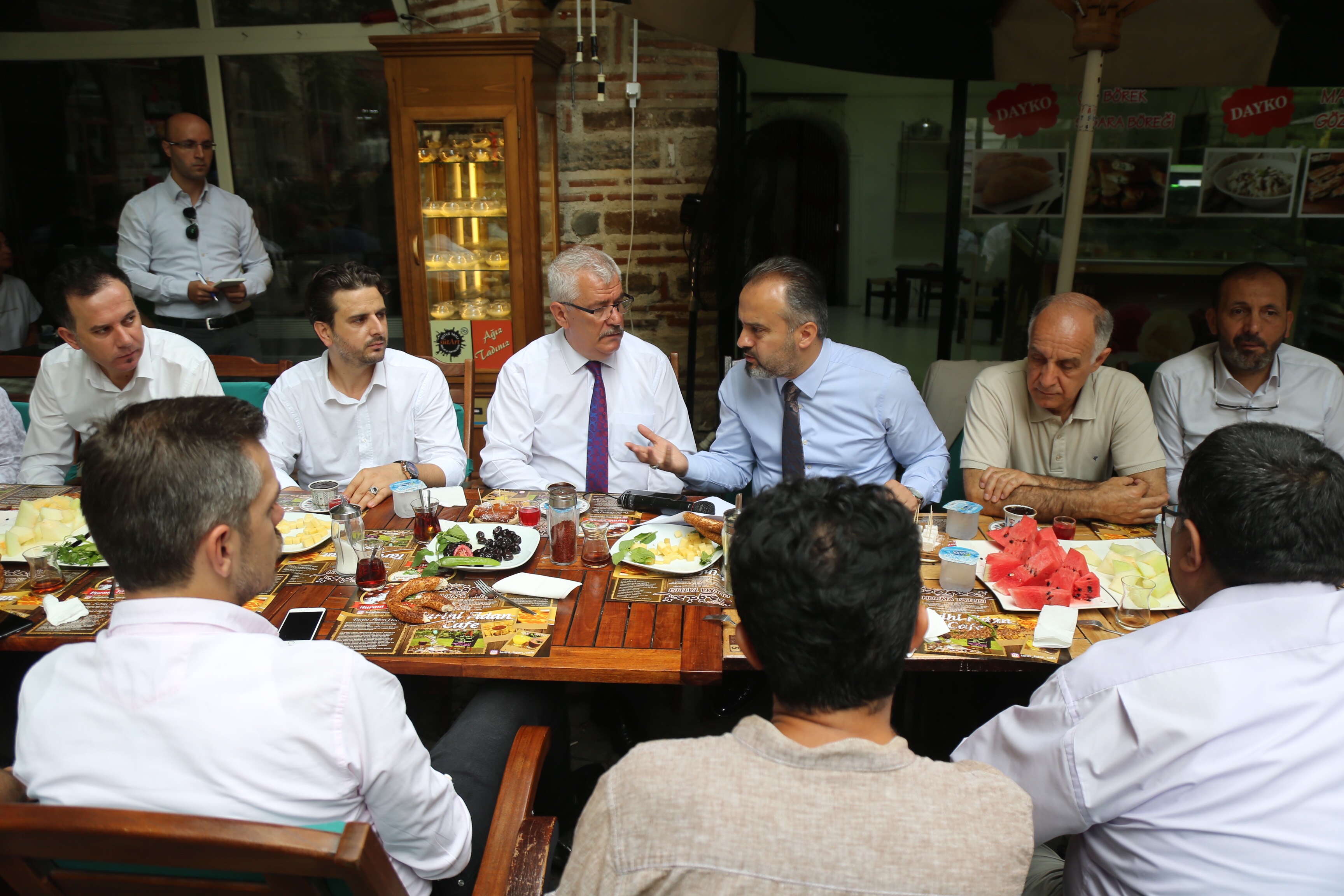 BURSA - Bursa'nın sosyal, ticari ve insani ilişkilerinin en yoğun yaşandığı Tarihi Çarşı ve Hanlar Bölgesi'nde esnaf dernekleri temsilcileriyle bir araya gelen Büyükşehir Belediye Başkanı Alinur Aktaş, fiziki iyileştirmelerin yanında tarihi çarşılar bölgesinin ülke ve dünya genelinde iyi tanıtılması gerektiğini söyledi.