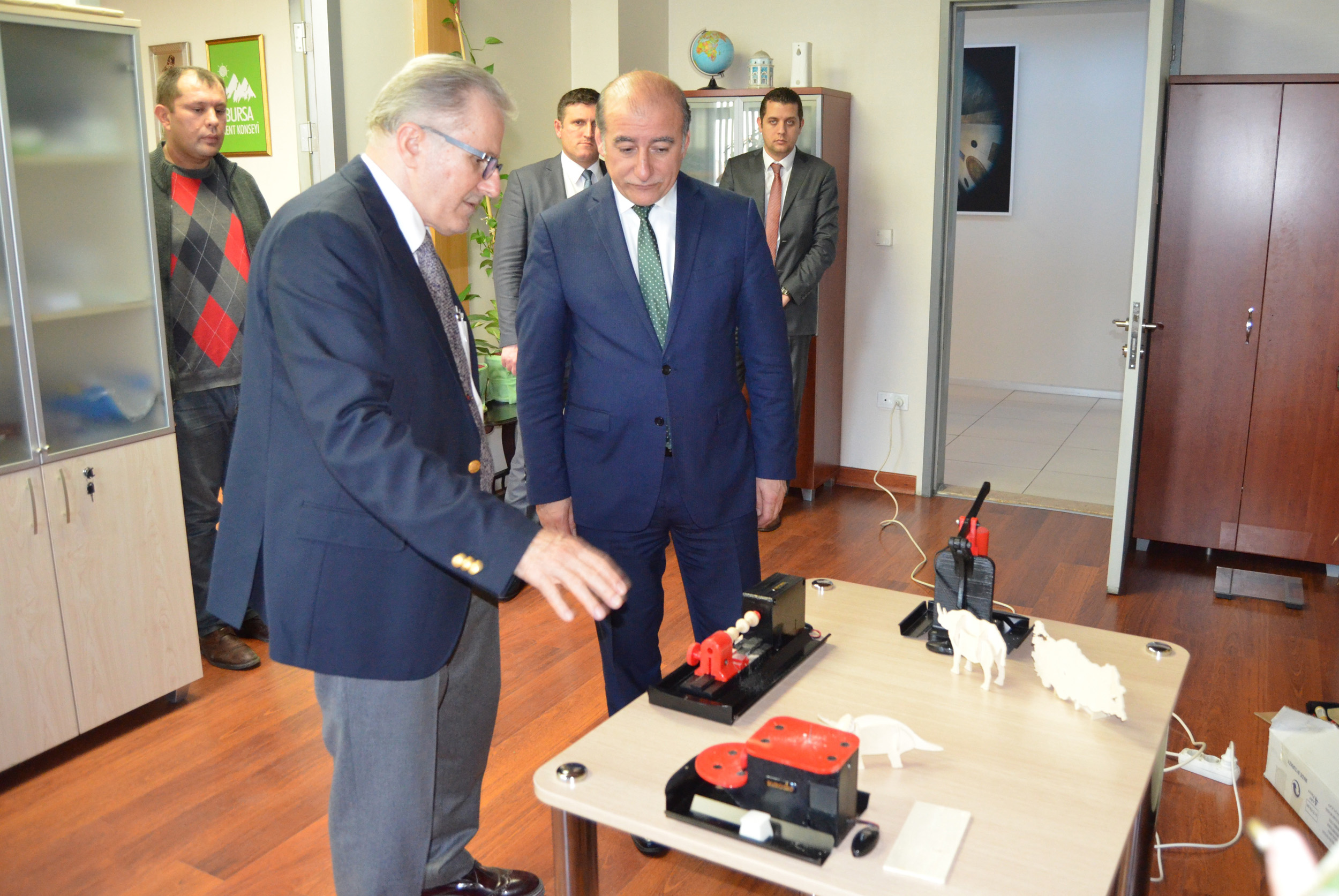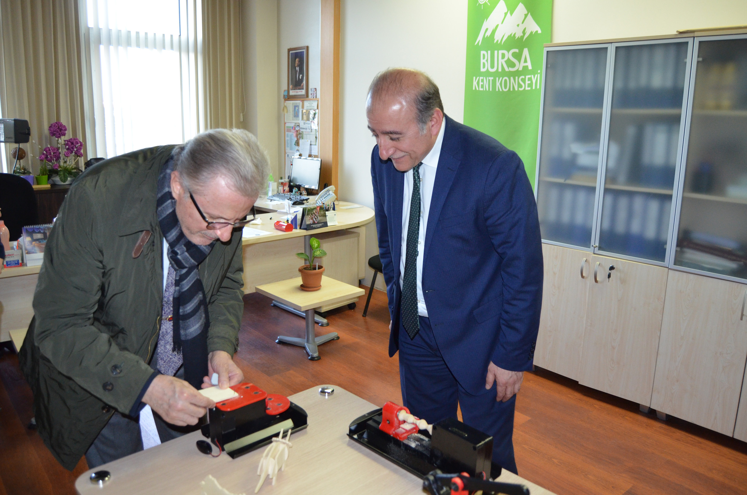 BUTGEM Yönetim Kurulu Başkan Yardımcısı Fahrettin Gülener, Büyükşehir Belediyesi Yerel Gündem Şube Müdürü Mahmut Turunç’unda hazır bulunduğu ziyarette Bursa Kent Konseyi Başkanı Hasan Çepni’ye kendi geliştirerek 9-12 yaş öğrenciler için hazırladığı prototip eğitim seti hakkında bilgiler verdi. Türkiye’de ilk defa ilkokul düzeyindeki öğrenciler için prototip eğitim seti geliştirdiklerini ifade eden Gülener, setin bir masa üzerine monte edilmiş olan matkap, minyatür torna, testere ve zımpara makinesinden oluştuğunu söyledi. Eğitim setinin 12 volt ile çalıştığını anlatan Gülener, minyatür aletlerin öğrencilere zarar vermeyecek şekilde tasarlandığı dile getirdi. Prototip makinesinin parçalarının yerli olarak üretildiğini ifade eden Gülener, “Eğitim setinin tasarımı Bürosit’te yapıldı. Bu çalışma bizler için bir sosyal sorumluluk projesi niteliğinde. Bu prototipi kendimiz üretiyoruz. Milli Eğitim Müdürlüğü ile gerçekleştirdiğimiz protokol kapsamında yıl sonuna kadar 50 okula, 6’şar adet prototip eğitim seti kuracağız. Çocuklarımızın bilgisayarın içindeki şeytanlığı öğrenene kadar makinenin yapım aşamalarını öğrensin istiyoruz. Bu eğitim setinin ucu bu makineleri yapmaya çıkıyor. Geleceğin mühendisleri şimdiden yetişmeli. Bu projenin yaygınlaştırılması konusunda Bursa Kent Konseyi’nin desteklerini bekliyoruz” dedi.
