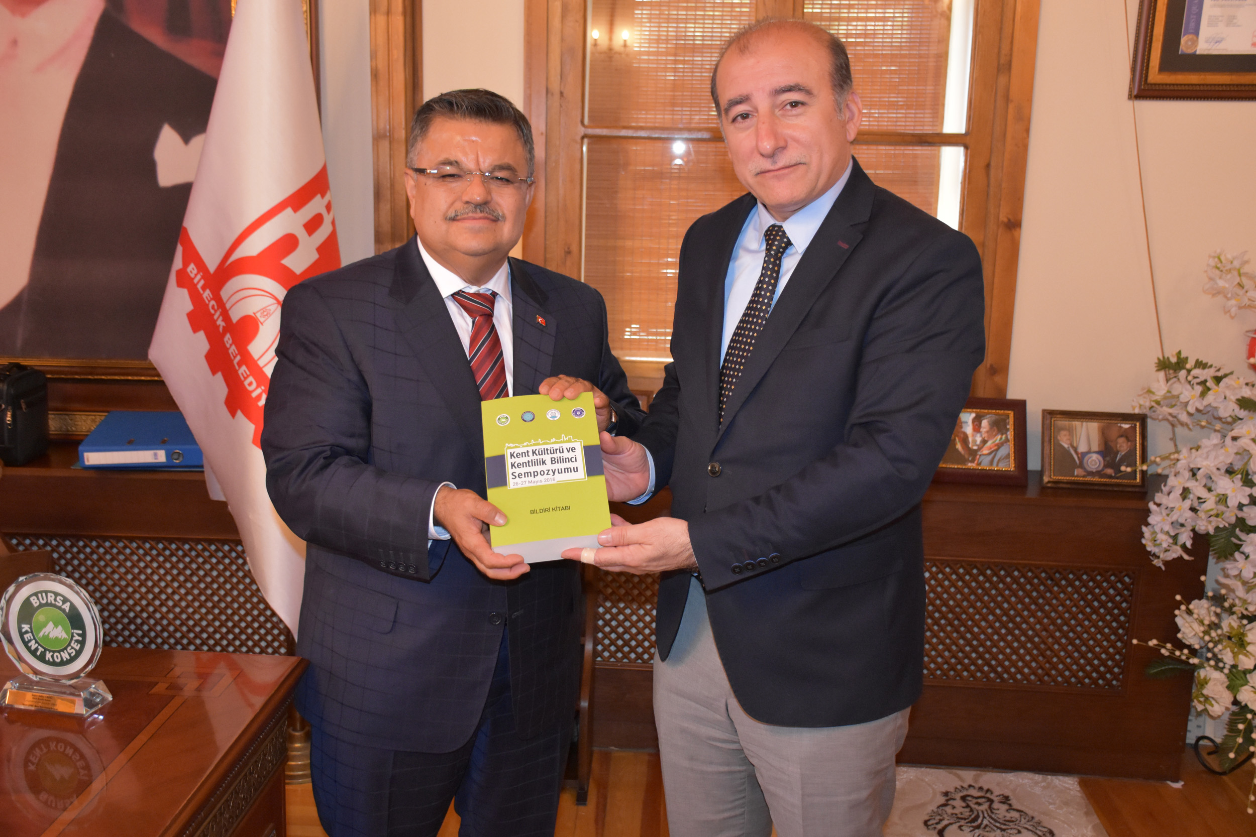 Ziyaretlerin sonunda Bursa Kent Konseyi Başkanı Hasan Çepni, Bilecik Belediye Başkanı Selim Yağcı’ya Kent Kültürü ve Kentlilik Bilinci Sempozyumu Bildiri Kitabı’nı hediye etti.
