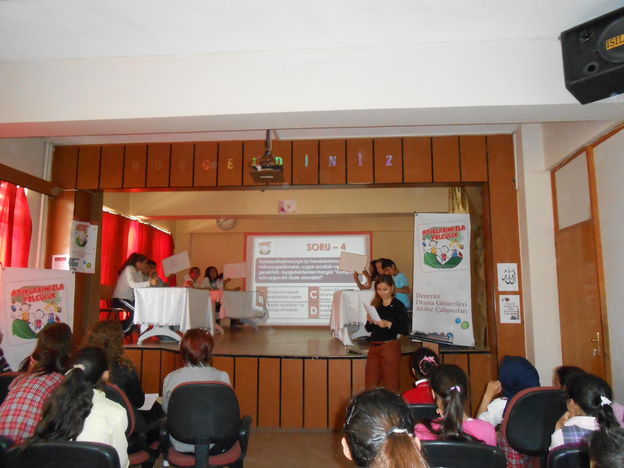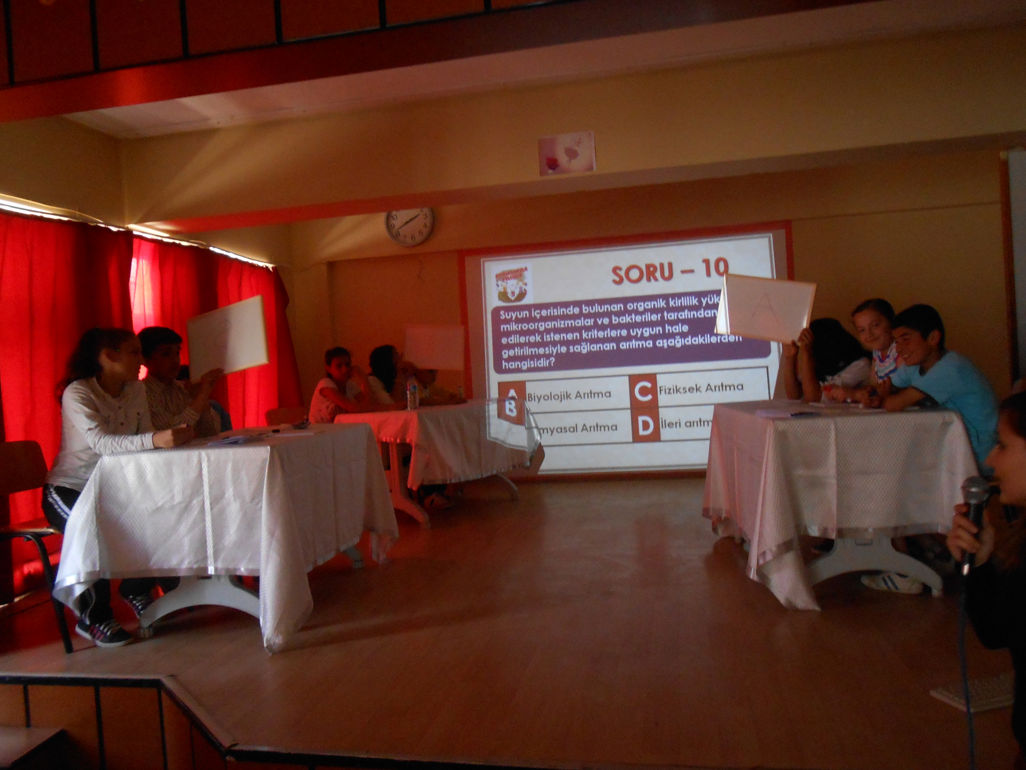 Öğrencilerin etkinlikler kapsamında öğrendikleri bilgilerin pekiştirilmesi ve projenin etkilerinin yaygınlaştırılması amacıyla İnönü Ortaokulu Salonunda ‘Atıklarımızla Yolculuk Bilgi Yarışması’ düzenlendi. Bilgi yarışmasına proje kapsamına dahil olan 3 gruptan seçilen 3’er öğrenci katılım sağladı. Öğrencilerin kıyasıya mücadele ettiği bilgi yarışmasında; arıtma tesisleri, katı atıkların bertarafı, arıtma teknolojileri, geri kazanım, tehlikeli atıklar konularında sorulan sorulara verilen cevaplar, proje etkinliklerinin öğrencilerin çevre bilincinin gelişmesine ve çevresel kavramlarla tanışmalarına katkı sağladığının en önemli göstergesi oldu.