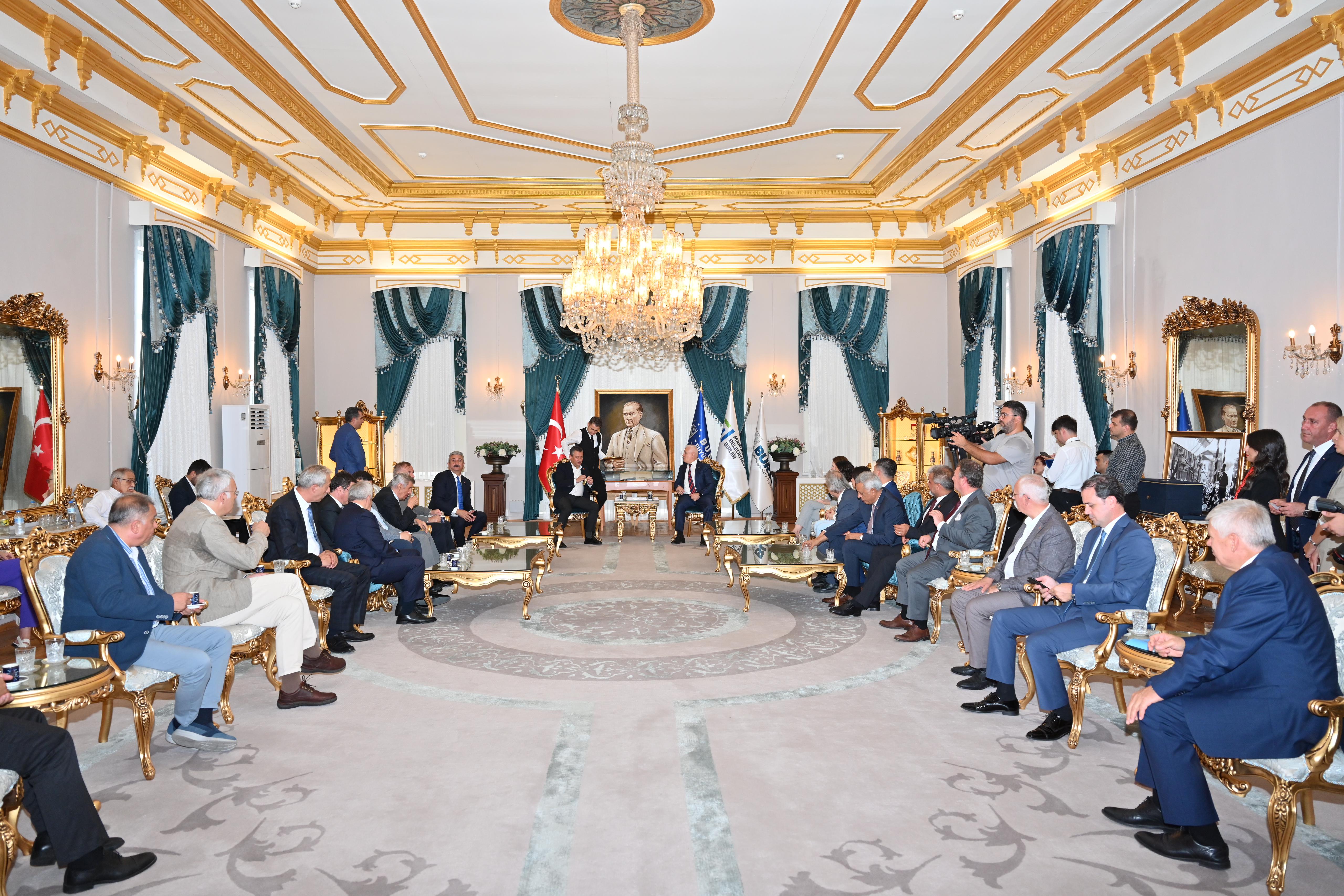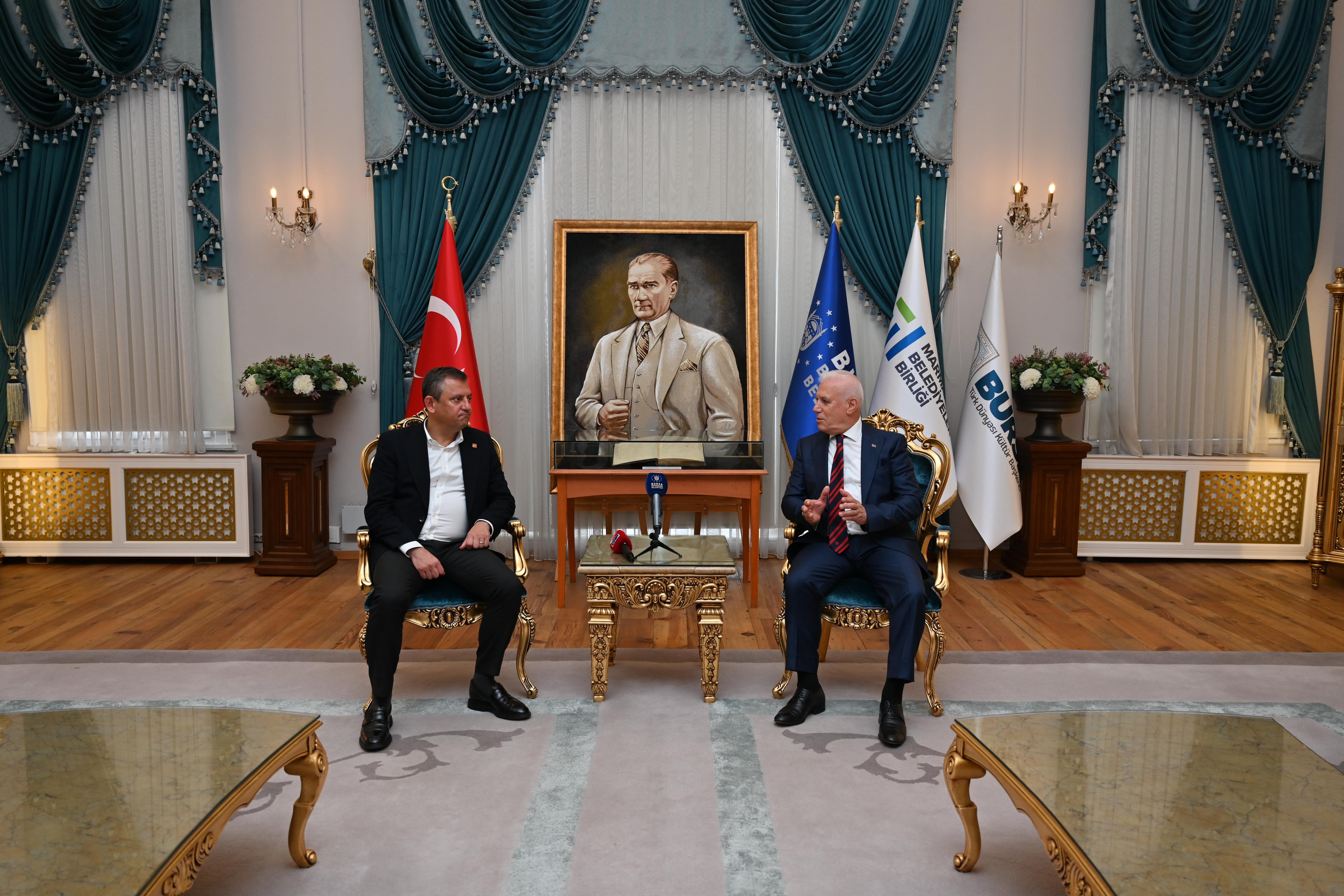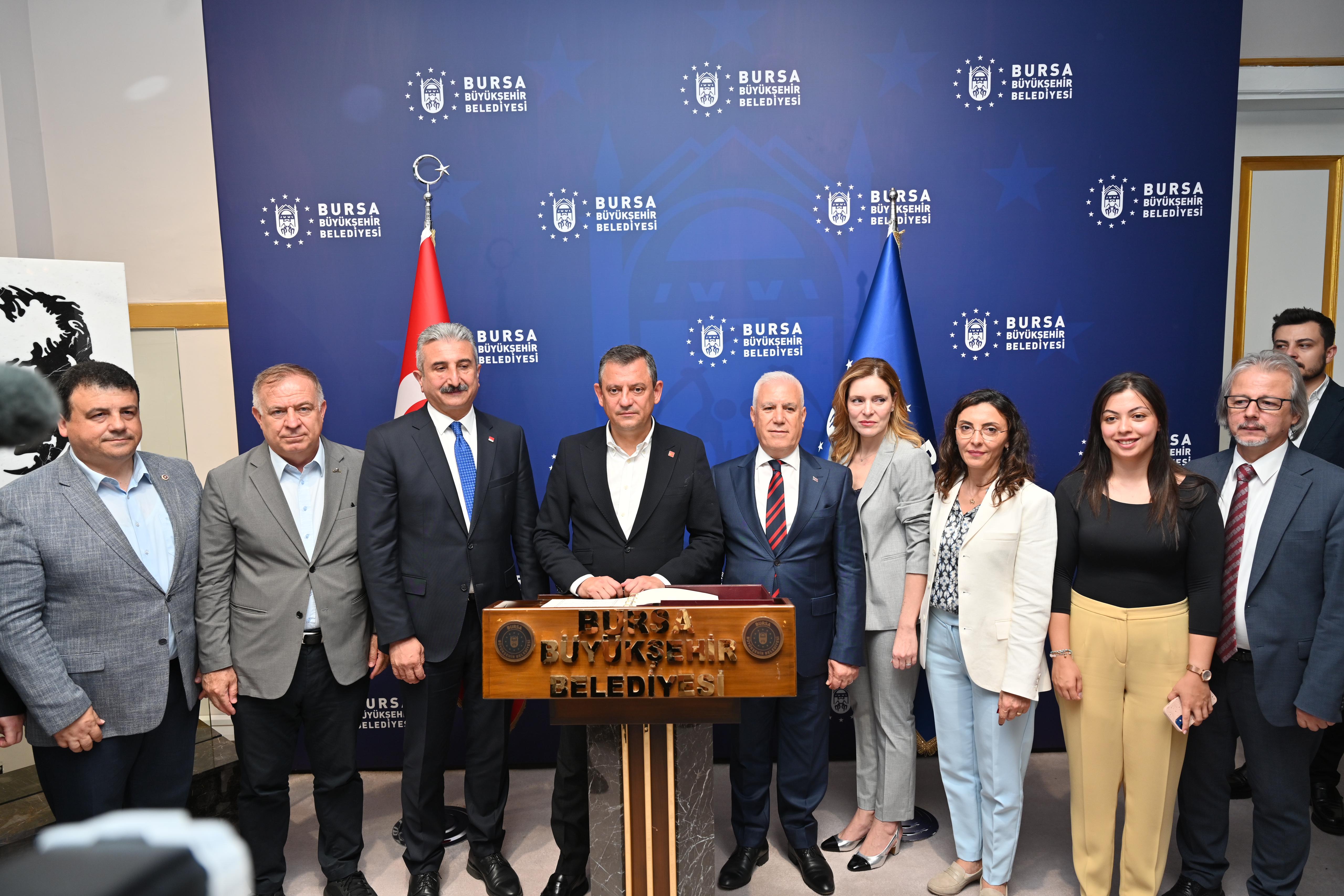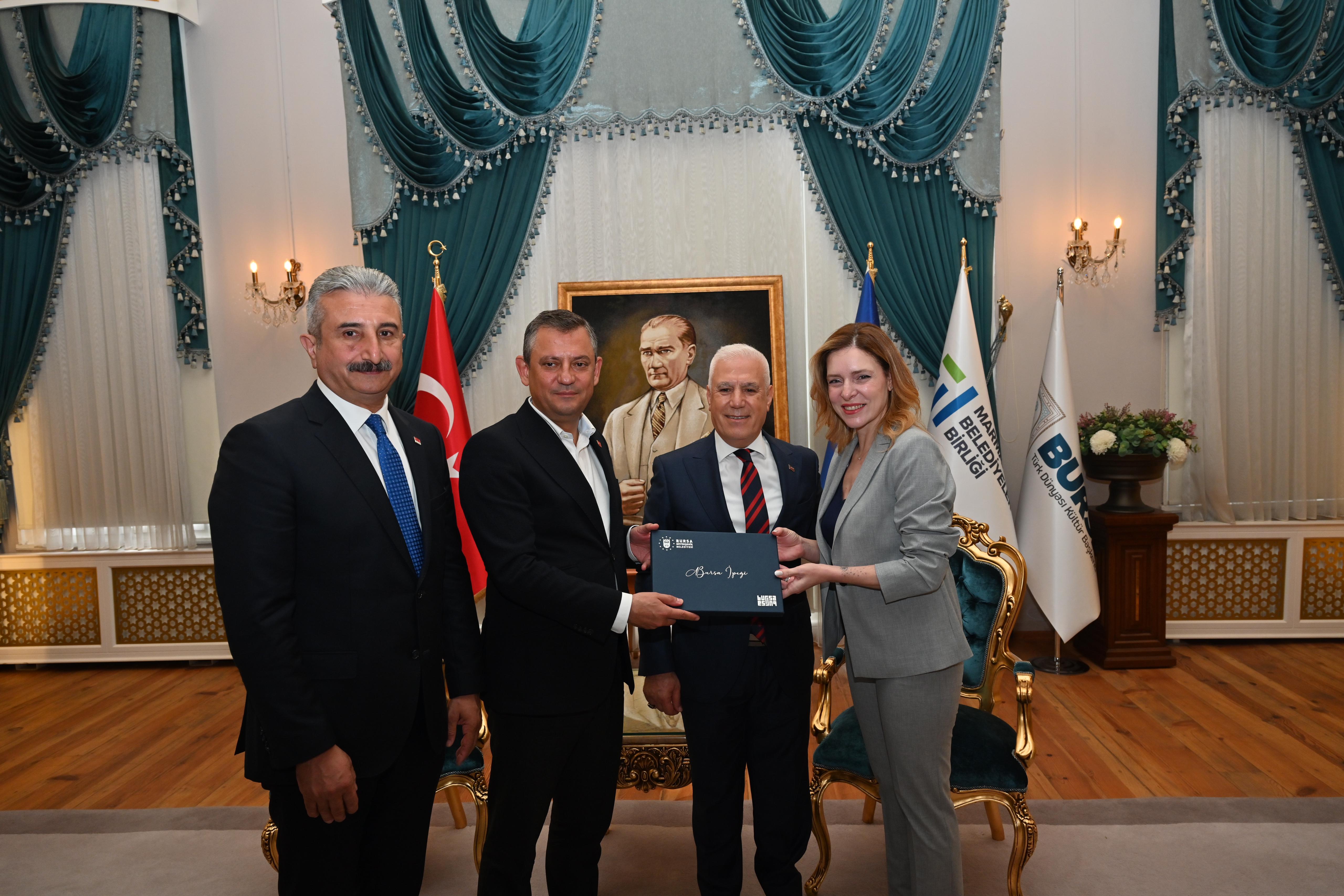 Bursa’da ve Tarihi Belediye Binası’nda CHP Genel Başkanı Özgür Özel’i ağırlamaktan büyük memnuniyet duyduklarını söyleyen Büyükşehir Belediye Başkanı Mustafa Bozbey, “Daha önce bu tarihi binada Büyükşehir Belediye Meclis’leri düzenleniyordu. Daha sonra restorasyon çalışmaları yapıldı. Şimdi misafirlerimizi ağırlıyoruz. Önderimiz Gazi Mustafa Kemal Atatürk de bu salonda zeybek oynadı. Bu açıdan da binamız ayrıca önem taşıyor. Tekrar hoş geldiniz” diye konuştu.