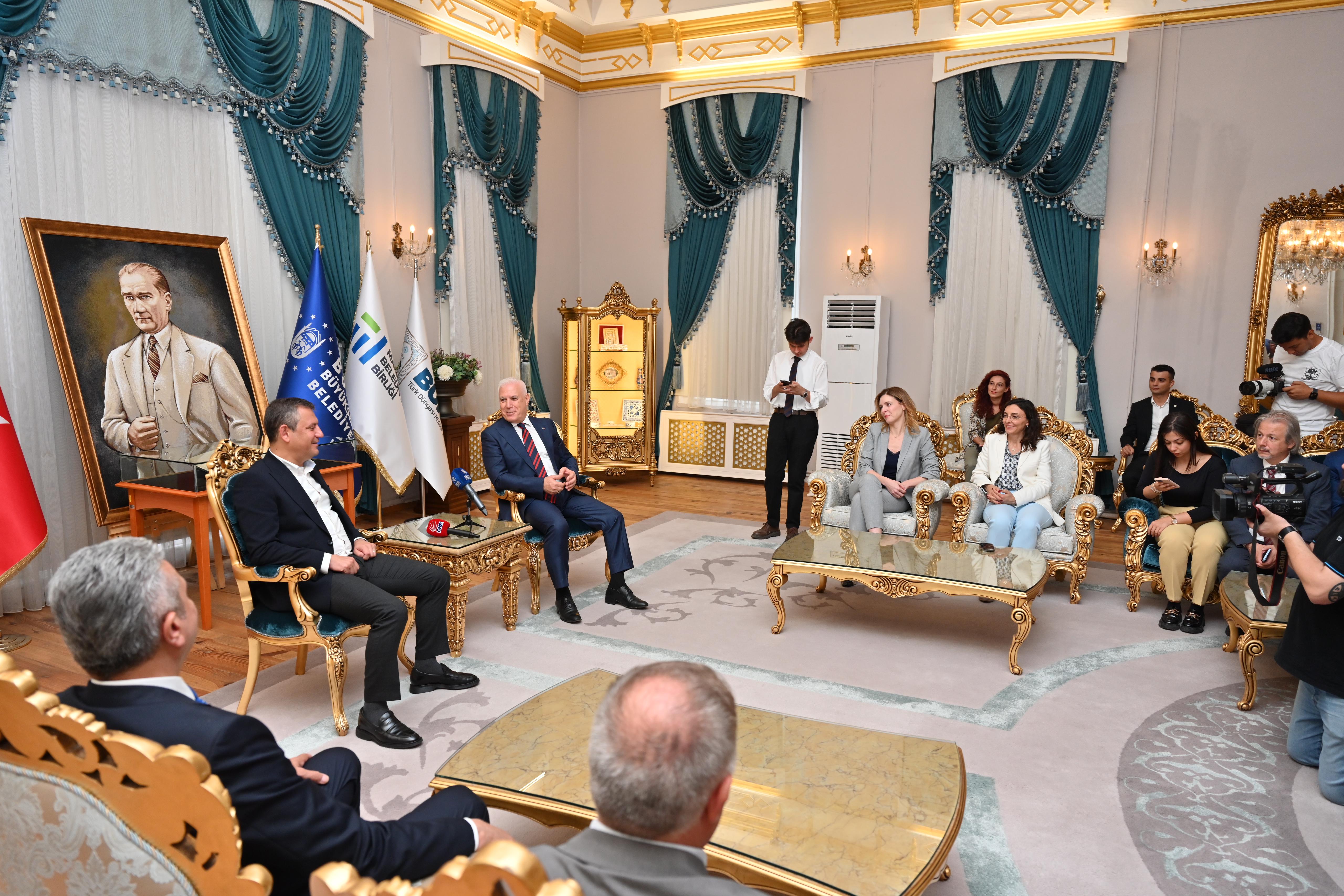 BURSA – Cumhuriyet Halk Partisi (CHP) Genel Başkanı Özgür Özel, Bursa Büyükşehir Belediye Başkanı Mustafa Bozbey’i Tarihi Belediye Binası’nda ziyaret etti. Mustafa Bozbey’in Bursa’daki başarısının efsane hizmetlerinin il genelinde de talep edildiğini gösterdiğini söyleyen Özel, “Mustafa Bozbey, 100 güne çok önemli hizmetler sığdırdı. Bu işleri katılımcılık anlayışıyla yapmasını takdir ediyorum” dedi.