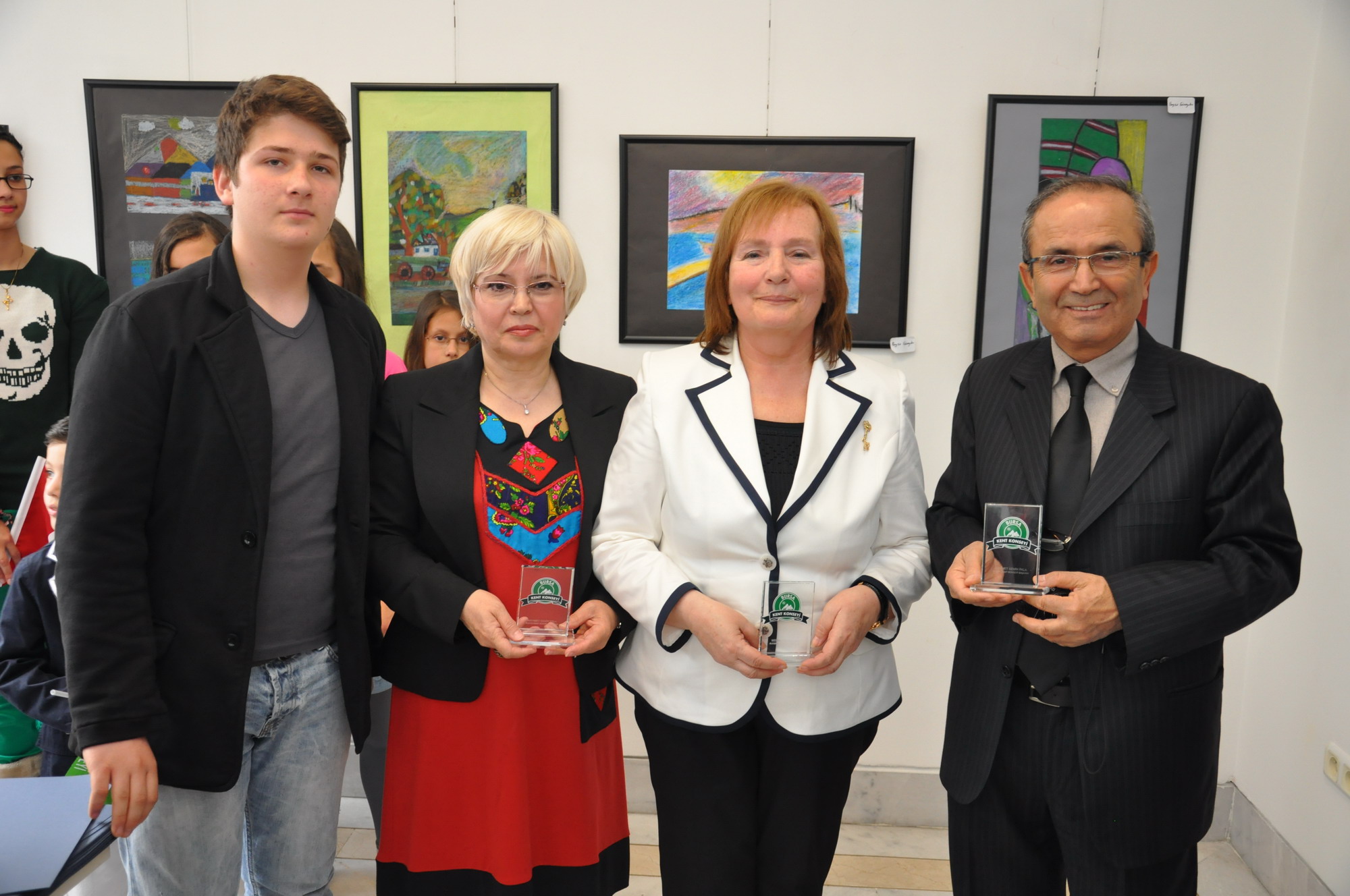 Konuşmaların ardından sergide resmi yer alan çocuklara belgeleri, gönüllü eğitmelere de plaketleri verildi.